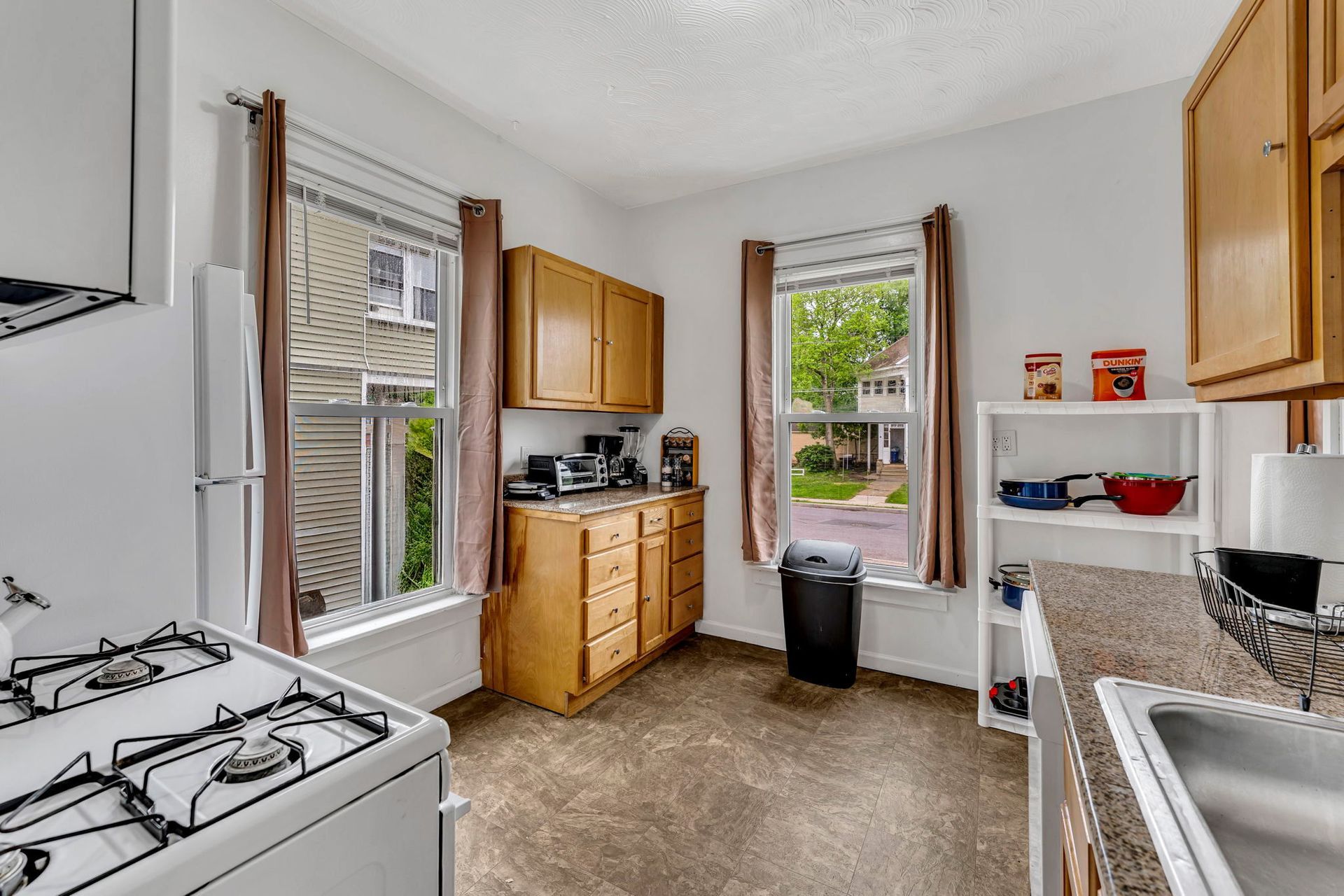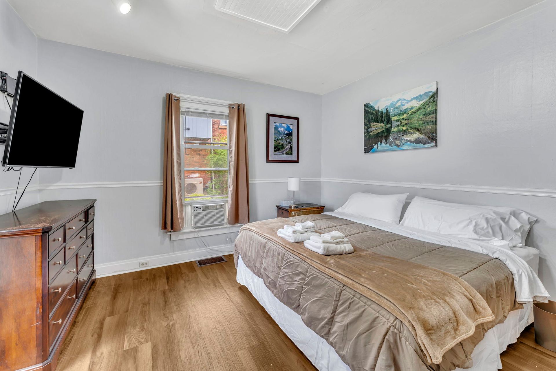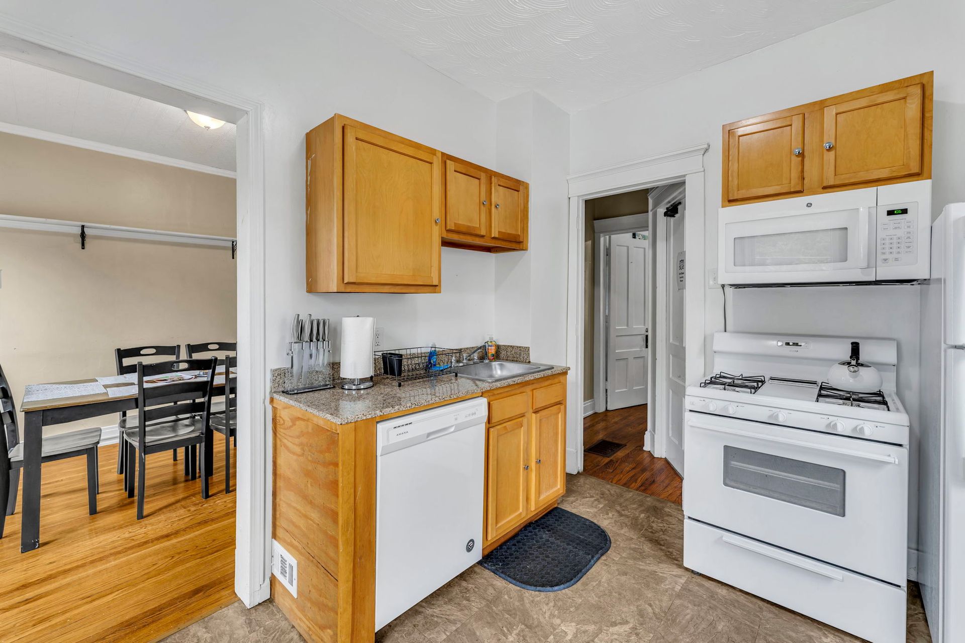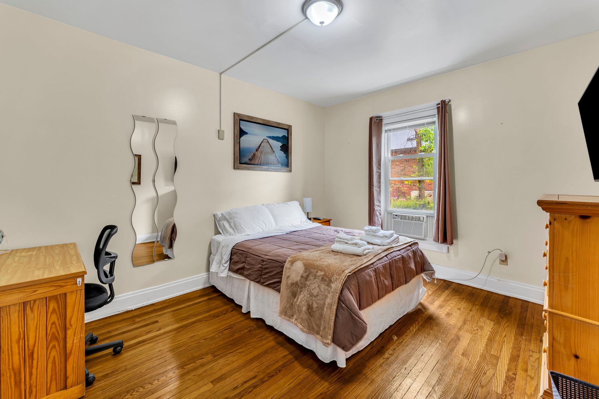 This first floor three bedroom apartment features a large kitchen with an abundance of cabinets and a microwave. There is a separate dining room with a table and chairs. The spacious living room has two couches, coffee and end tables, entertainment center and a 40"-50" flat screen TV! There is a full bathroom with a combination tub and shower. The washer and dryer are located in the basement. The three nicely sized bedrooms all have newer furniture including a 32"-50" TV, dresser, desk, office chair, nightstand, with a king and two queen size beds (mattress/box spring/frame).