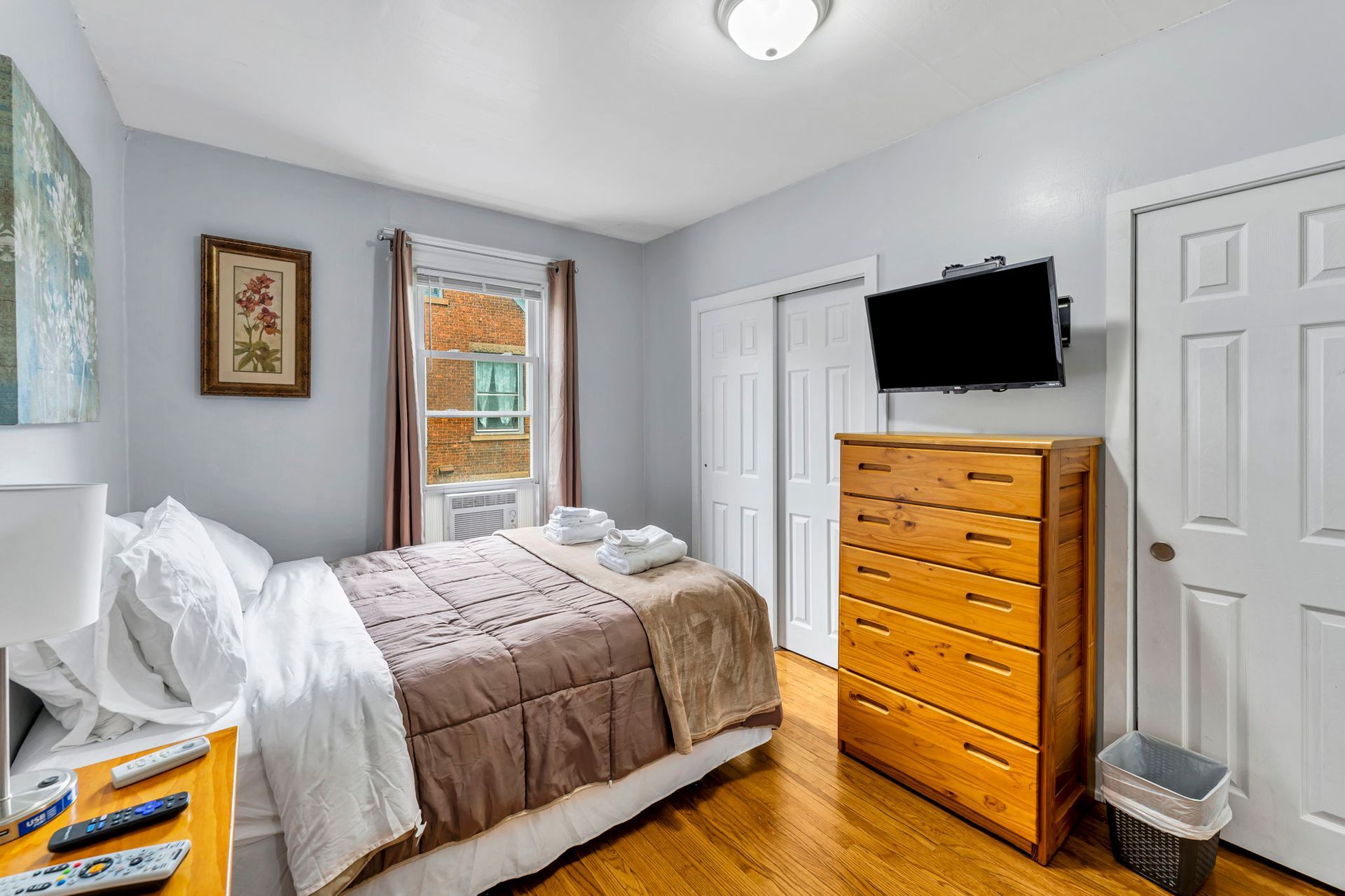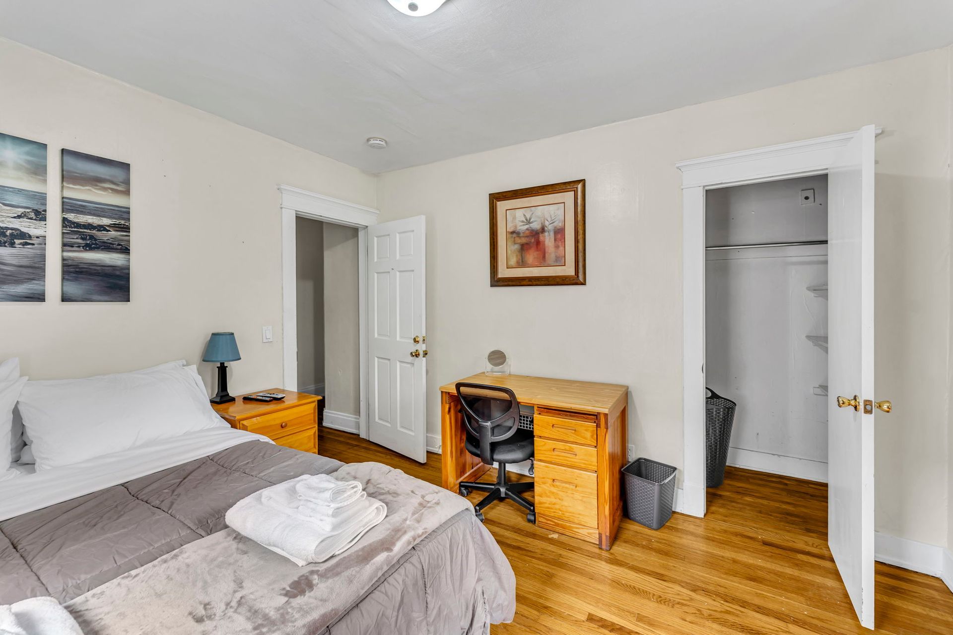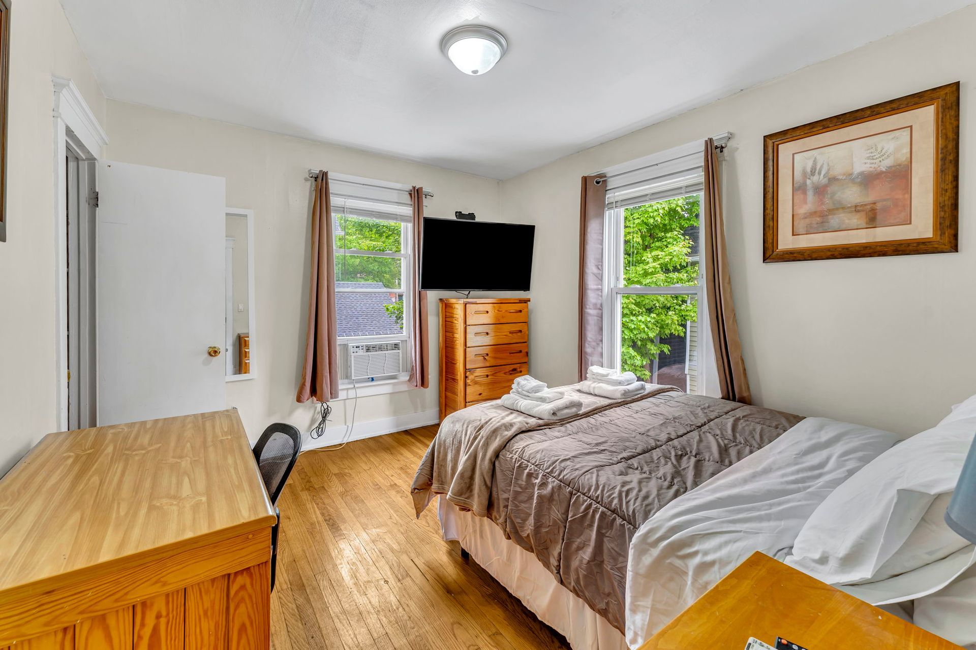 The second floor three bedroom apartment features a large kitchen with an abundance of cabinets, granite countertops, stainless steel appliances including a dishwasher and microwave. There is a separate dining room with a table and chairs. The spacious living room has two couches, coffee and end tables, entertainment center, and a 40"-50" flat screen TV! There is a full bathroom with a combination tub and shower. The washer and dryer is located in the bathroom. The three nicely sized bedrooms all have newer furniture including a 32"-50" TV, dresser, desk, office chair, nightstand, with a king and two queen size beds (mattress/box spring/frame).