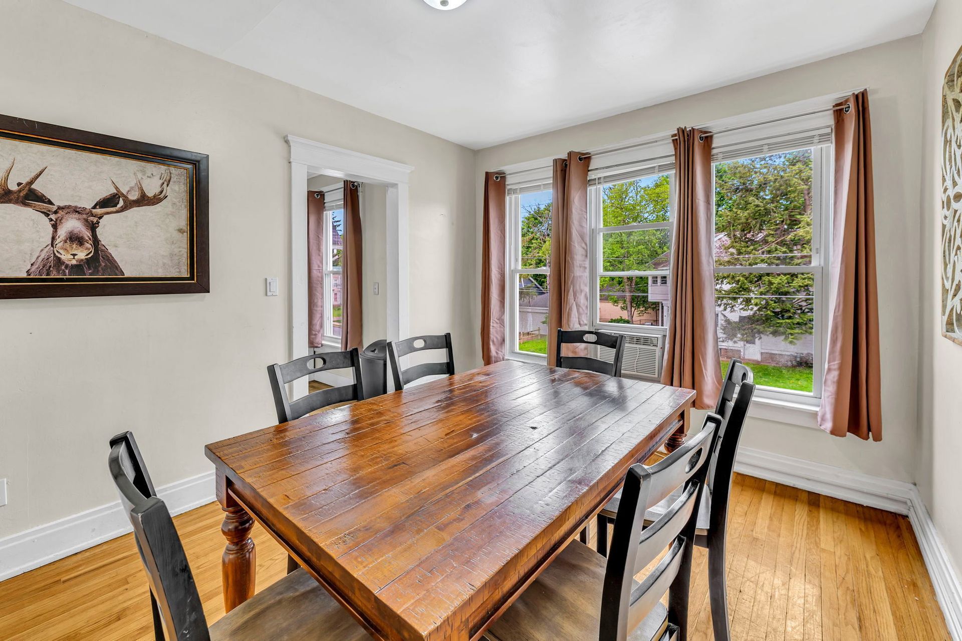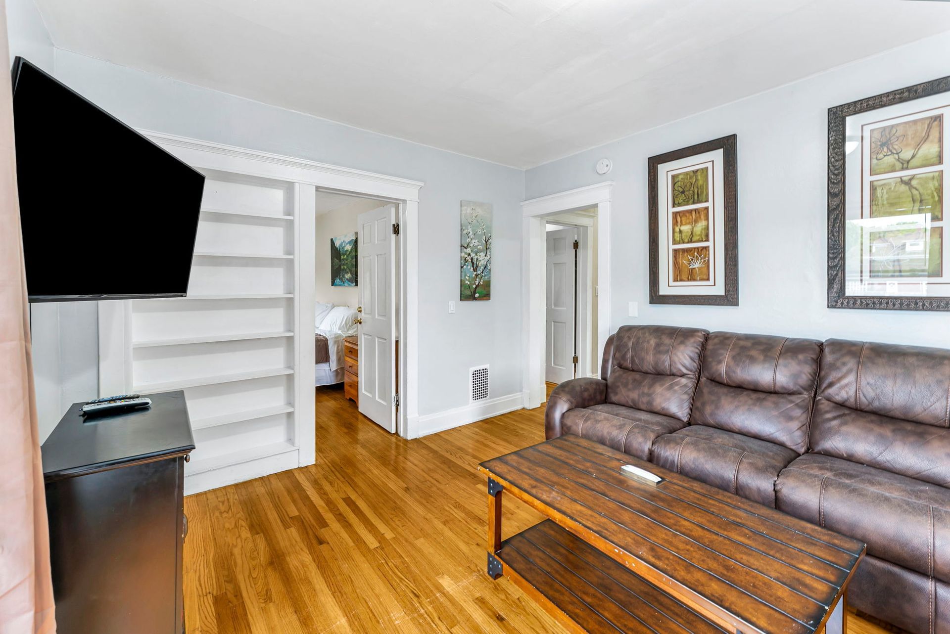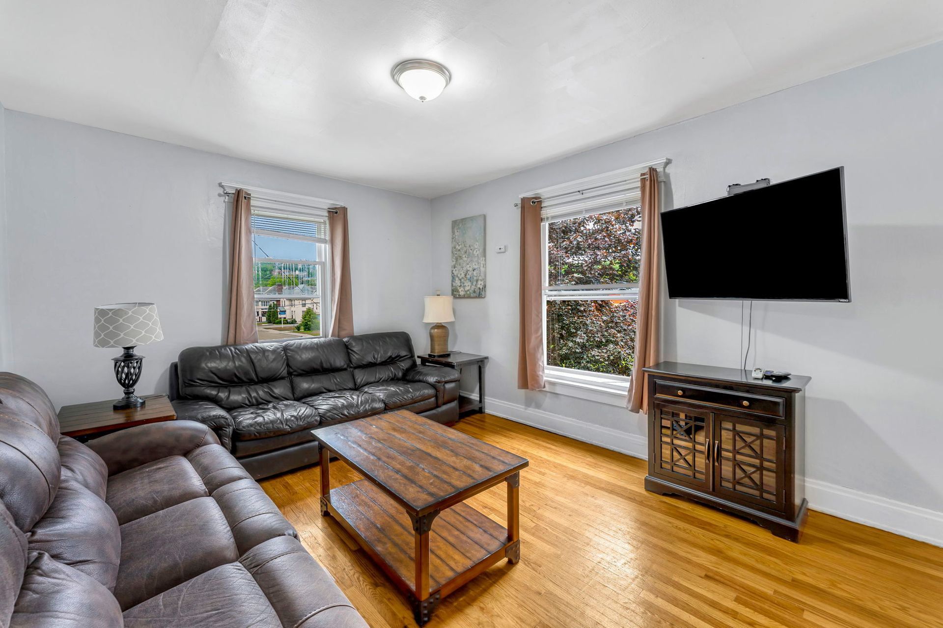 The second floor three bedroom apartment features a large kitchen with an abundance of cabinets, granite countertops, stainless steel appliances including a dishwasher and microwave. There is a separate dining room with a table and chairs. The spacious living room has two couches, coffee and end tables, entertainment center, and a 40"-50" flat screen TV! There is a full bathroom with a combination tub and shower. The washer and dryer is located in the bathroom. The three nicely sized bedrooms all have newer furniture including a 32"-50" TV, dresser, desk, office chair, nightstand, with a king and two queen size beds (mattress/box spring/frame).