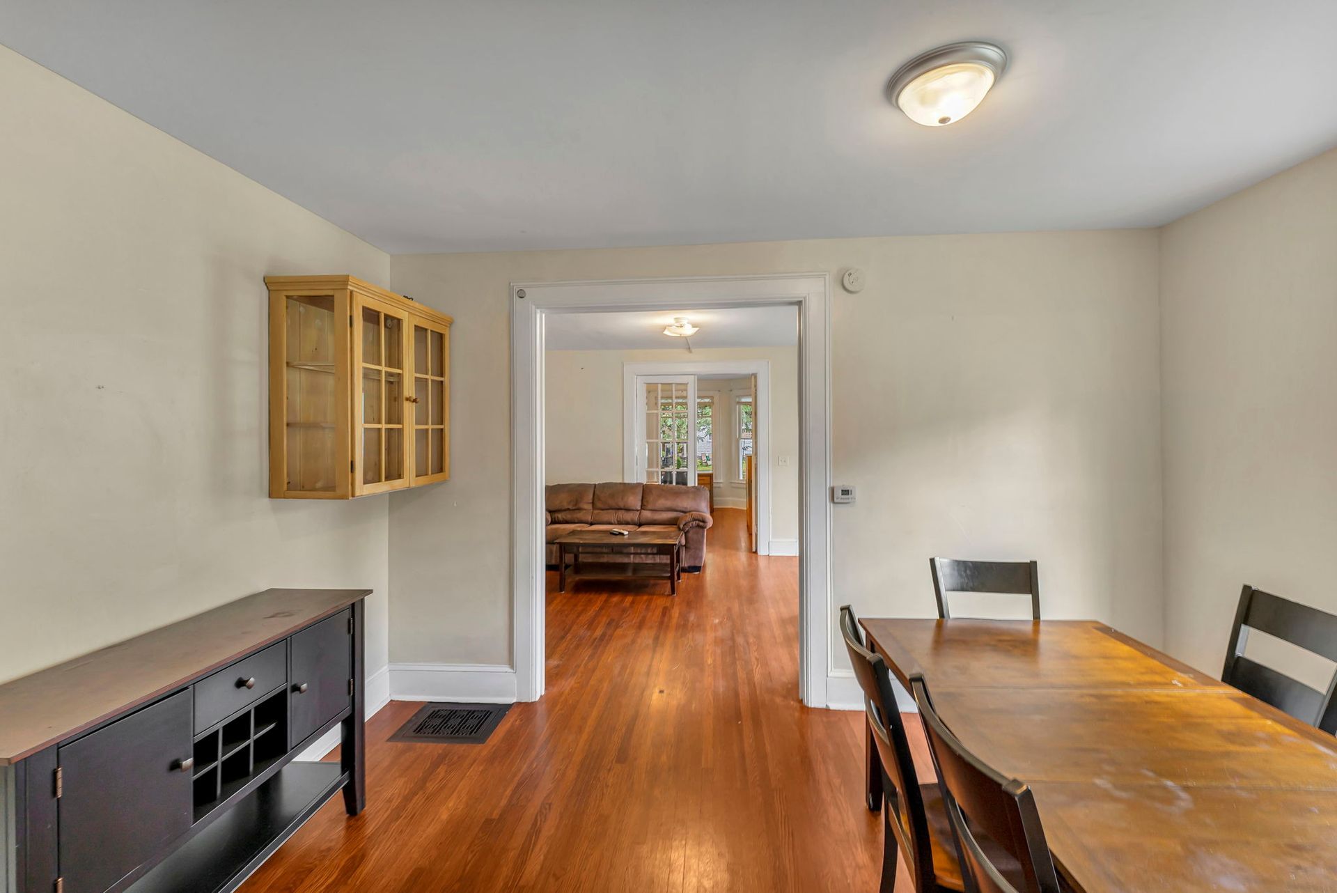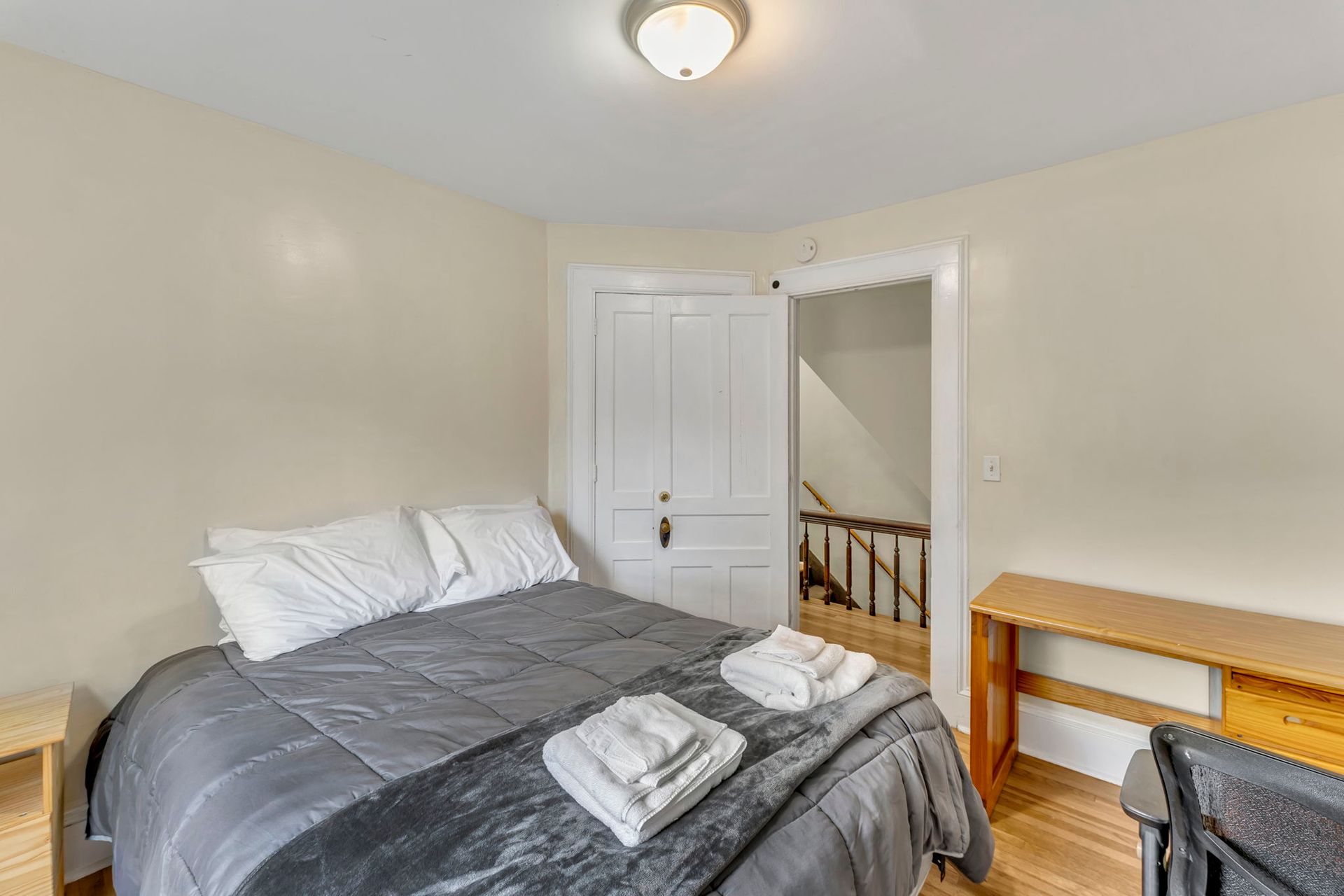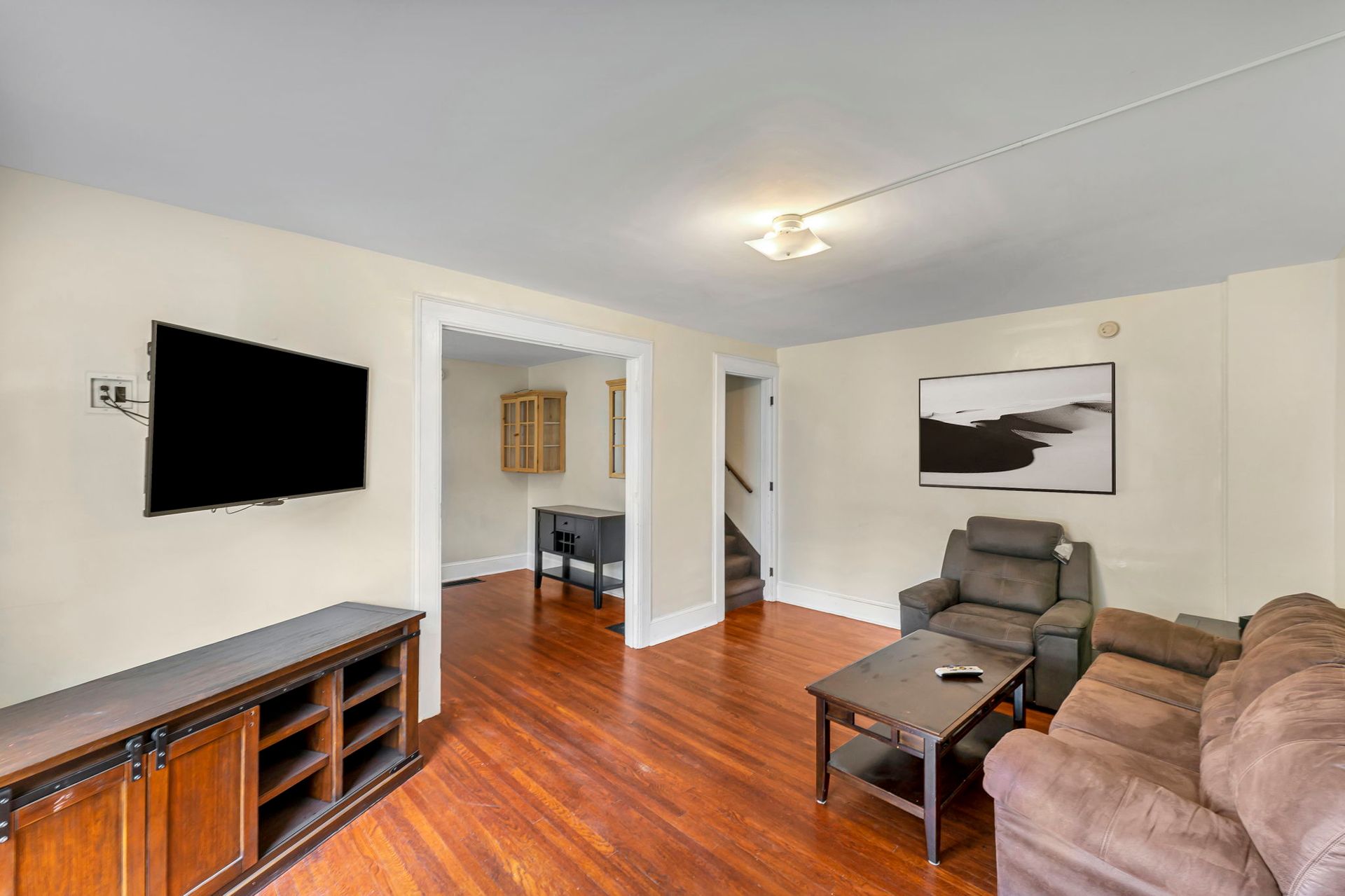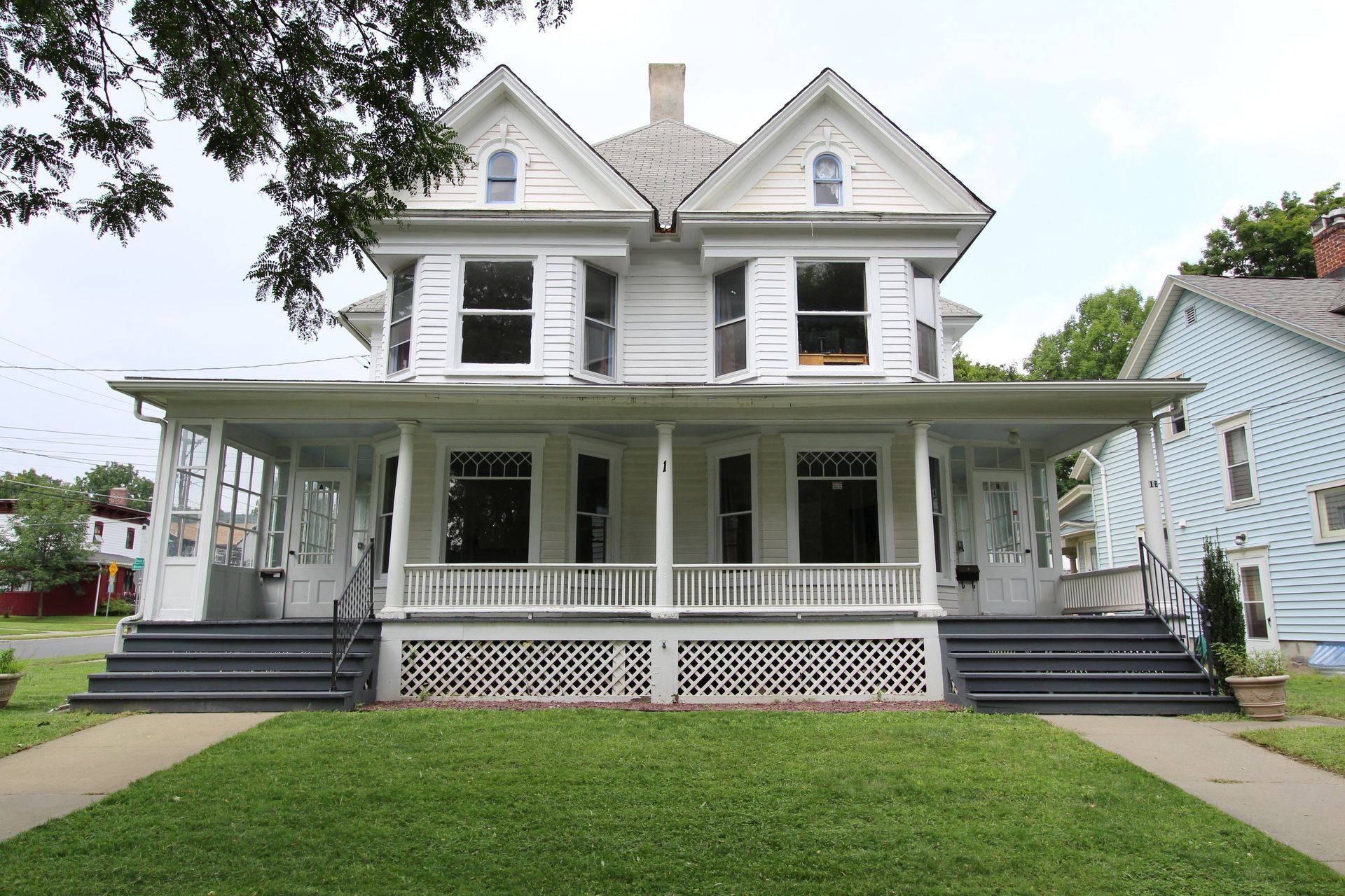 This four bedroom apartment features wood floors throughout, a kitchen with an abundance of cabinets and a microwave. There is a separate dining room with a table and chairs. The spacious living room has a couch and a recliner, coffee and end tables, entertainment center, and a 40"-50" flat screen TV! With a bedroom off of the living room. The second floor offers a three season enclosed porch and the other 3 bedrooms. There is a full bathroom with a combination tub and shower. The four nicely sized bedrooms all have newer furniture including a 32"-50" TV, dresser, desk, office chair, nightstand, and a queen size bed (mattress/box spring/frame).