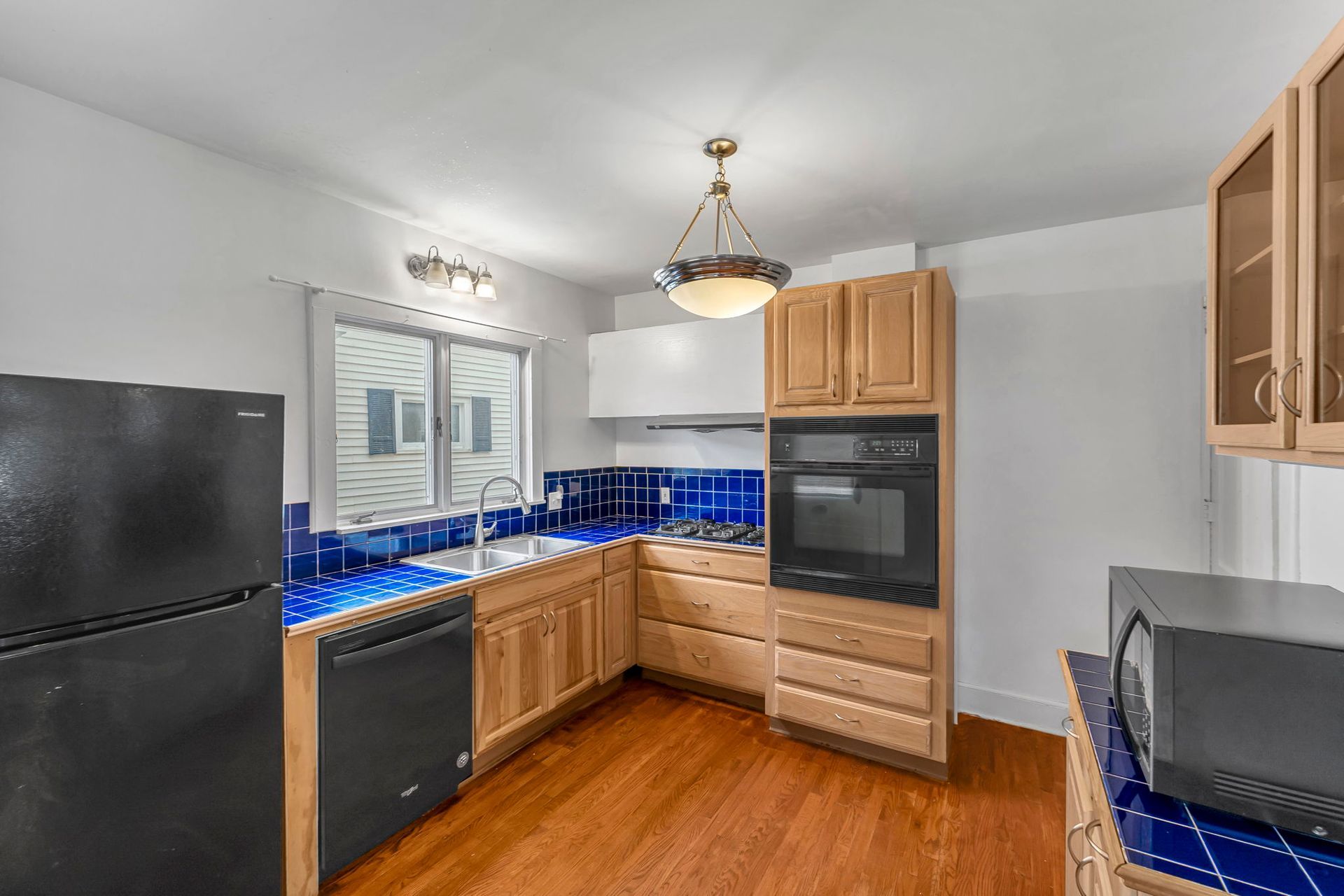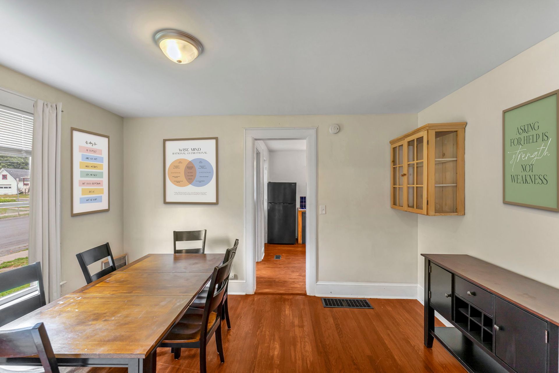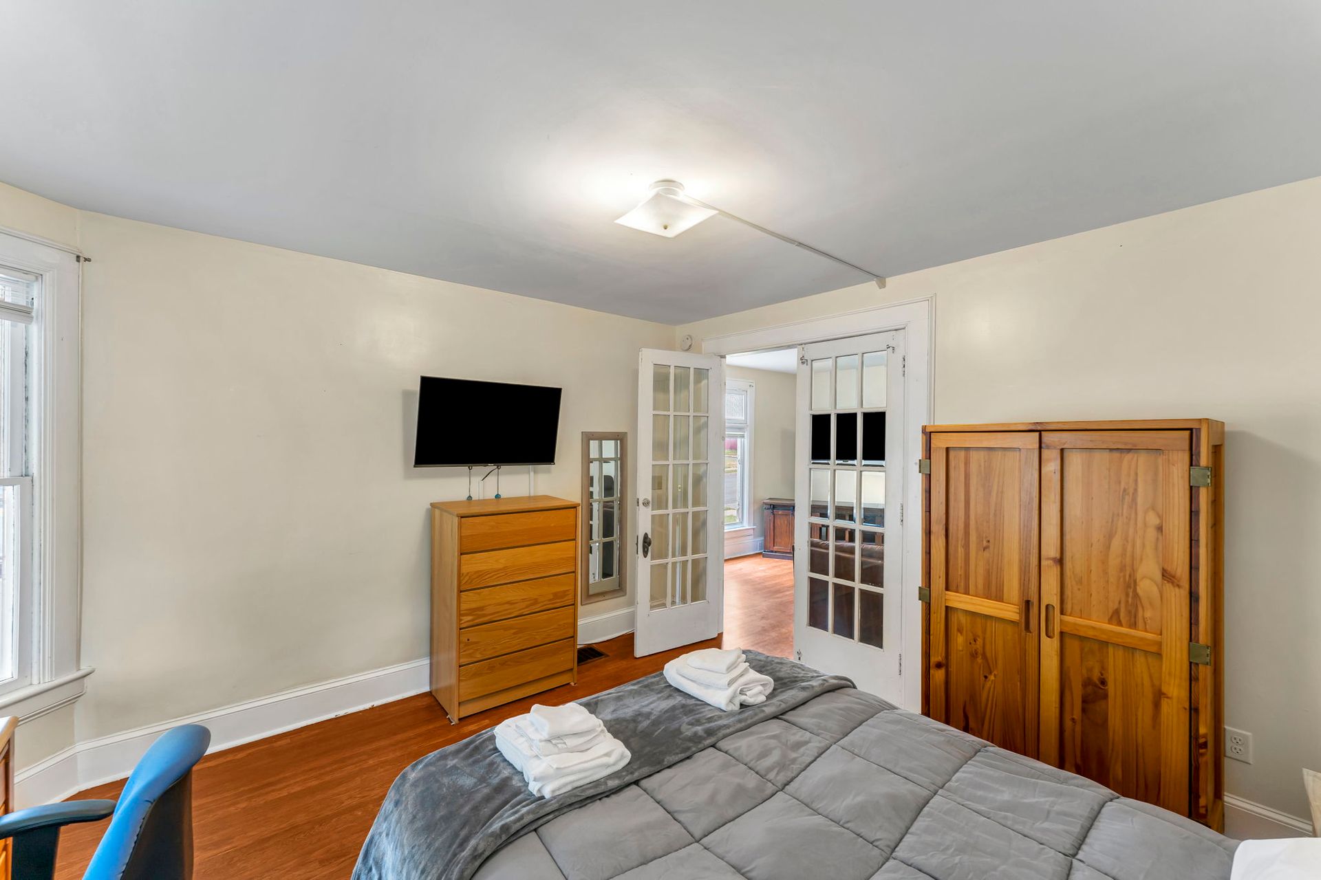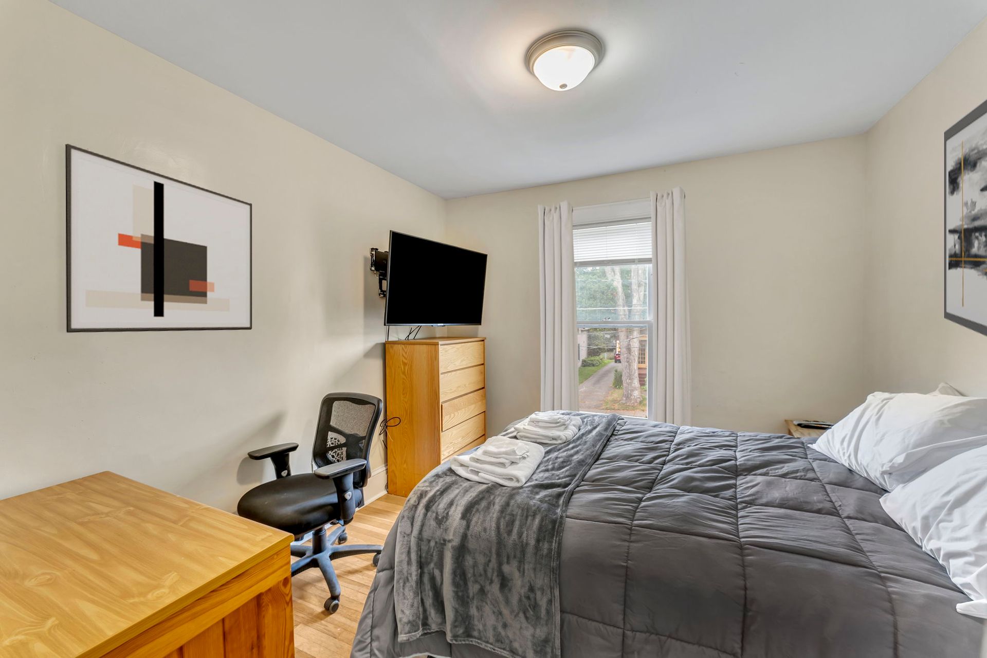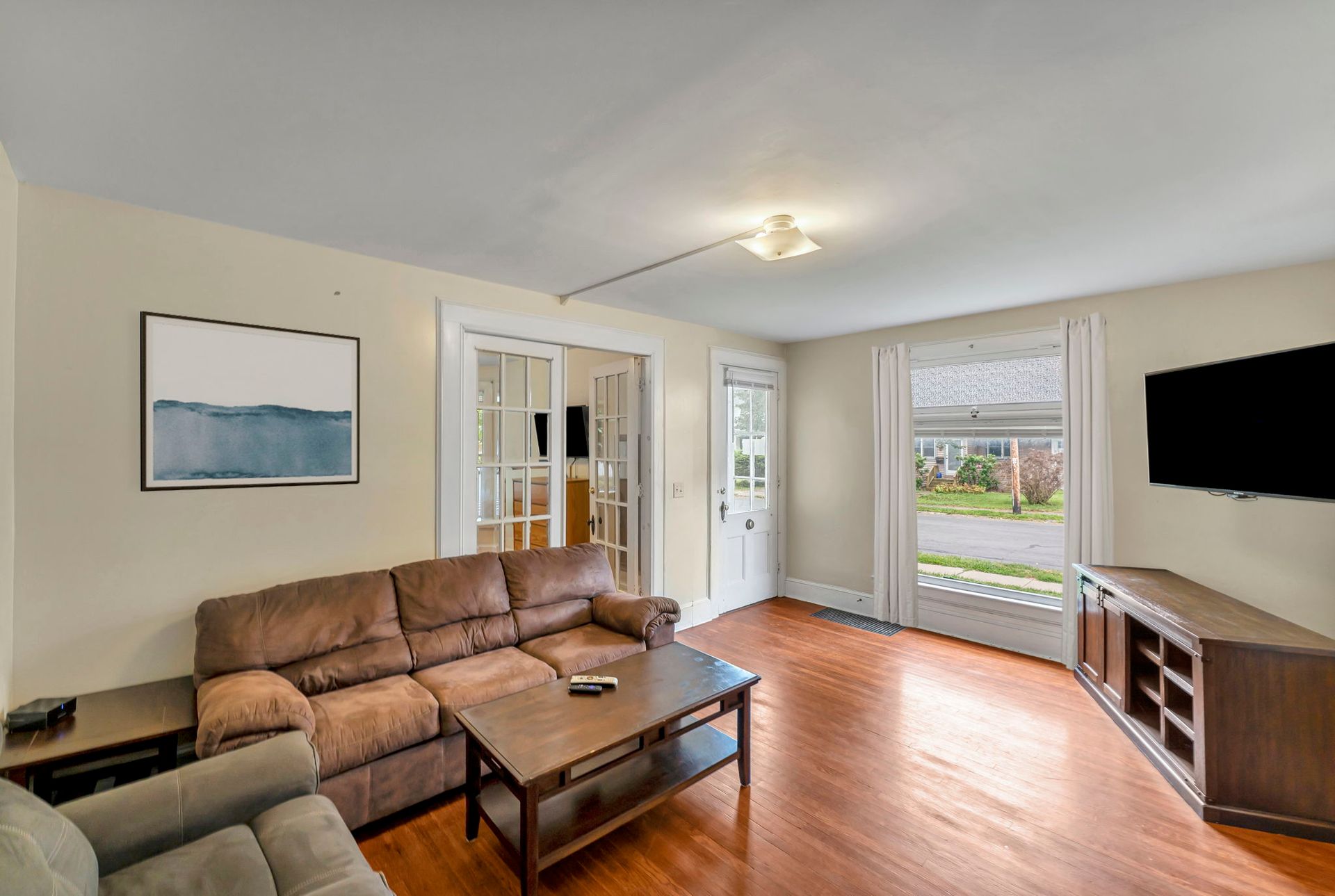 This four bedroom apartment features wood floors throughout, a kitchen with an abundance of cabinets and a microwave. There is a separate dining room with a table and chairs. The spacious living room has a couch and a recliner, coffee and end tables, entertainment center, and a 40"-50" flat screen TV! With a bedroom off of the living room. The second floor offers a three season enclosed porch and the other 3 bedrooms. There is a full bathroom with a combination tub and shower. The four nicely sized bedrooms all have newer furniture including a 32"-50" TV, dresser, desk, office chair, nightstand, and a queen size bed (mattress/box spring/frame).
