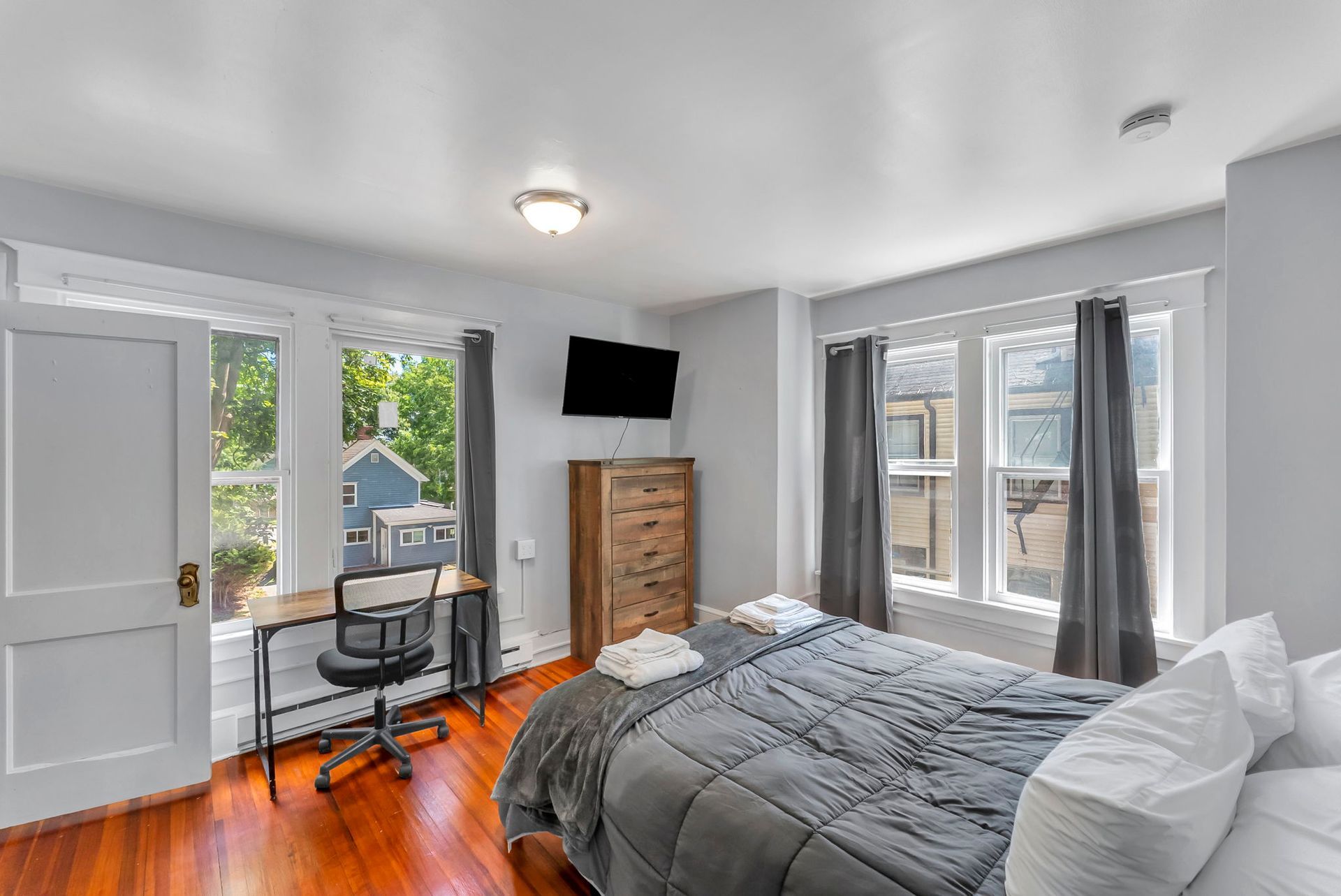 This second floor one bedroom apartment features vinyl plank floors throughout, newly renovated kitchen with a dishwasher and microwave. The living room has a couch, coffee and end tables, entertainment center, and a 40"-50" flat screen TV! There is a full bathroom with a walk in shower. The nicely sized bedroom has newer furniture including a 32"-50" TV, dresser, desk, office chair, nightstand, and full size bed (mattress/box spring/frame).