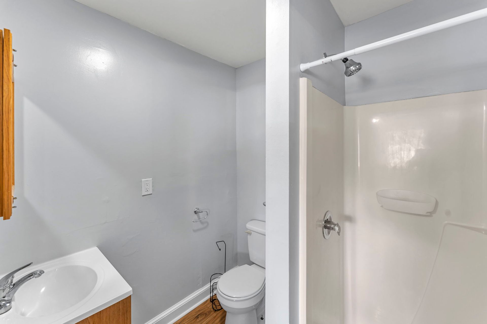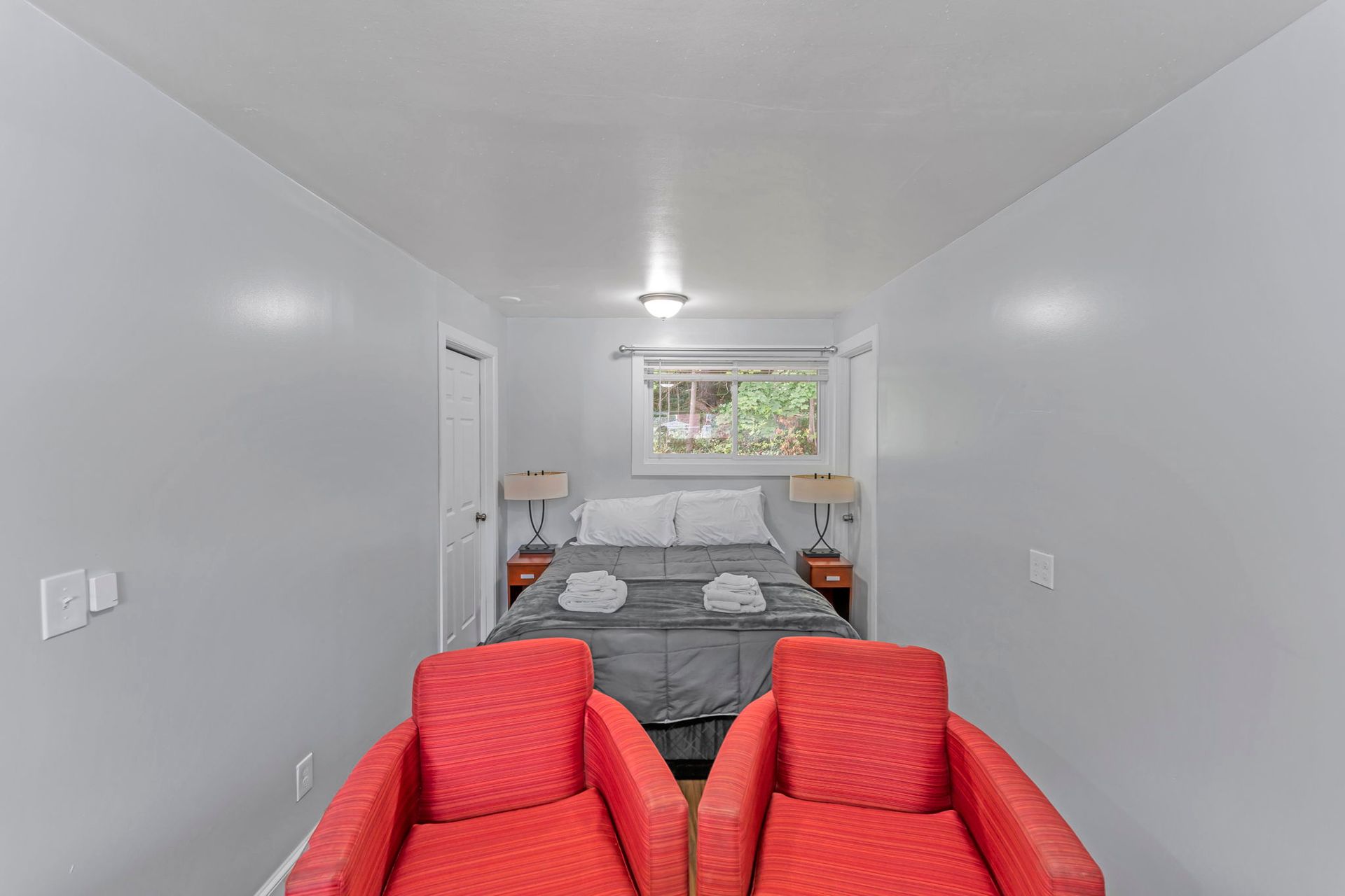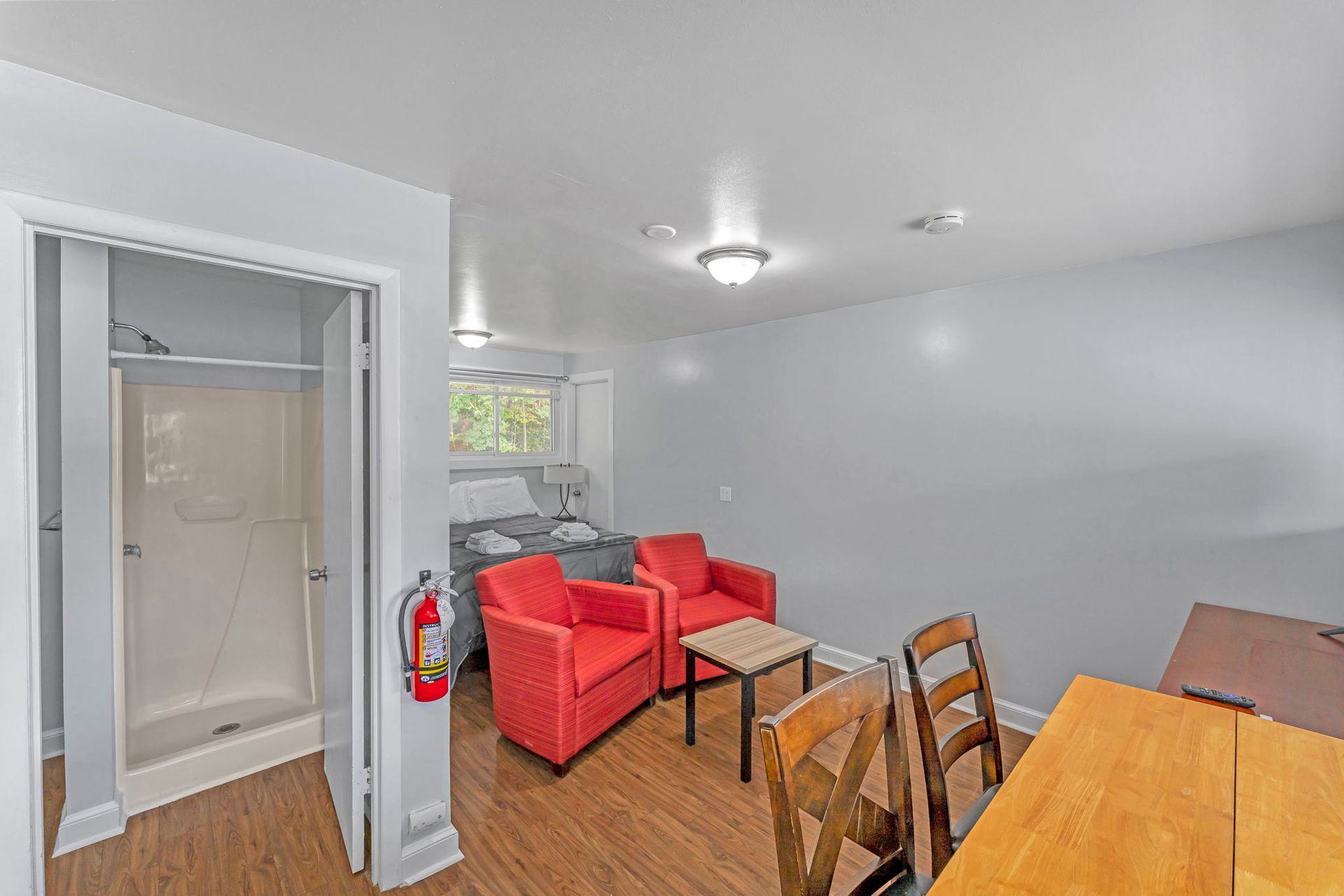 This spacious studio apartment features wood floors throughout, an eat in kitchen area with a microwave and a table with chairs. The full bathroom has a walk in shower. The washer and dryer is in the apartment. The living room/bedroom area offers a couch, coffee and end table, 32"-50" TV, dresser, desk, office chair and full size bed (mattress/box spring/frame).
