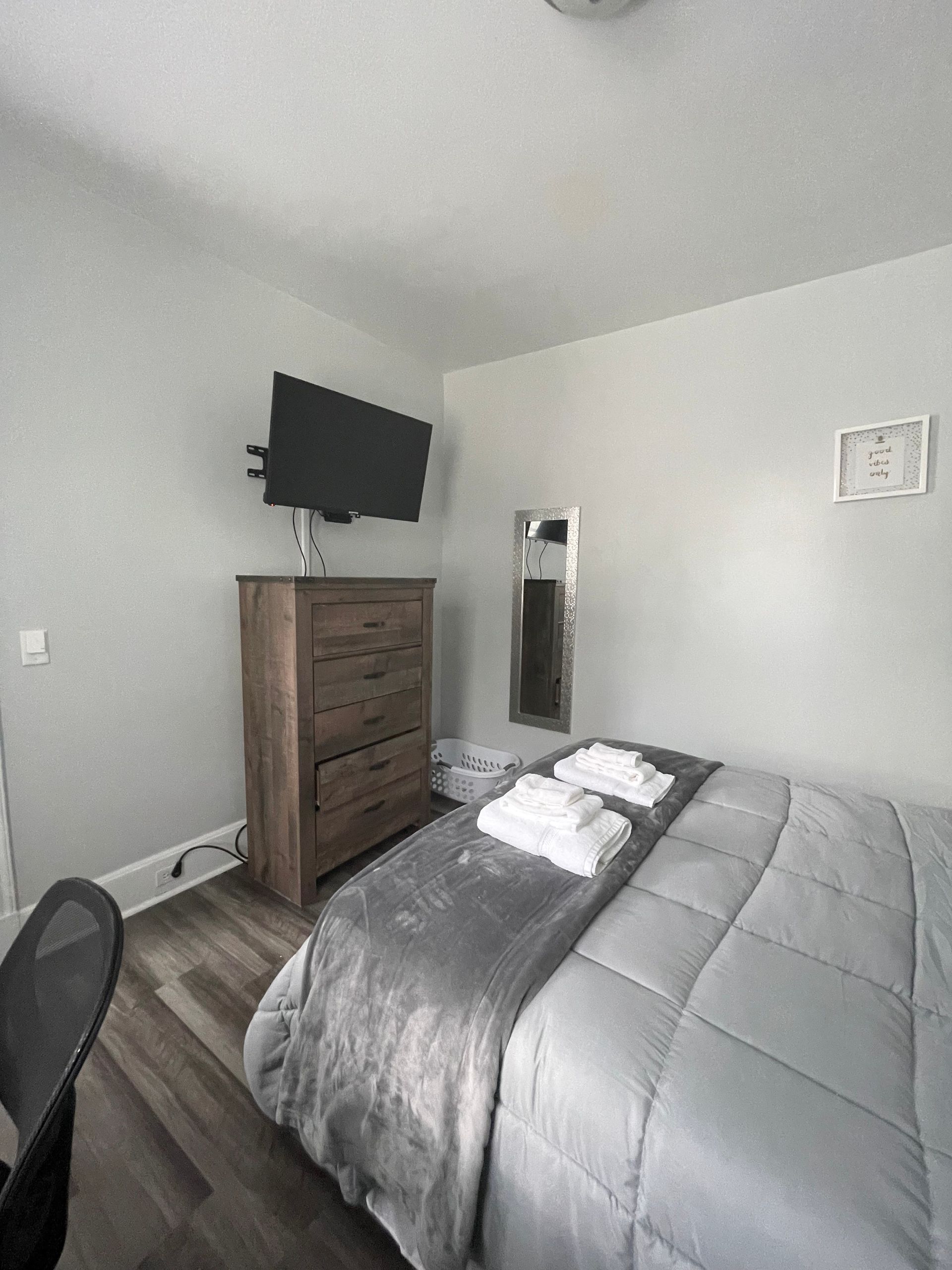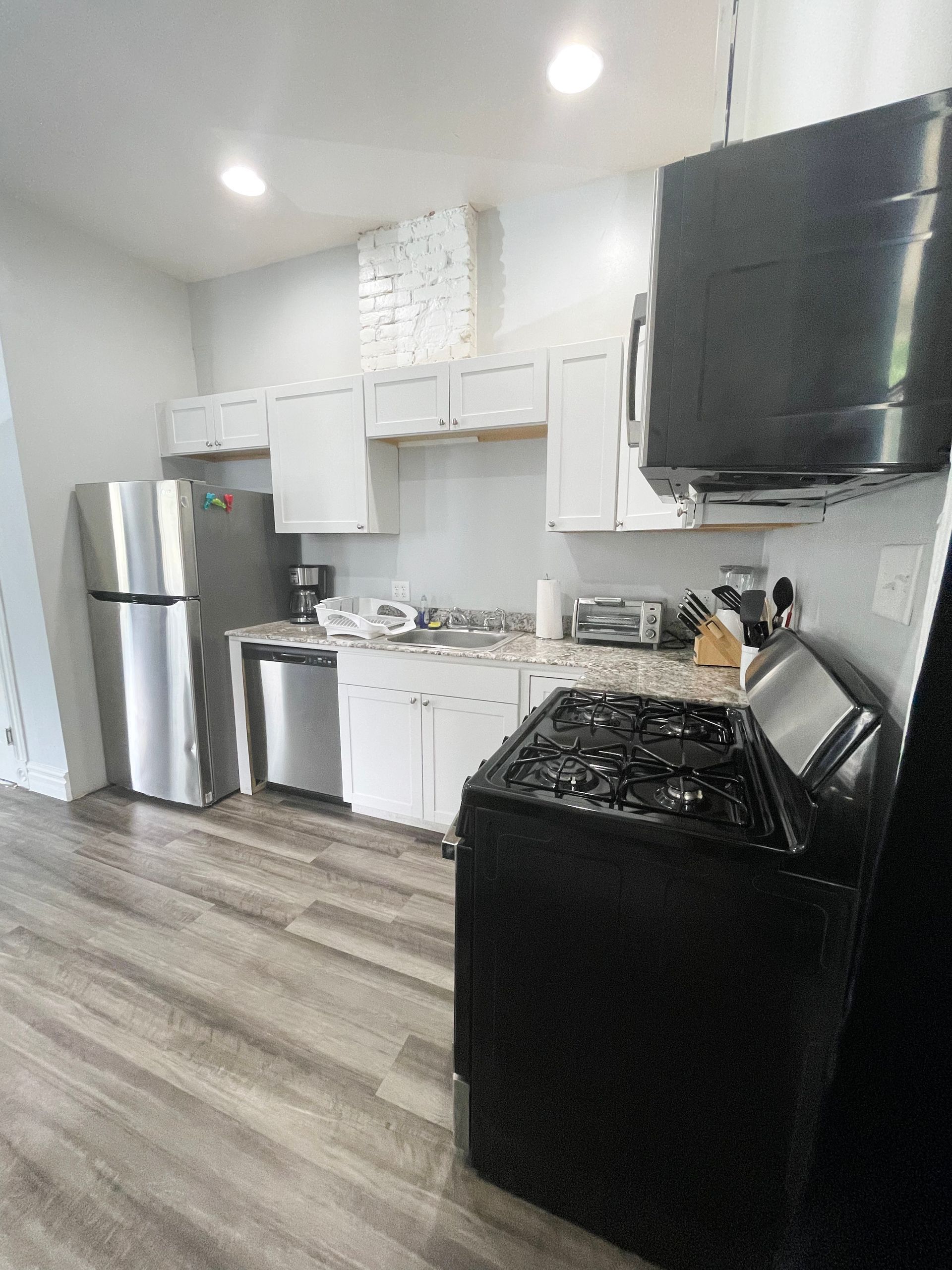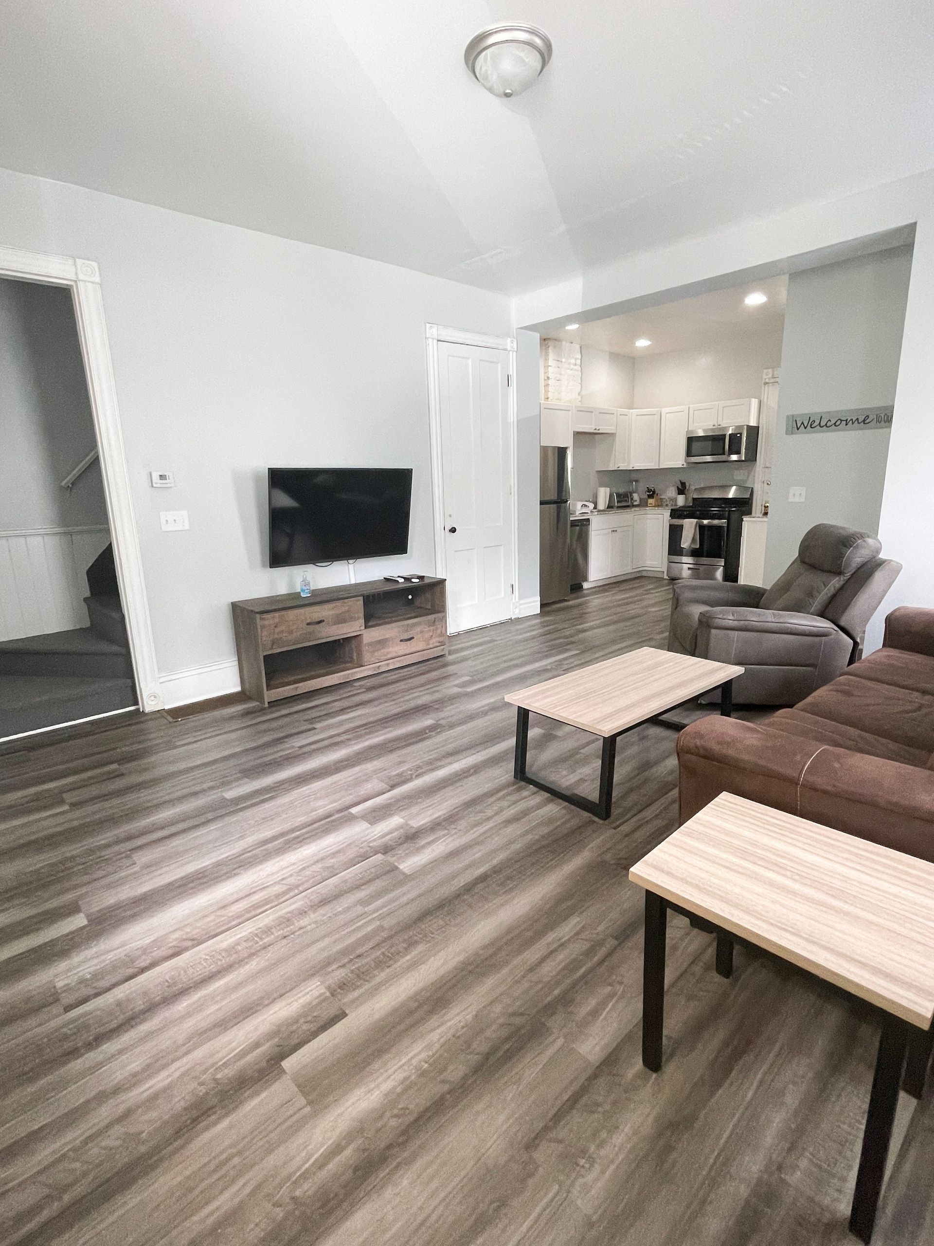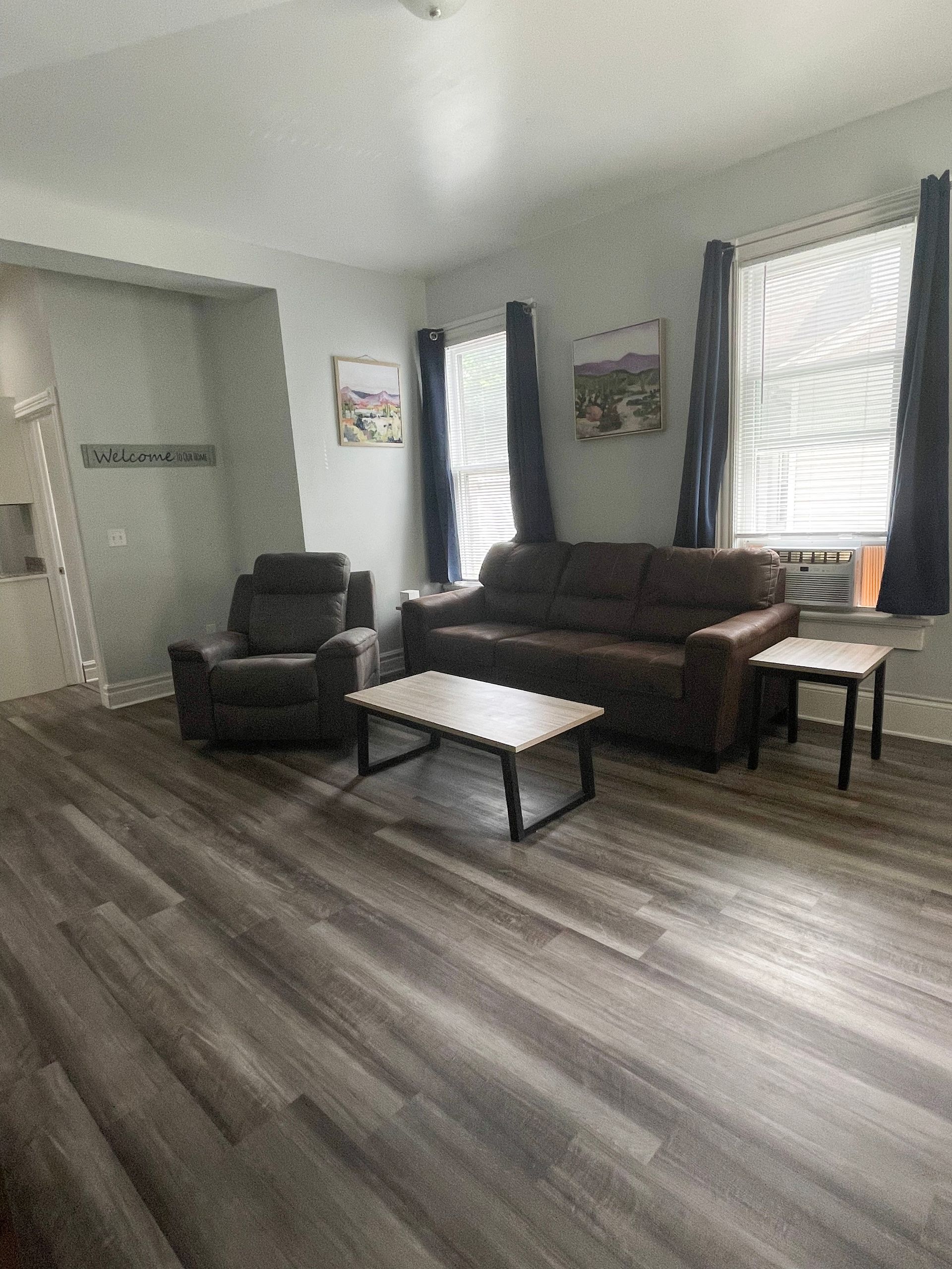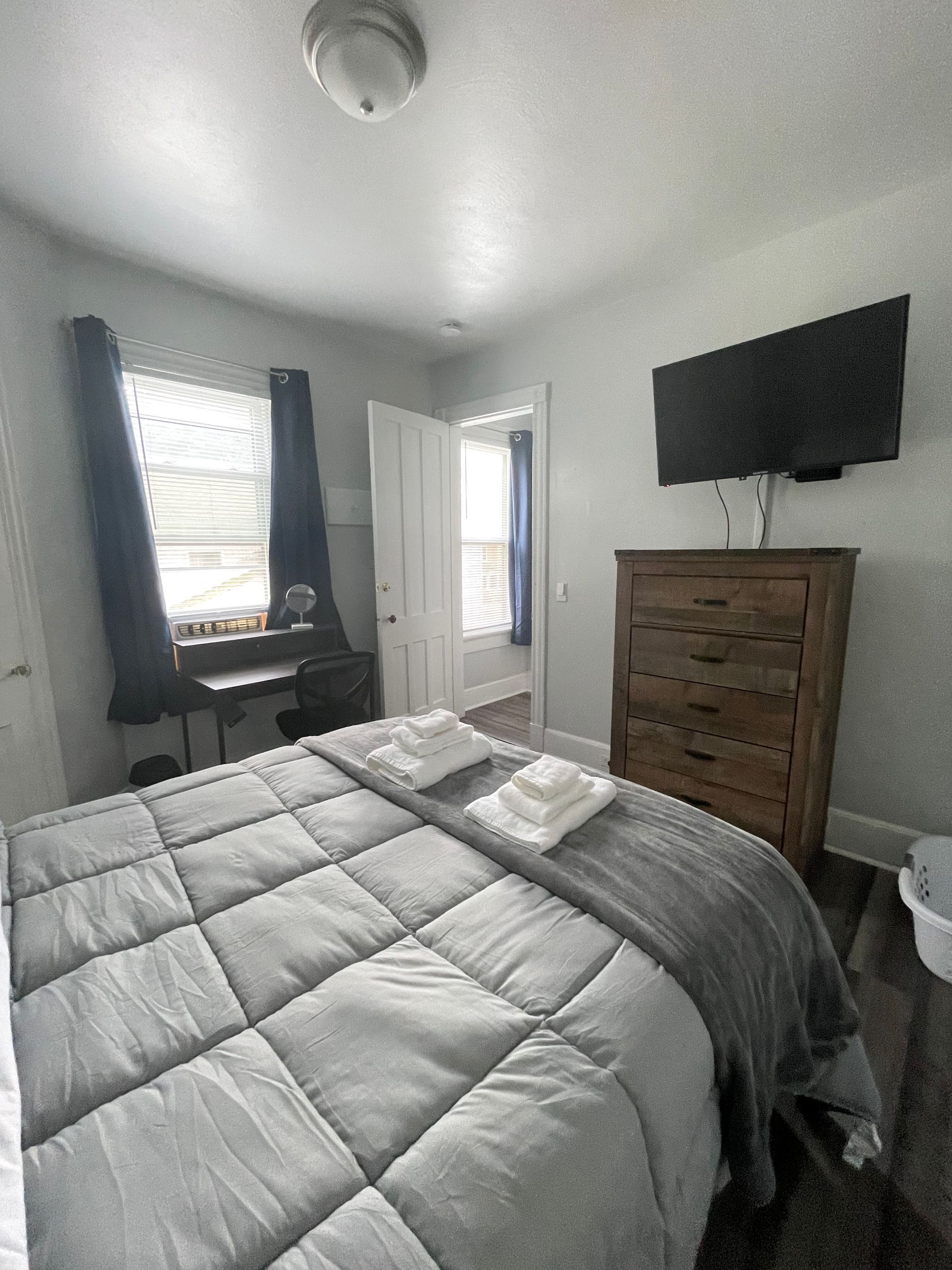 The right side of this two-story four bedroom apartment features an eat-in kitchen with a dishwasher, microwave and a table with chairs. The living room has a couch, coffee and end tables, entertainment center, and a 40"-50" flat screen TV! The first floor has a full bathroom with a combination shower/tub and washer/dryer. The second floor offers a full bathroom with a combination tub and shower. The three bedrooms all have newer furniture including a 32"-50" TV, dresser, desk, office chair, nightstand, and a queen size bed (mattress/box spring/frame).