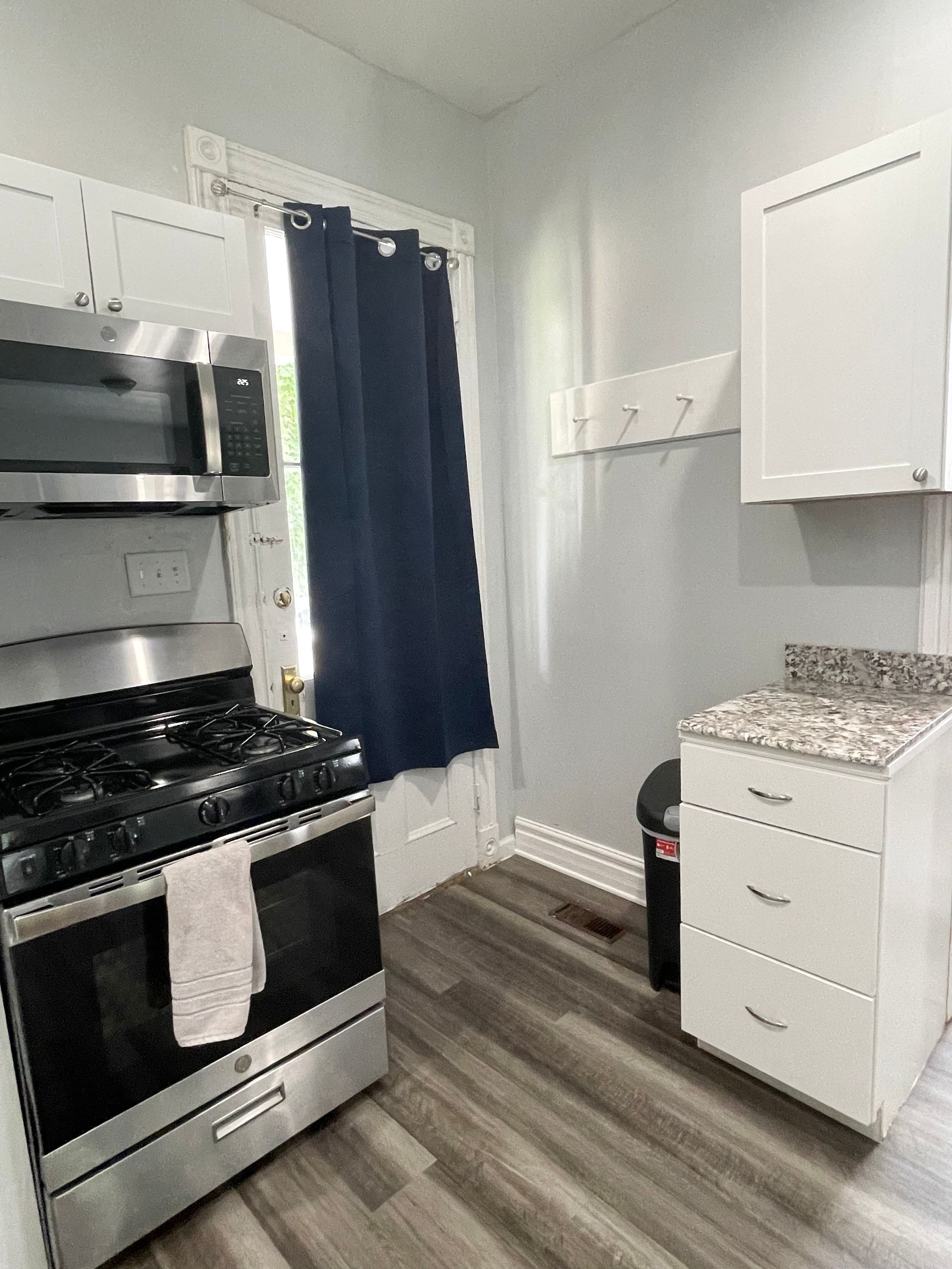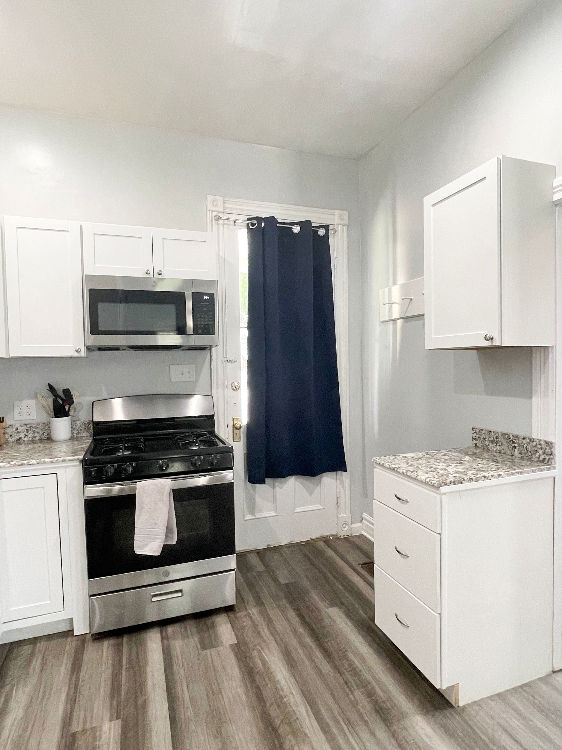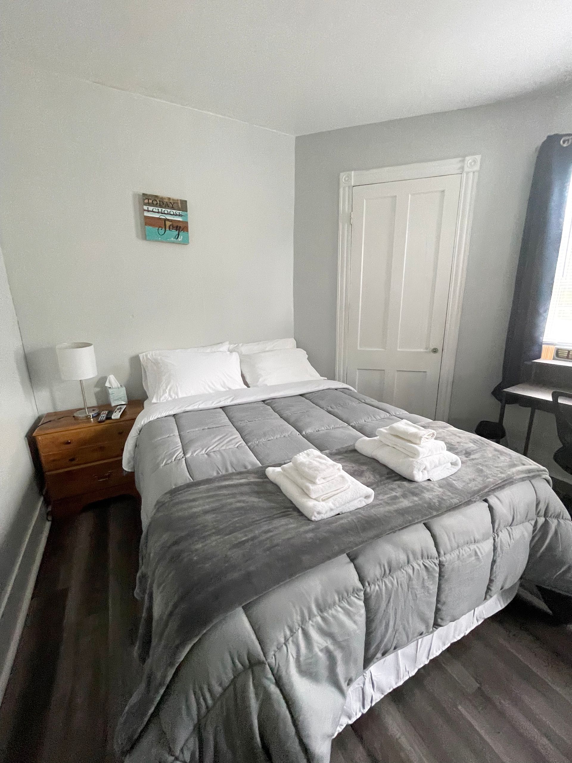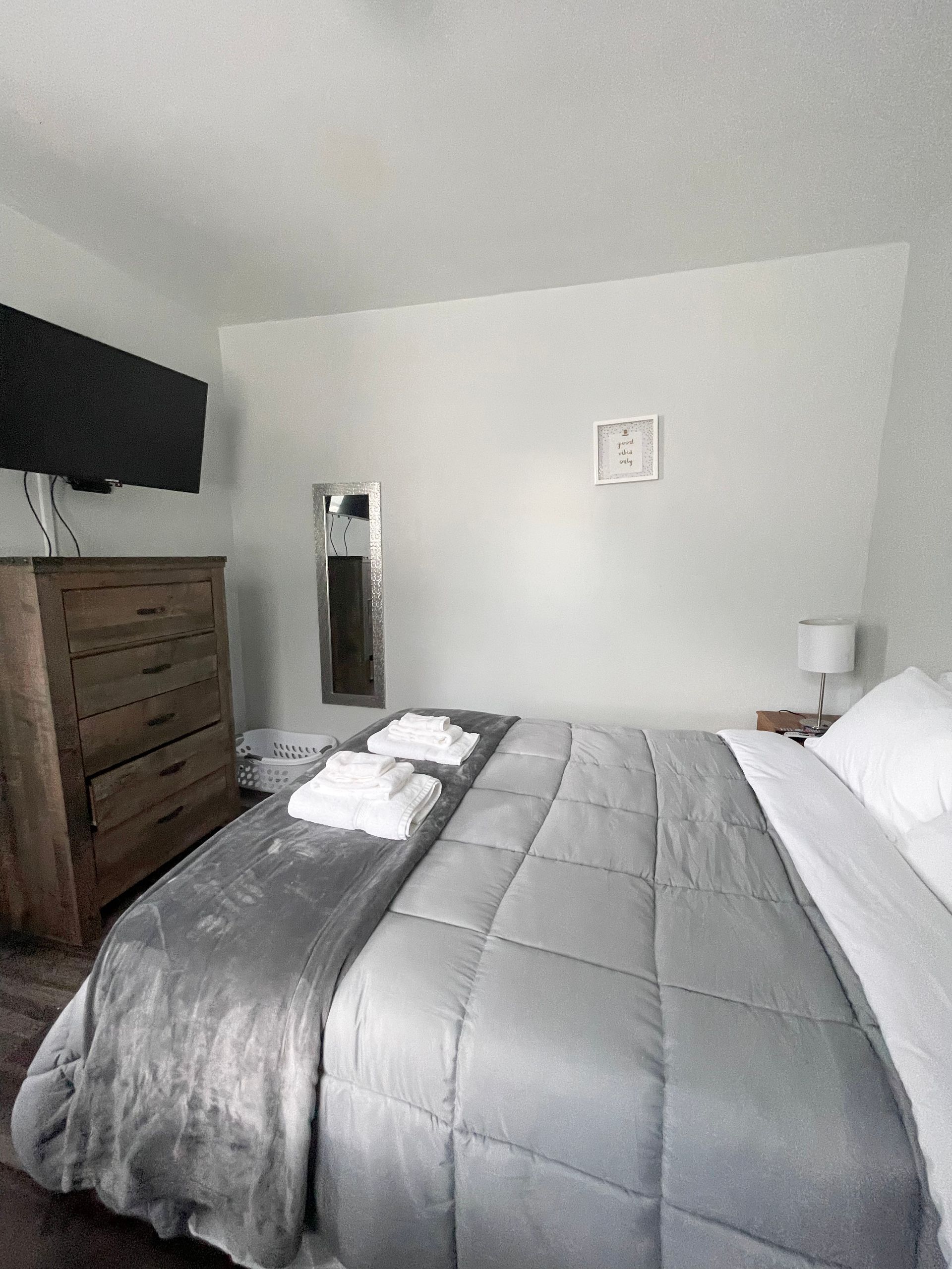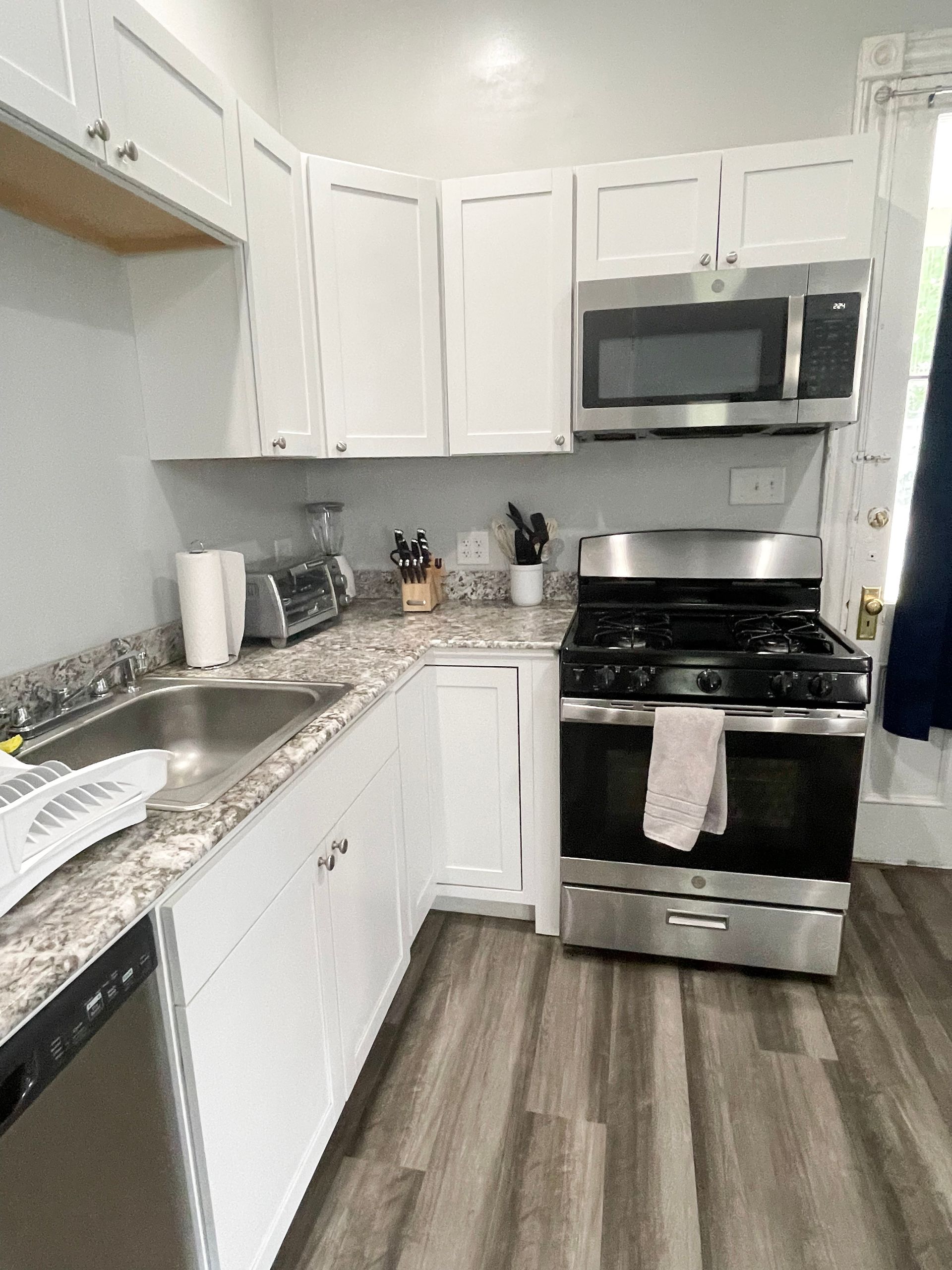 The right side of this two-story four bedroom apartment features an eat-in kitchen with a dishwasher, microwave and a table with chairs. The living room has a couch, coffee and end tables, entertainment center, and a 40"-50" flat screen TV! The first floor has a full bathroom with a combination shower/tub and washer/dryer. The second floor offers a full bathroom with a combination tub and shower. The three bedrooms all have newer furniture including a 32"-50" TV, dresser, desk, office chair, nightstand, and a queen size bed (mattress/box spring/frame).