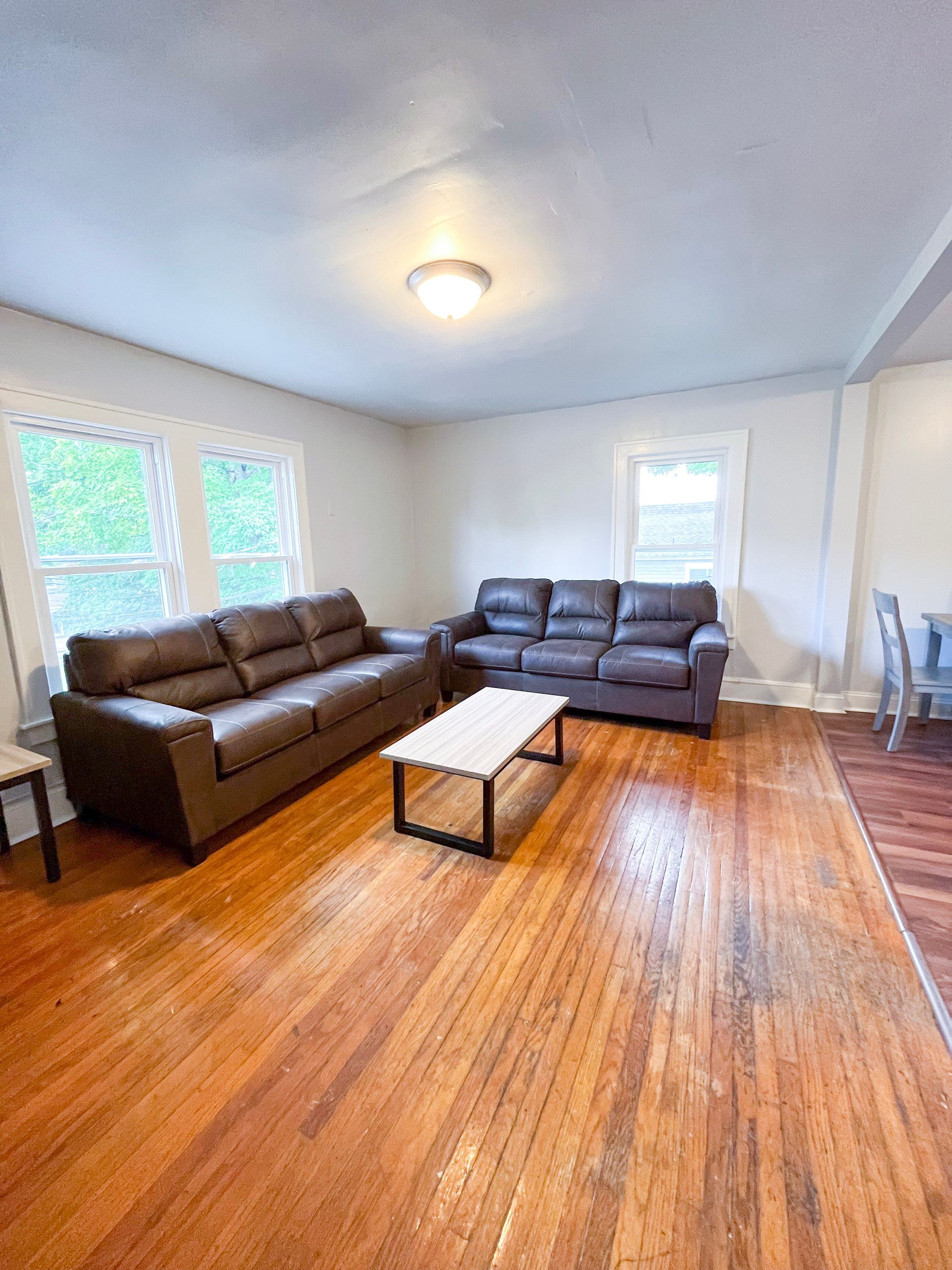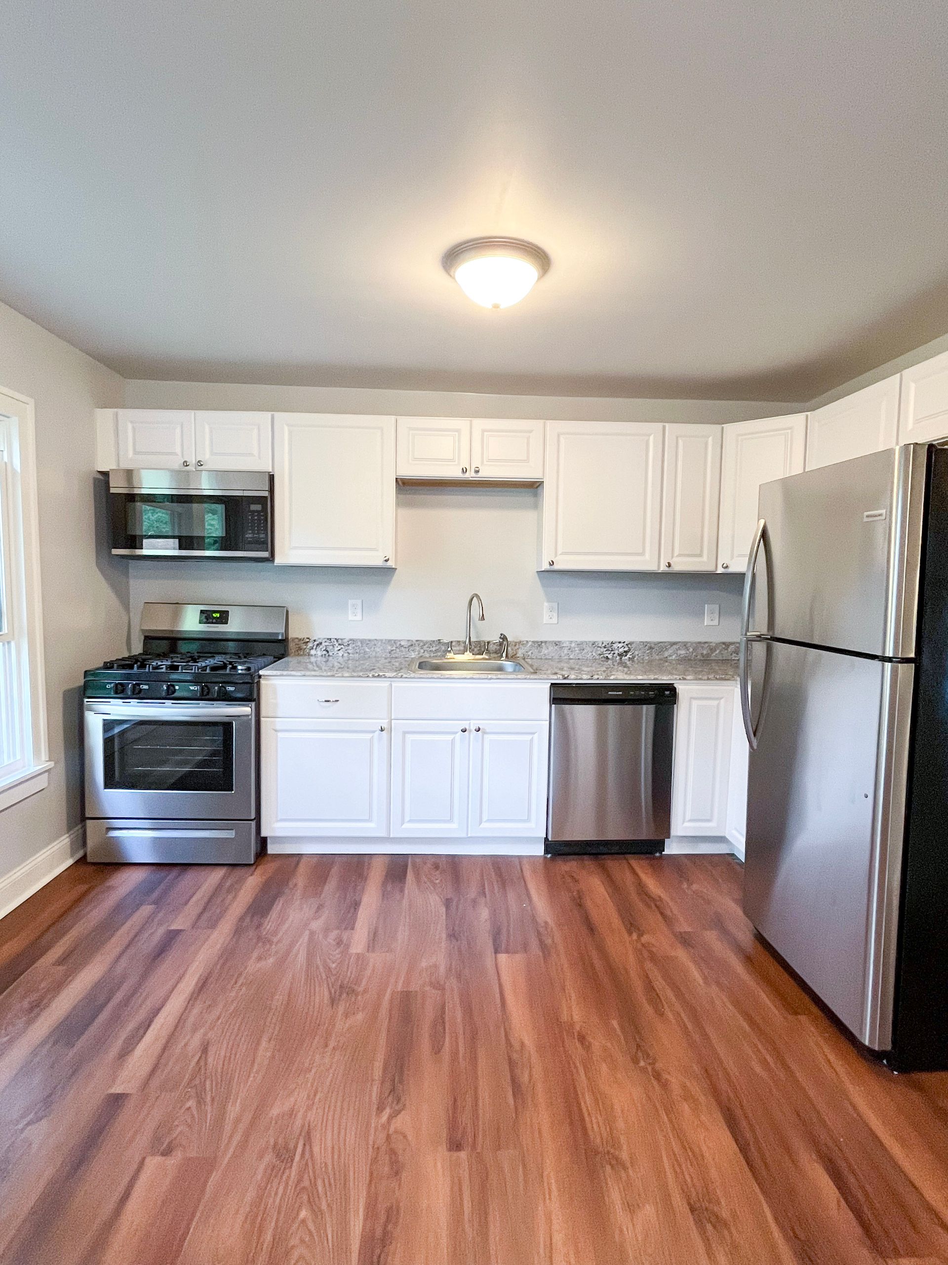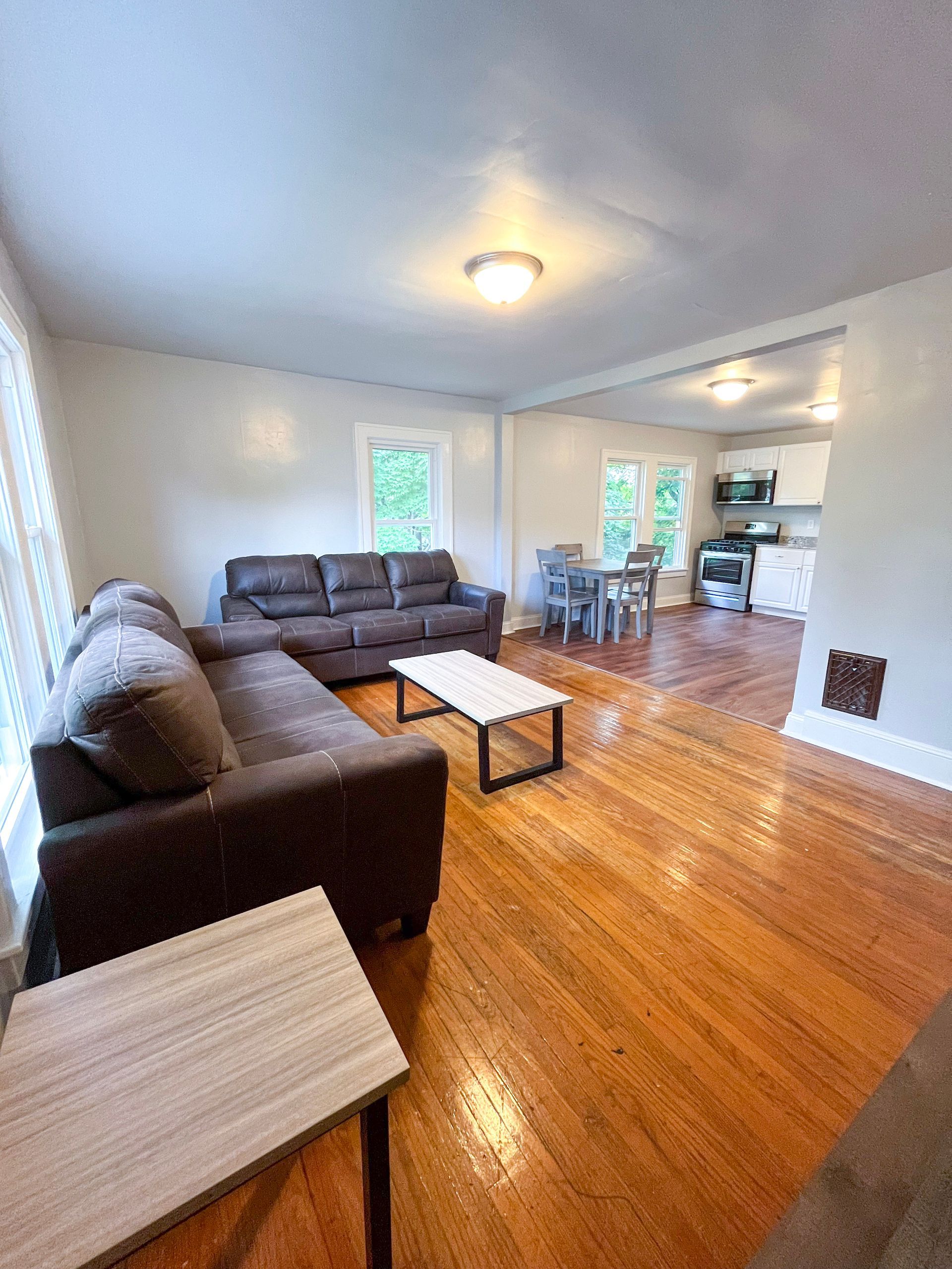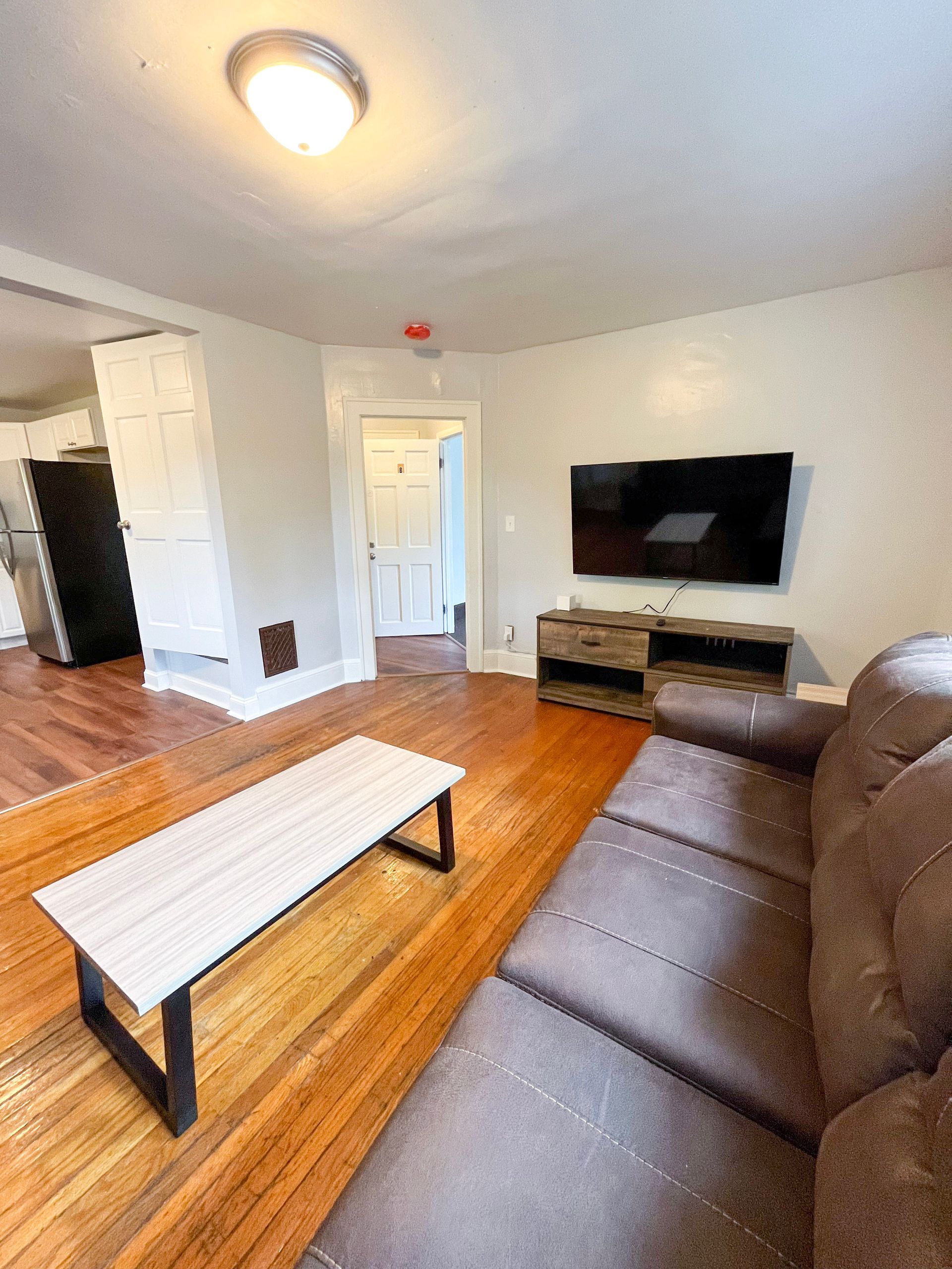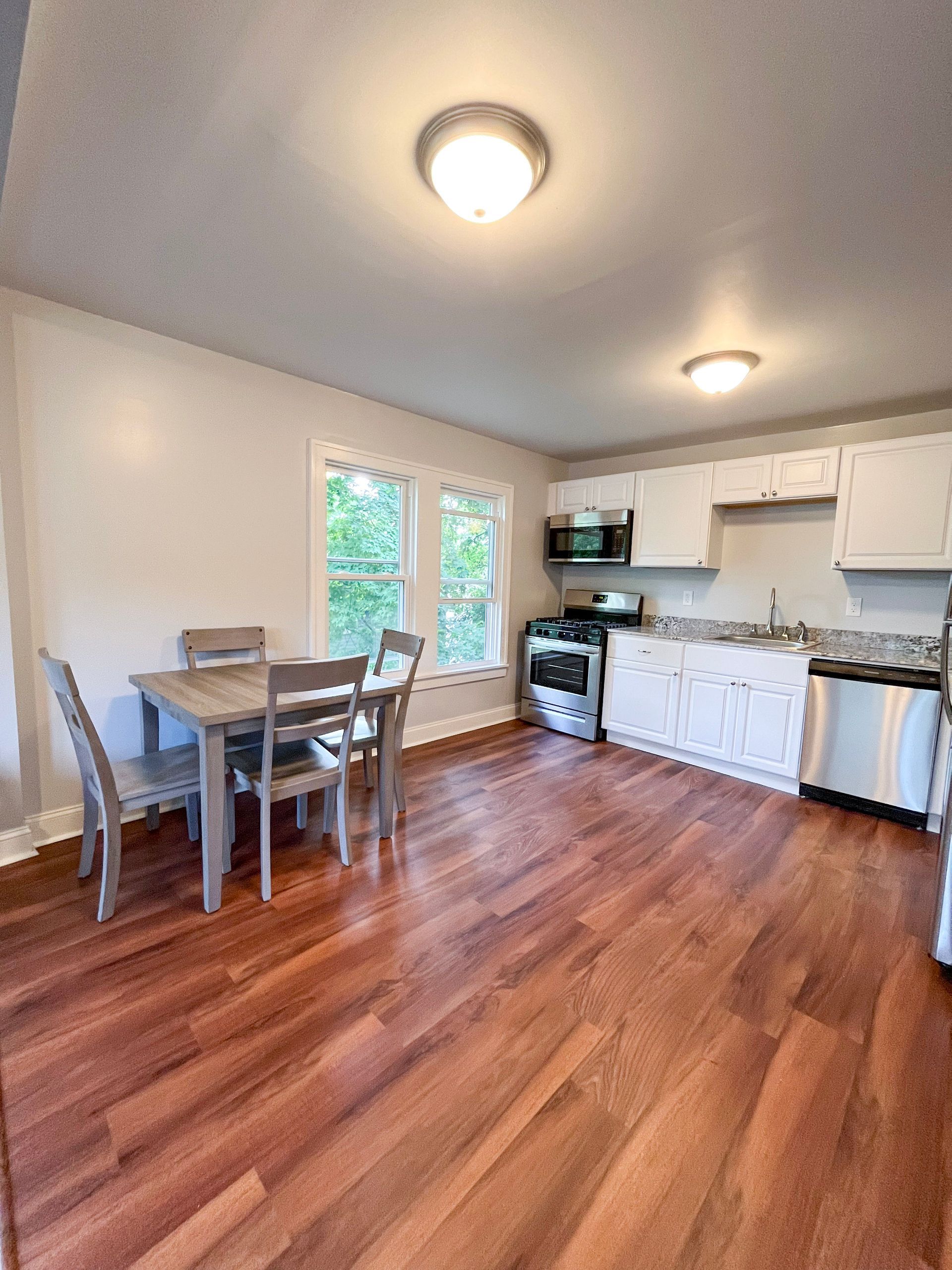 This newly renovated three bedroom apartment with wood and vinyl plank floors throughout features an eat-kitchen with a dishwasher, microwave and table with chairs. The living room features a couch, coffee and end tables, entertainment center, and a 40"-50" flat screen smart TV. There is a full bathroom with a combination tub and shower. The spacious bedrooms all have newer furniture including a 32"-50" smart TV, dresser, desk, office chair, nightstand, and full size bed (mattress/box spring/frame).