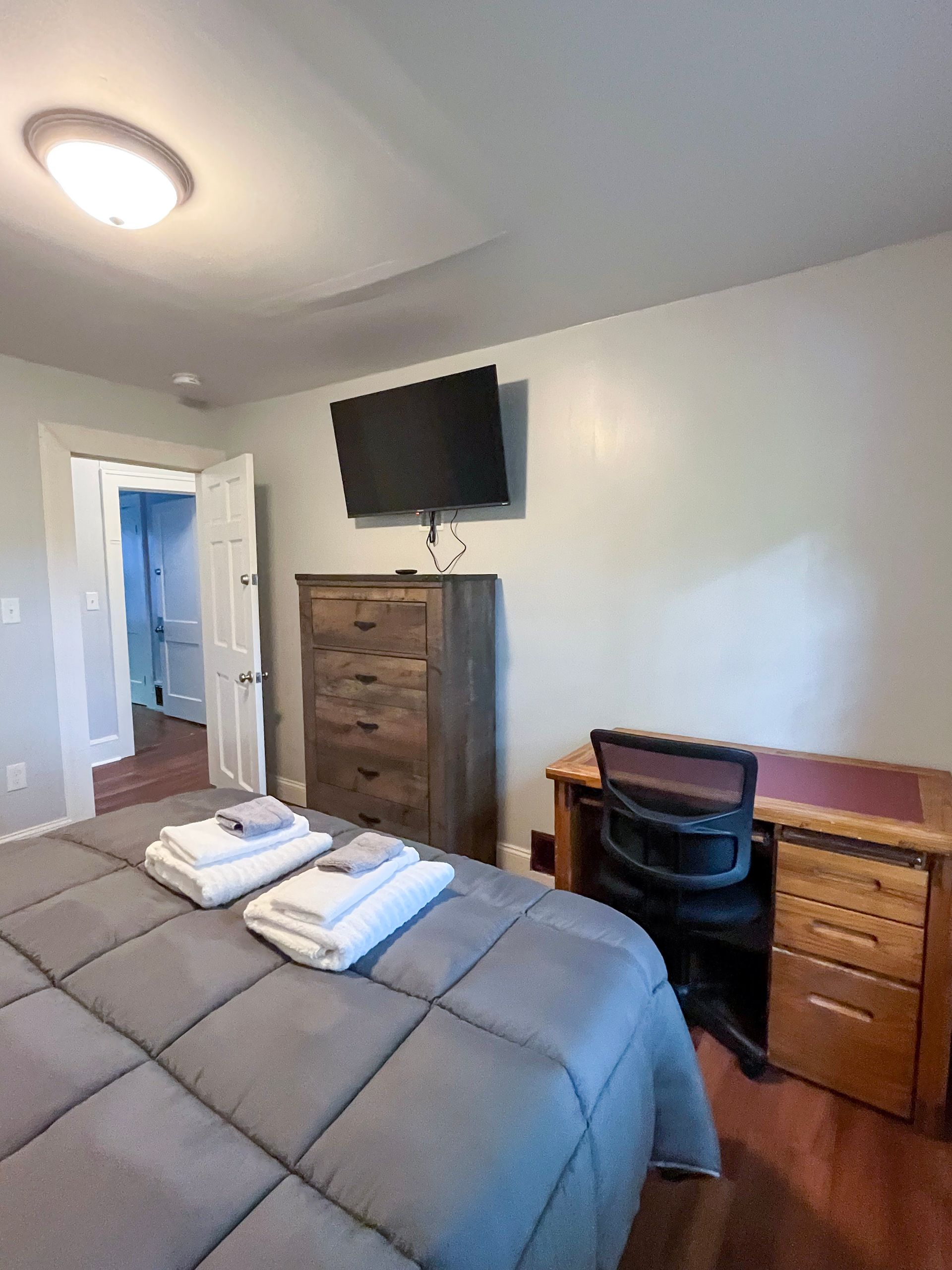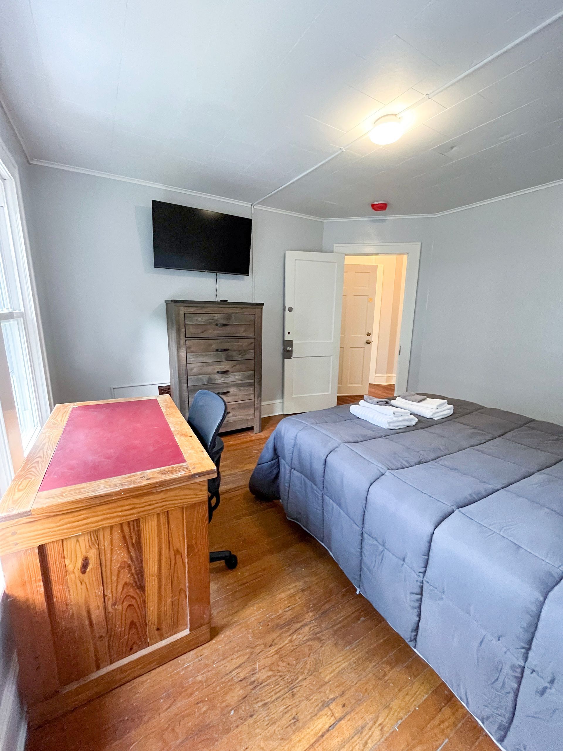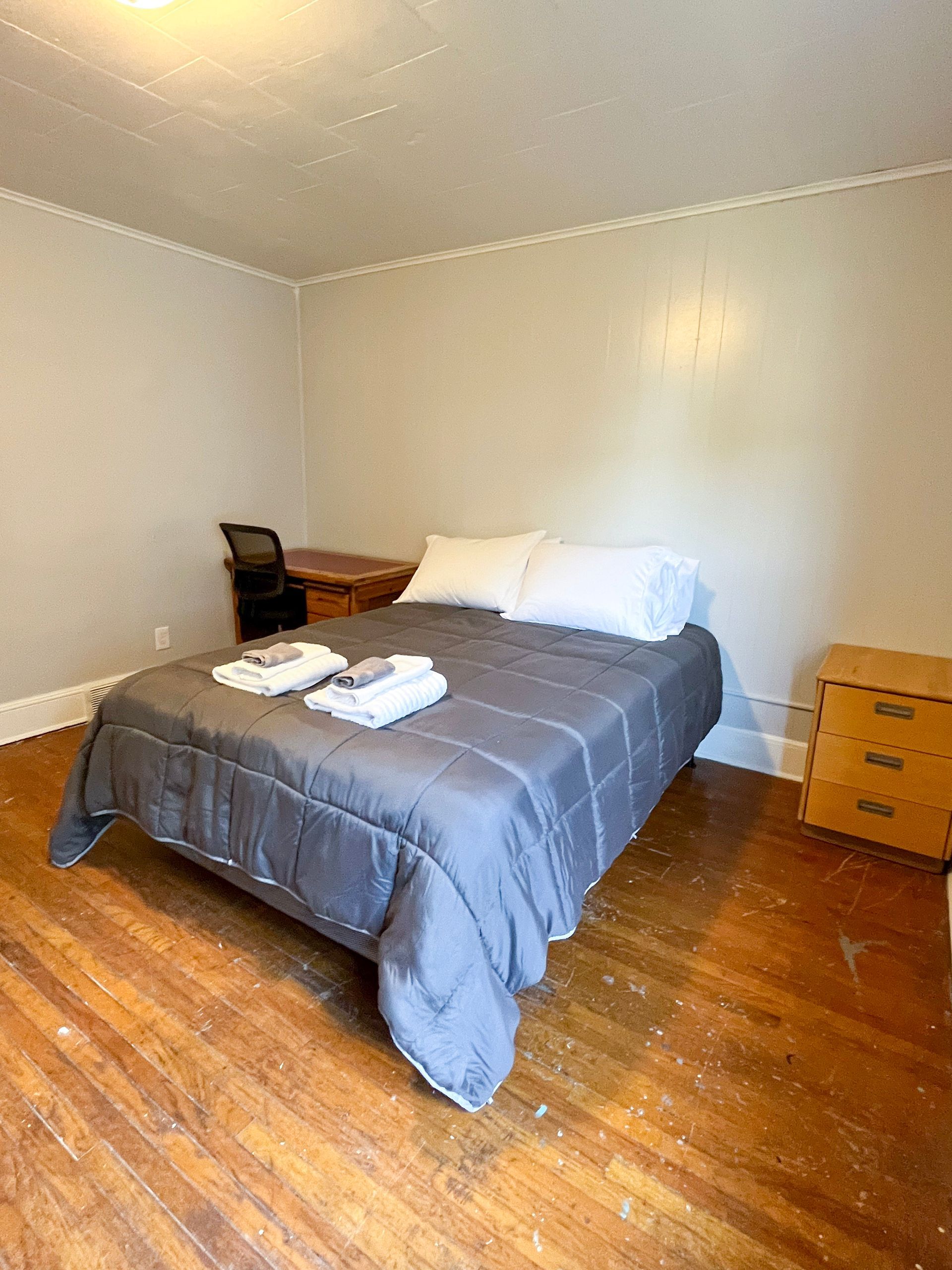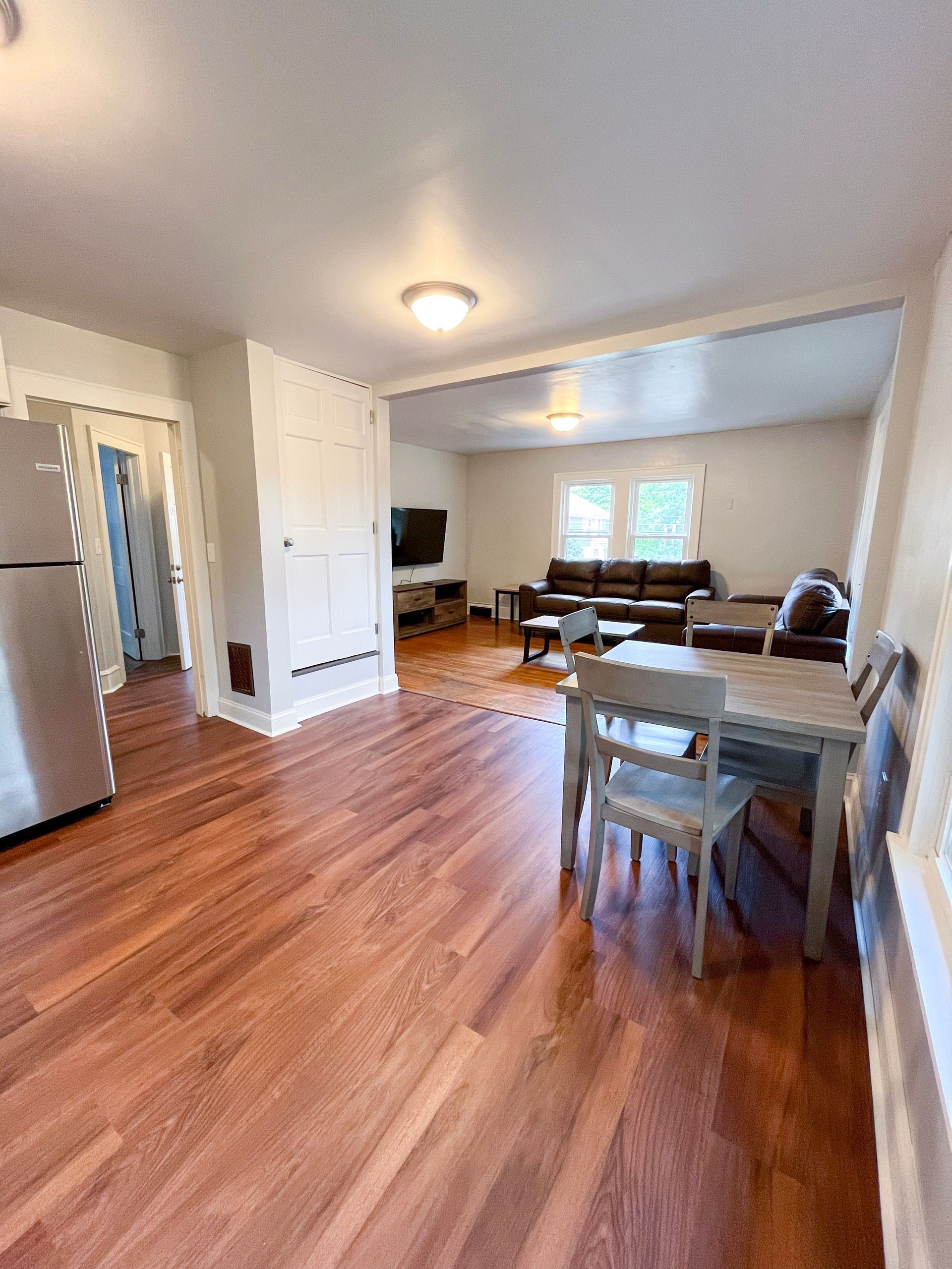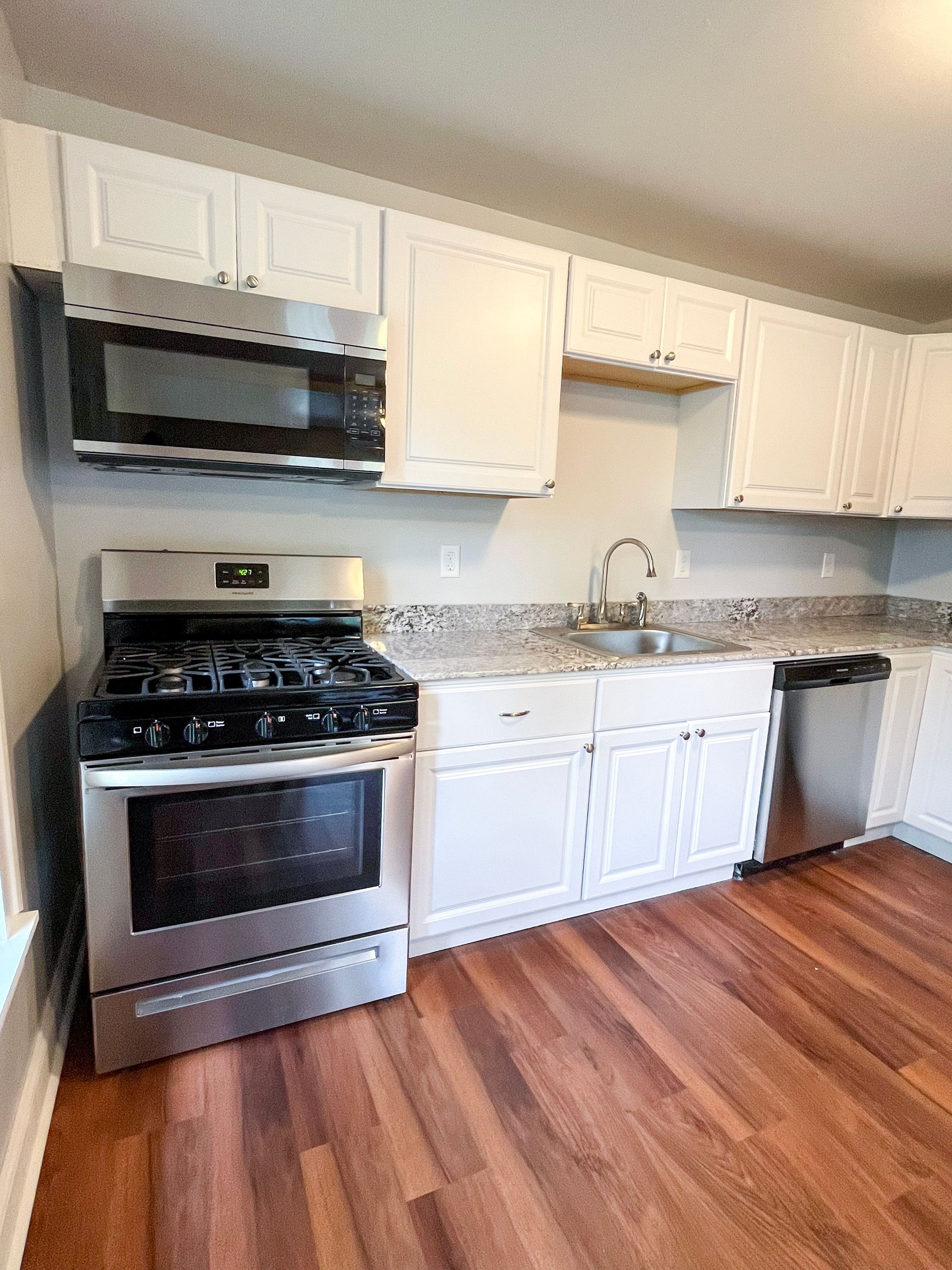 This newly renovated three bedroom apartment with wood and vinyl plank floors throughout features an eat-kitchen with a dishwasher, microwave and table with chairs. The living room features a couch, coffee and end tables, entertainment center, and a 40"-50" flat screen smart TV. There is a full bathroom with a combination tub and shower. The spacious bedrooms all have newer furniture including a 32"-50" smart TV, dresser, desk, office chair, nightstand, and full size bed (mattress/box spring/frame).