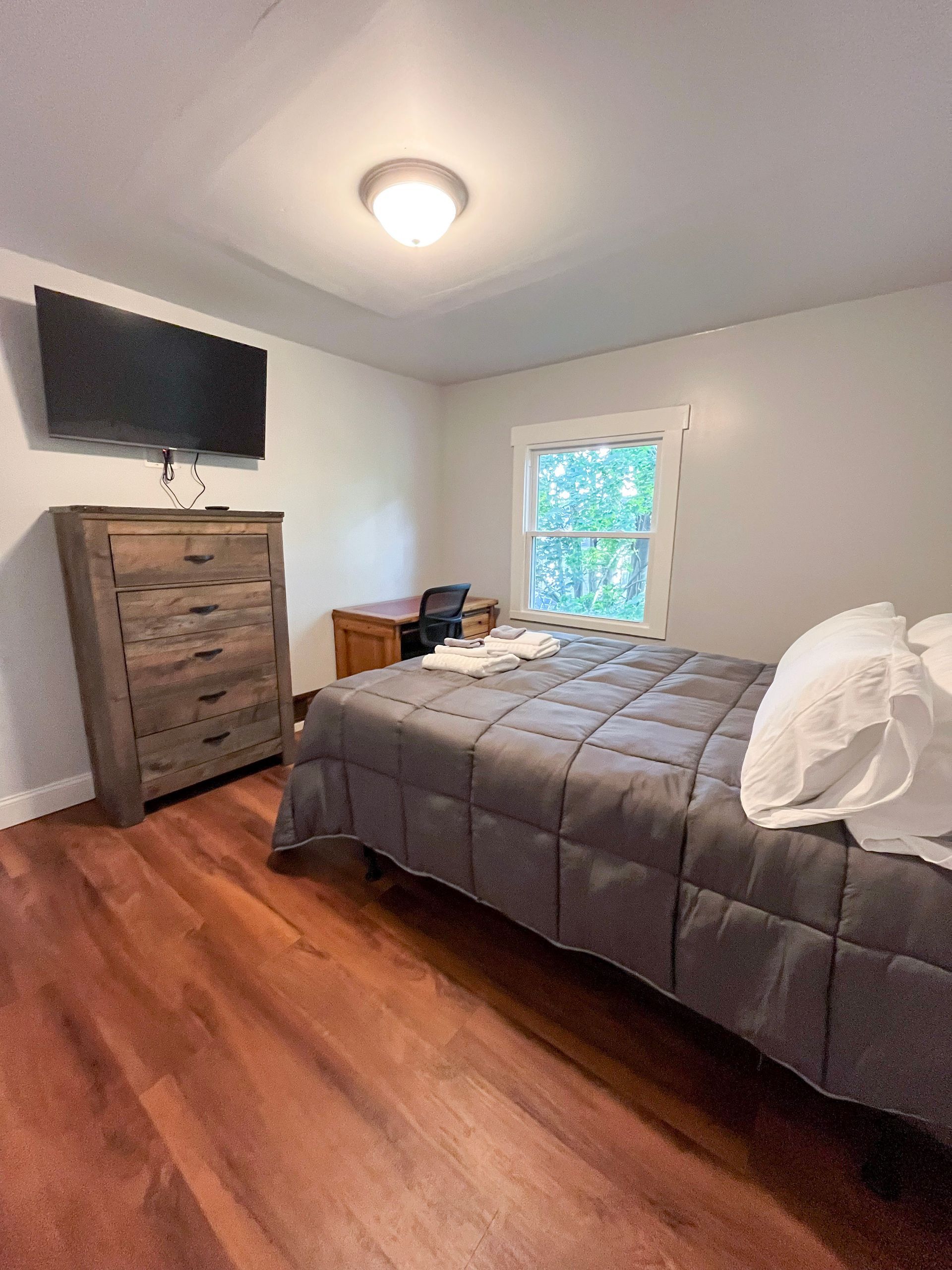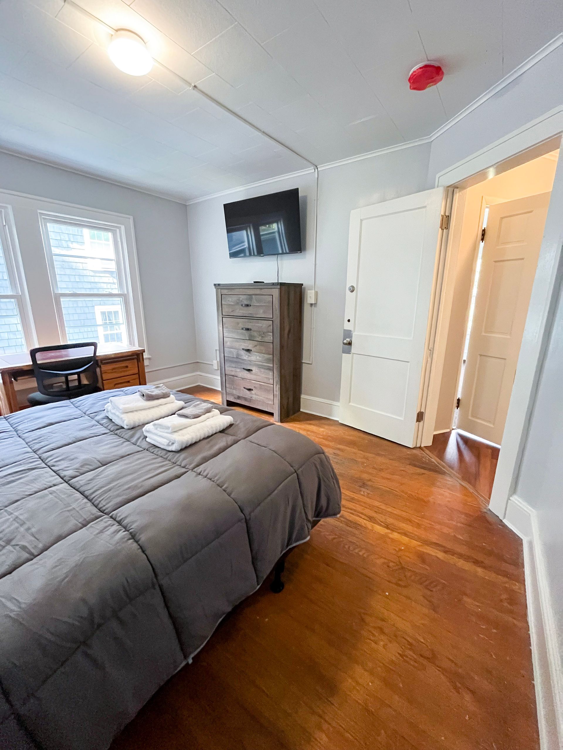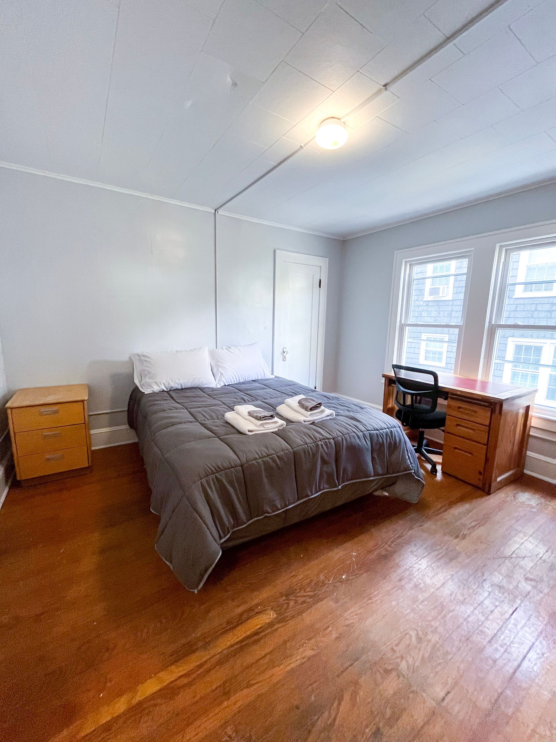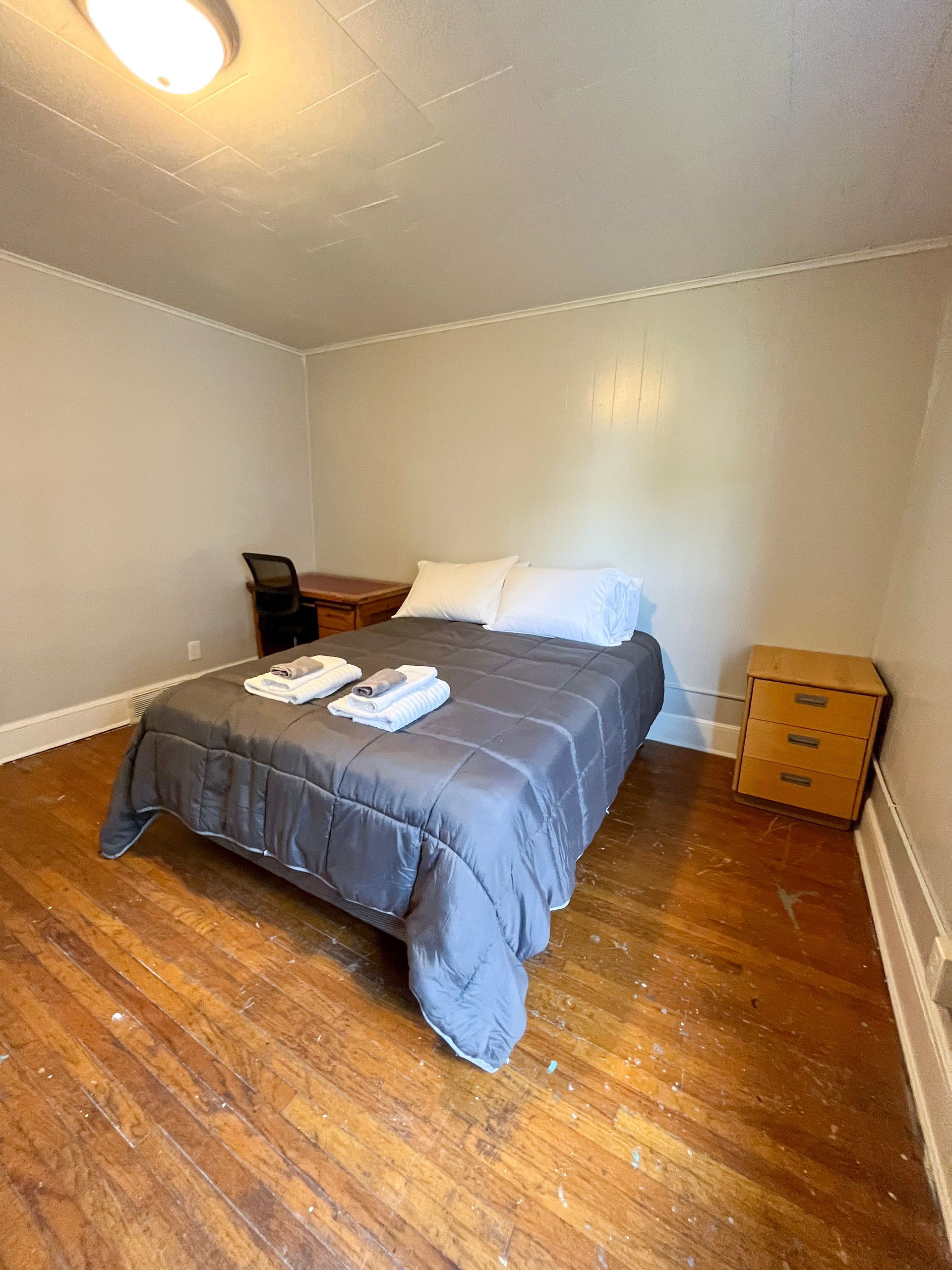 This newly renovated three bedroom apartment with wood and vinyl plank floors throughout features an eat-kitchen with a dishwasher, microwave and table with chairs. The living room features a couch, coffee and end tables, entertainment center, and a 40"-50" flat screen smart TV. There is a full bathroom with a combination tub and shower. The spacious bedrooms all have newer furniture including a 32"-50" smart TV, dresser, desk, office chair, nightstand, and full size bed (mattress/box spring/frame).