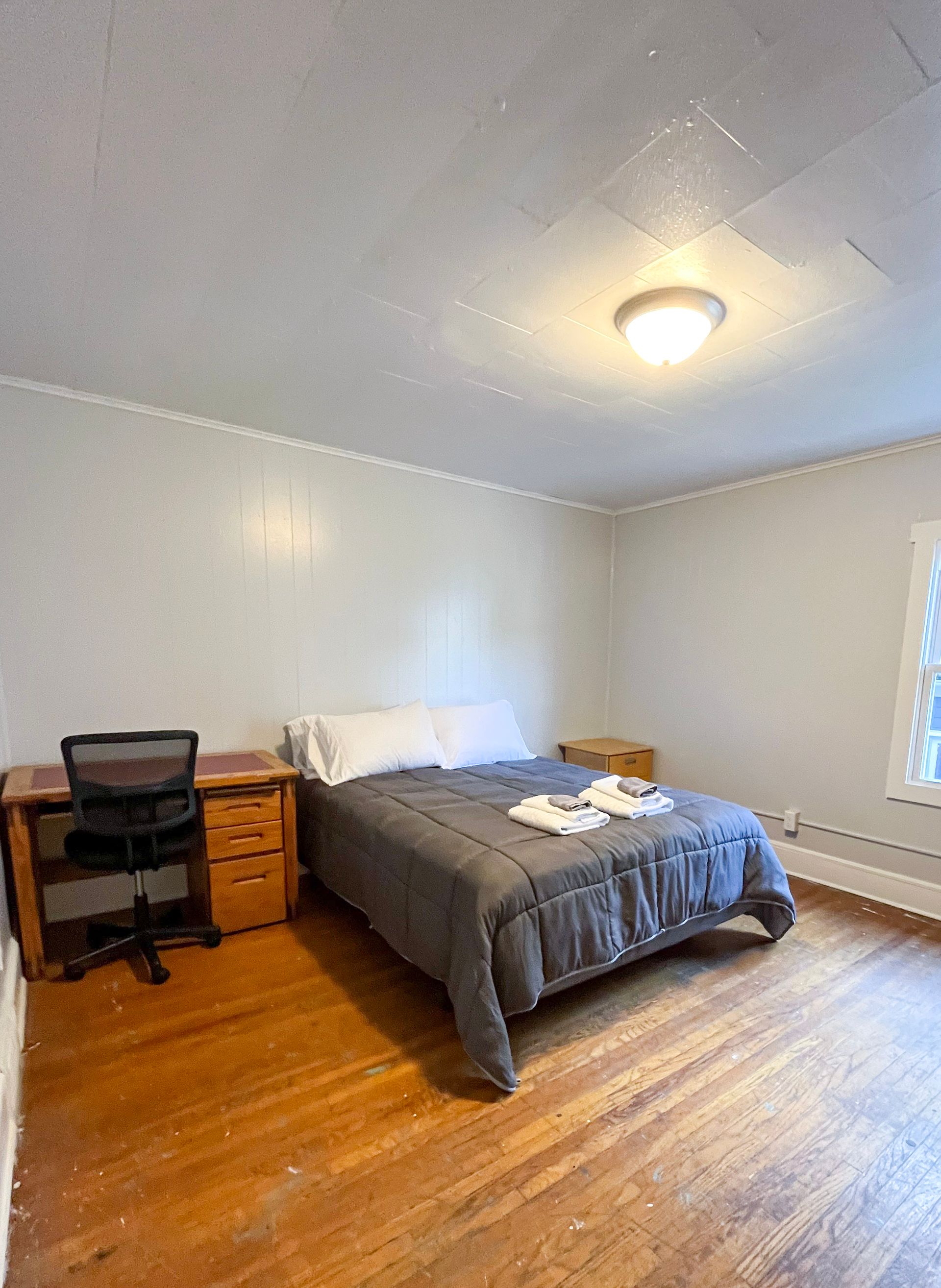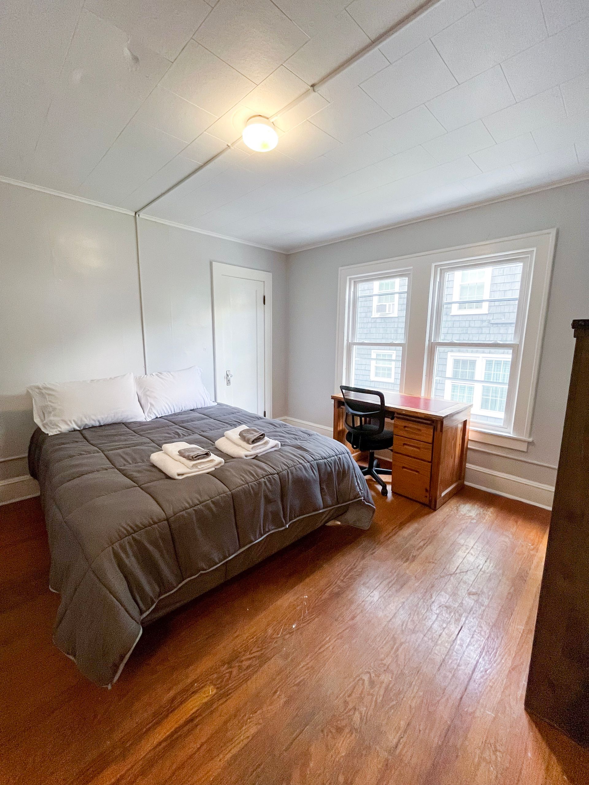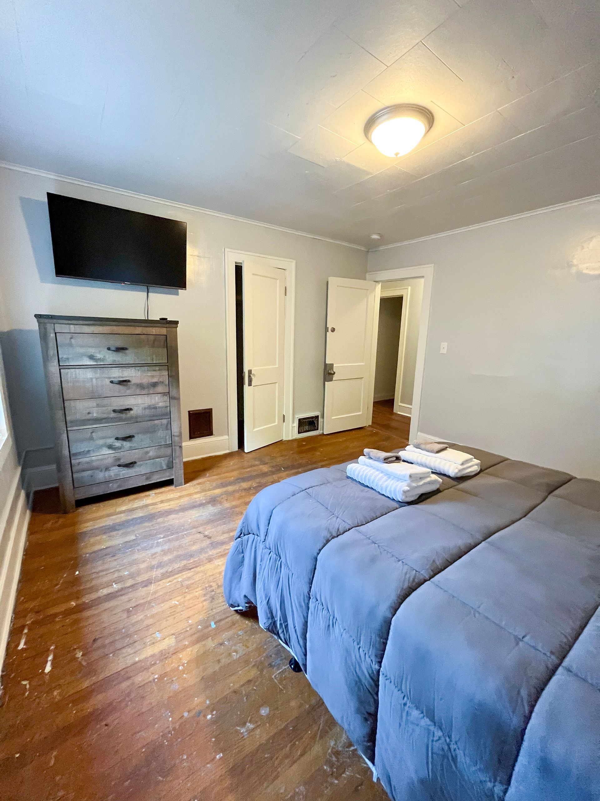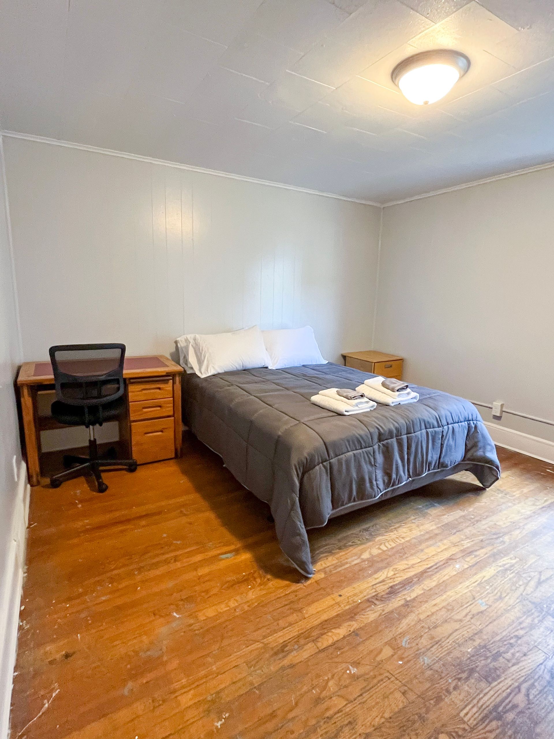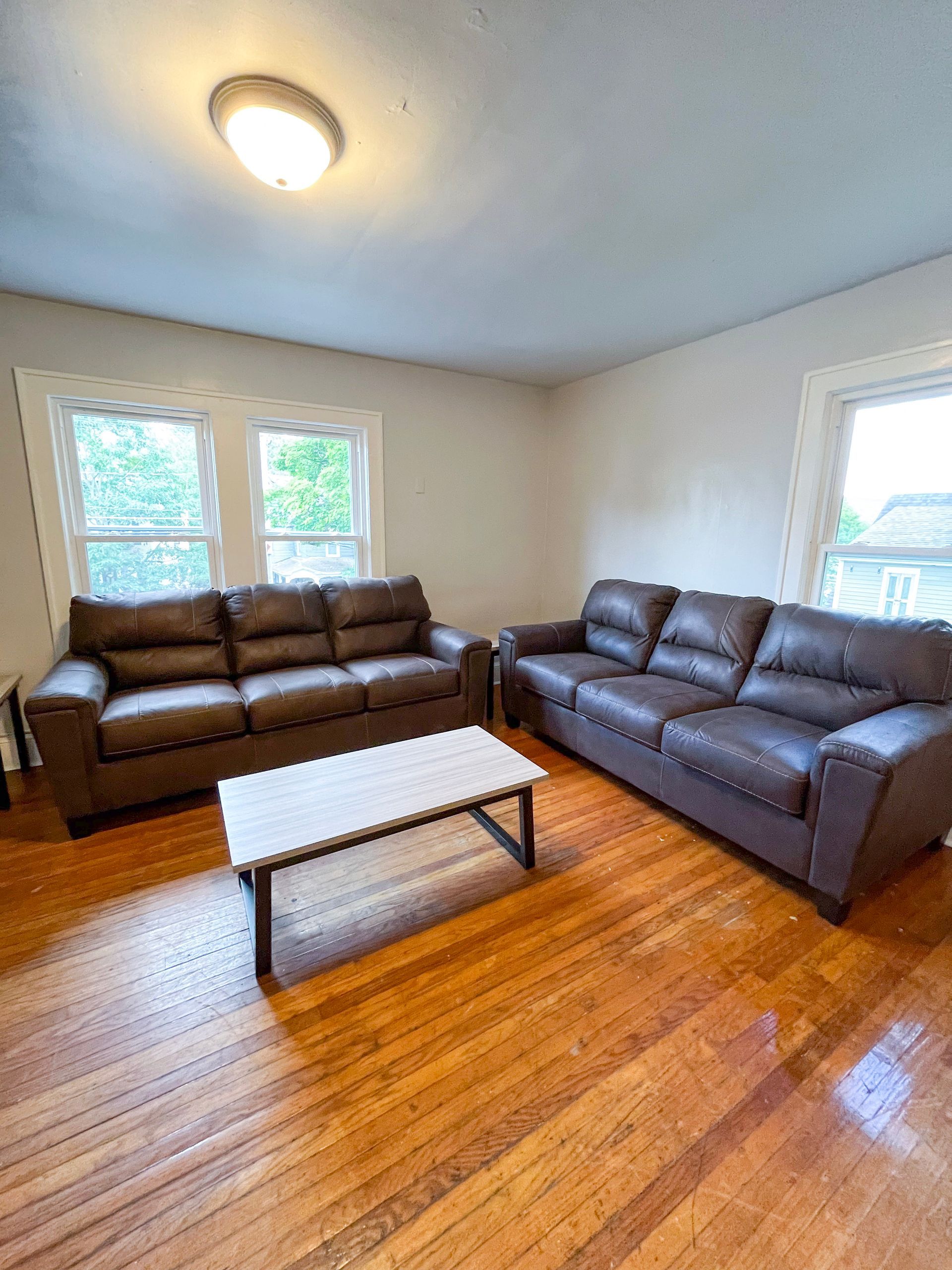This newly renovated three bedroom apartment with wood and vinyl plank floors throughout features an eat-kitchen with a dishwasher, microwave and table with chairs. The living room features a couch, coffee and end tables, entertainment center, and a 40"-50" flat screen smart TV. There is a full bathroom with a combination tub and shower. The spacious bedrooms all have newer furniture including a 32"-50" smart TV, dresser, desk, office chair, nightstand, and full size bed (mattress/box spring/frame).