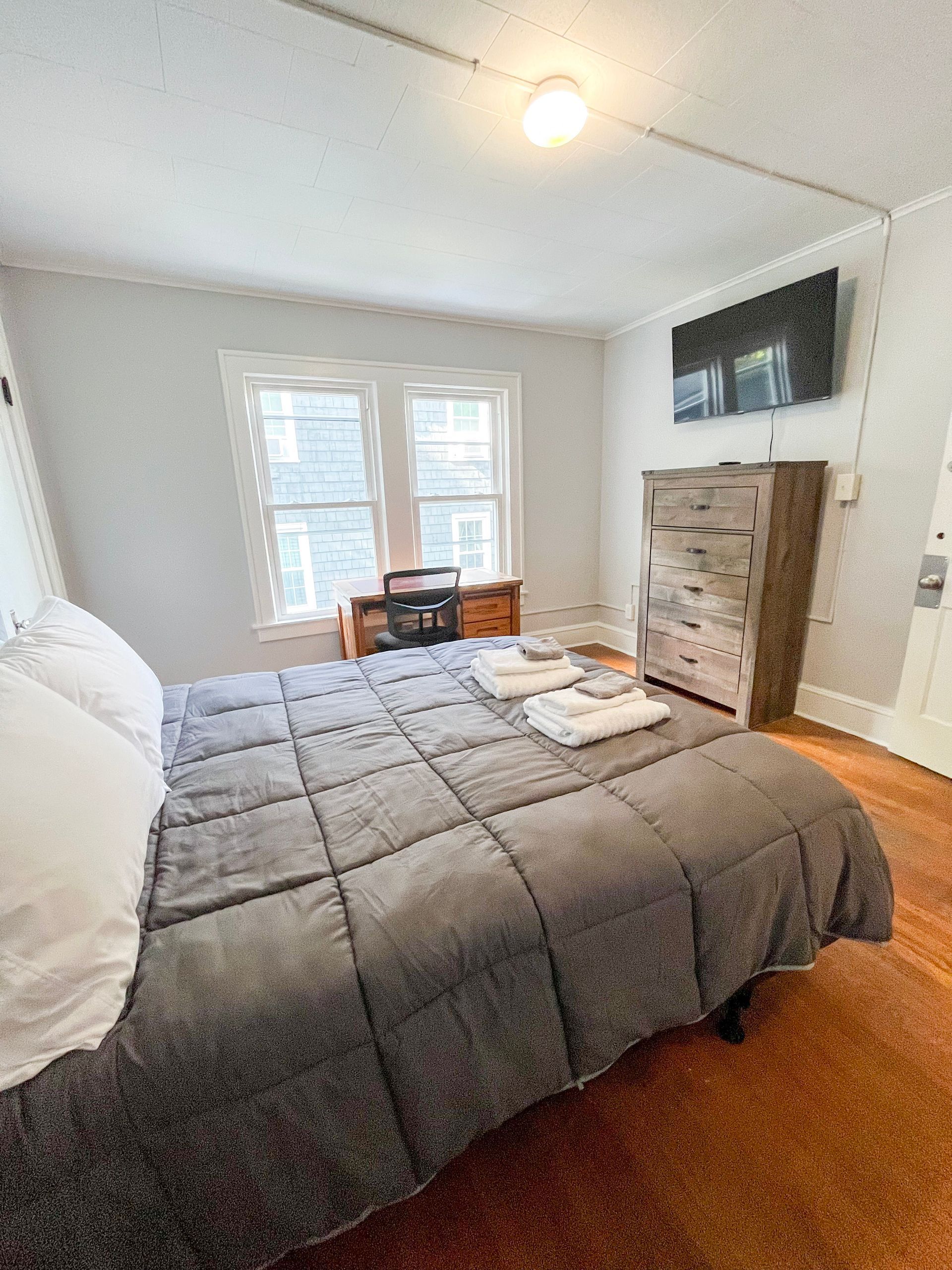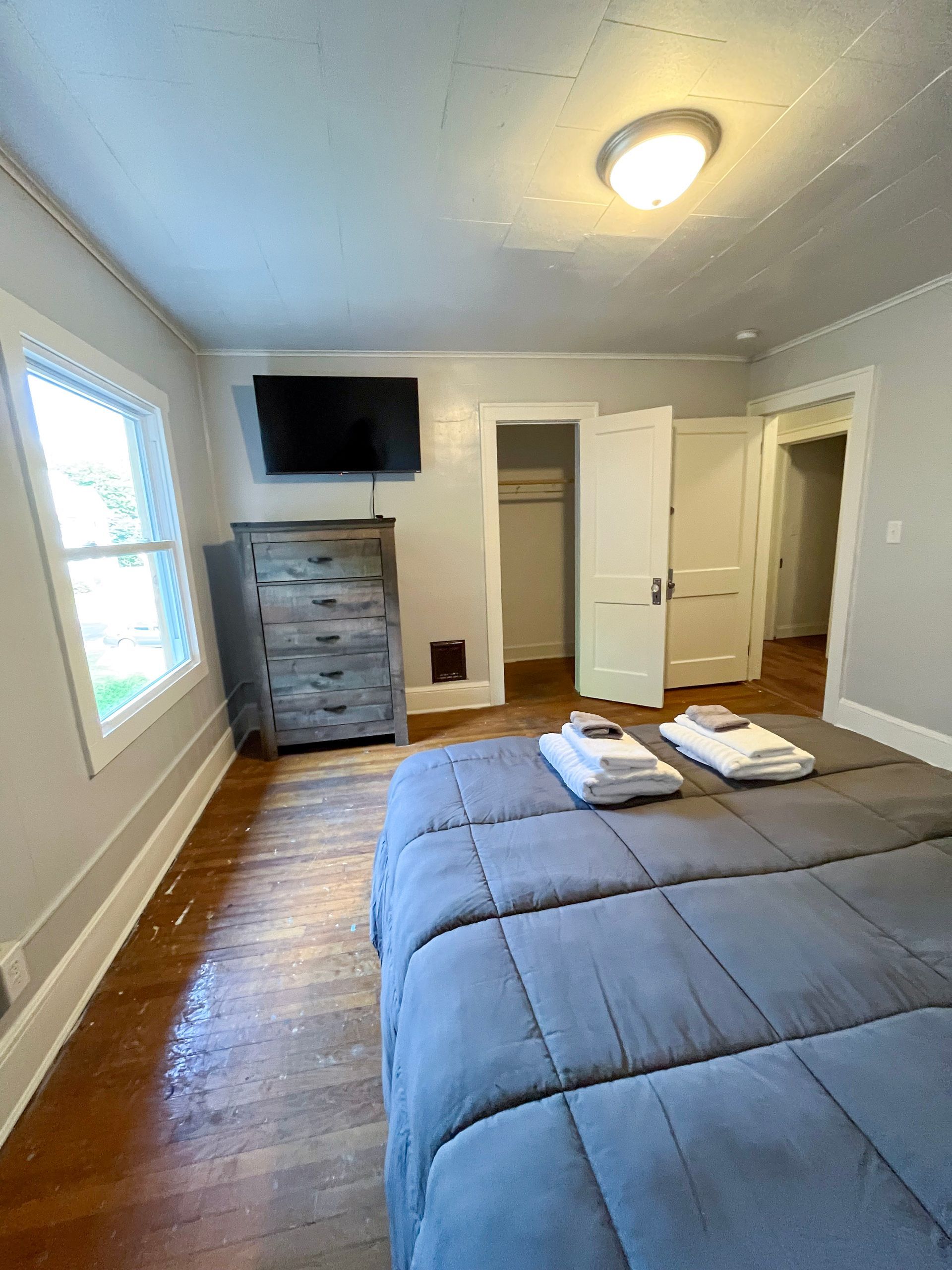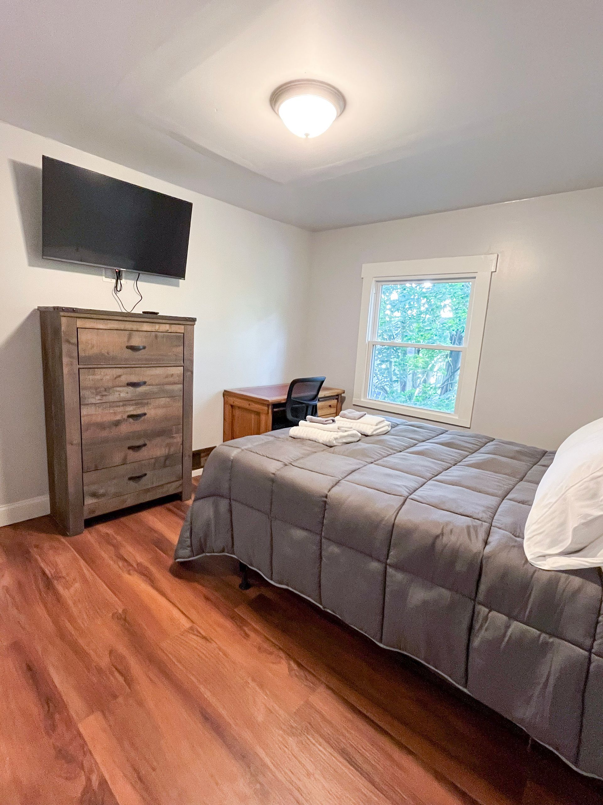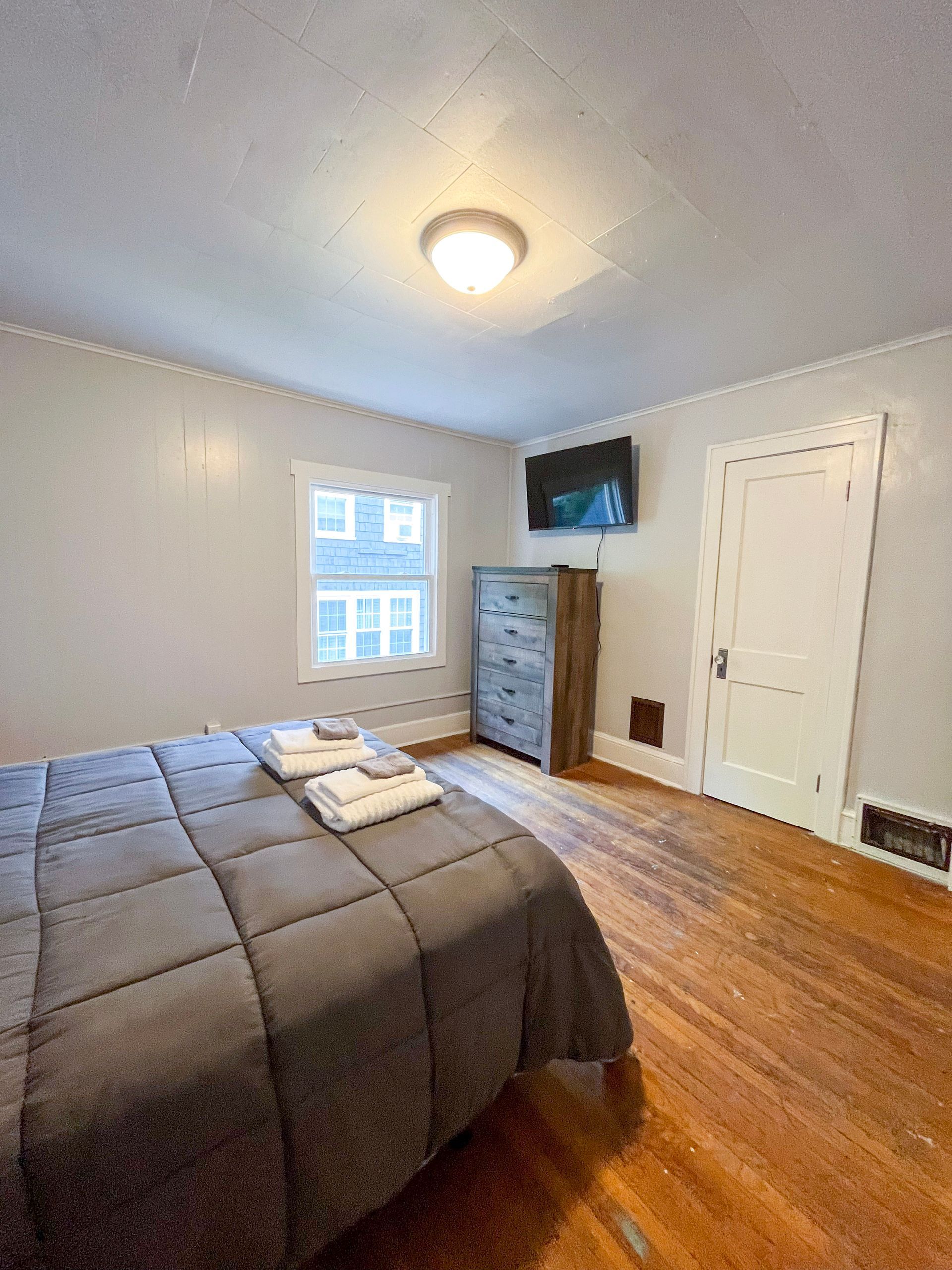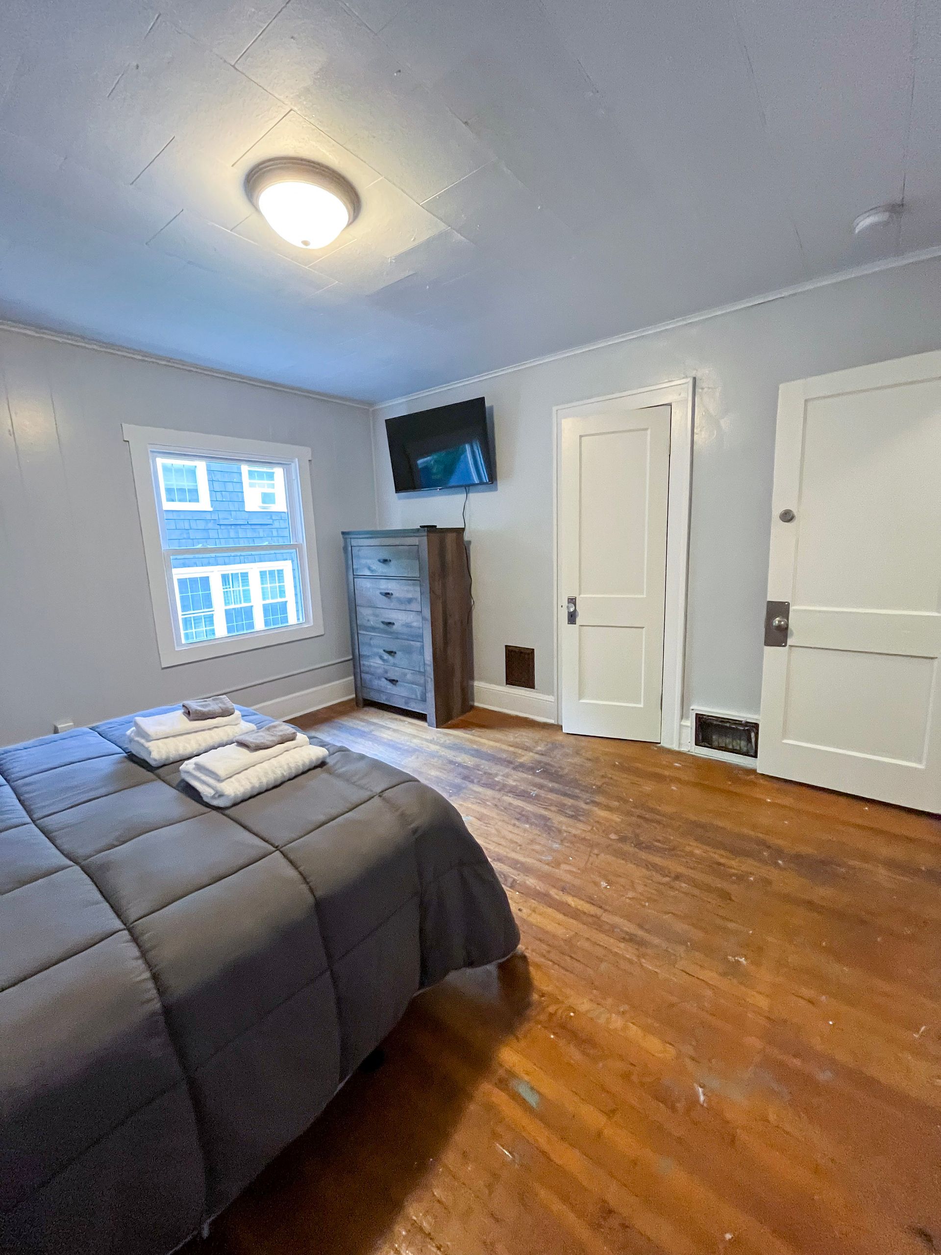 This newly renovated three bedroom apartment with wood and vinyl plank floors throughout features an eat-kitchen with a dishwasher, microwave and table with chairs. The living room features a couch, coffee and end tables, entertainment center, and a 40"-50" flat screen smart TV. There is a full bathroom with a combination tub and shower. The spacious bedrooms all have newer furniture including a 32"-50" smart TV, dresser, desk, office chair, nightstand, and full size bed (mattress/box spring/frame).