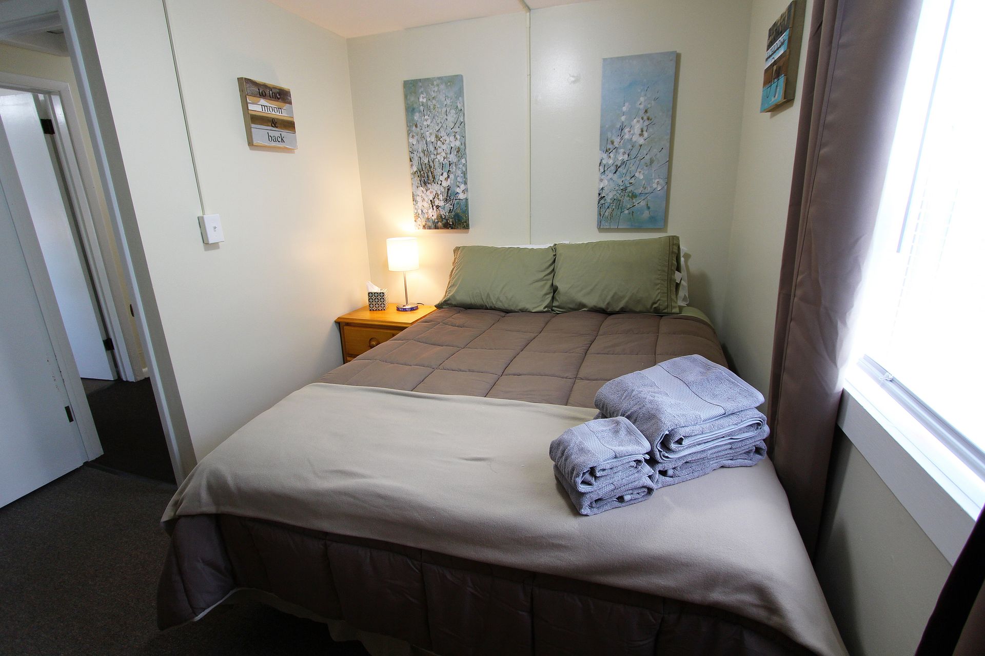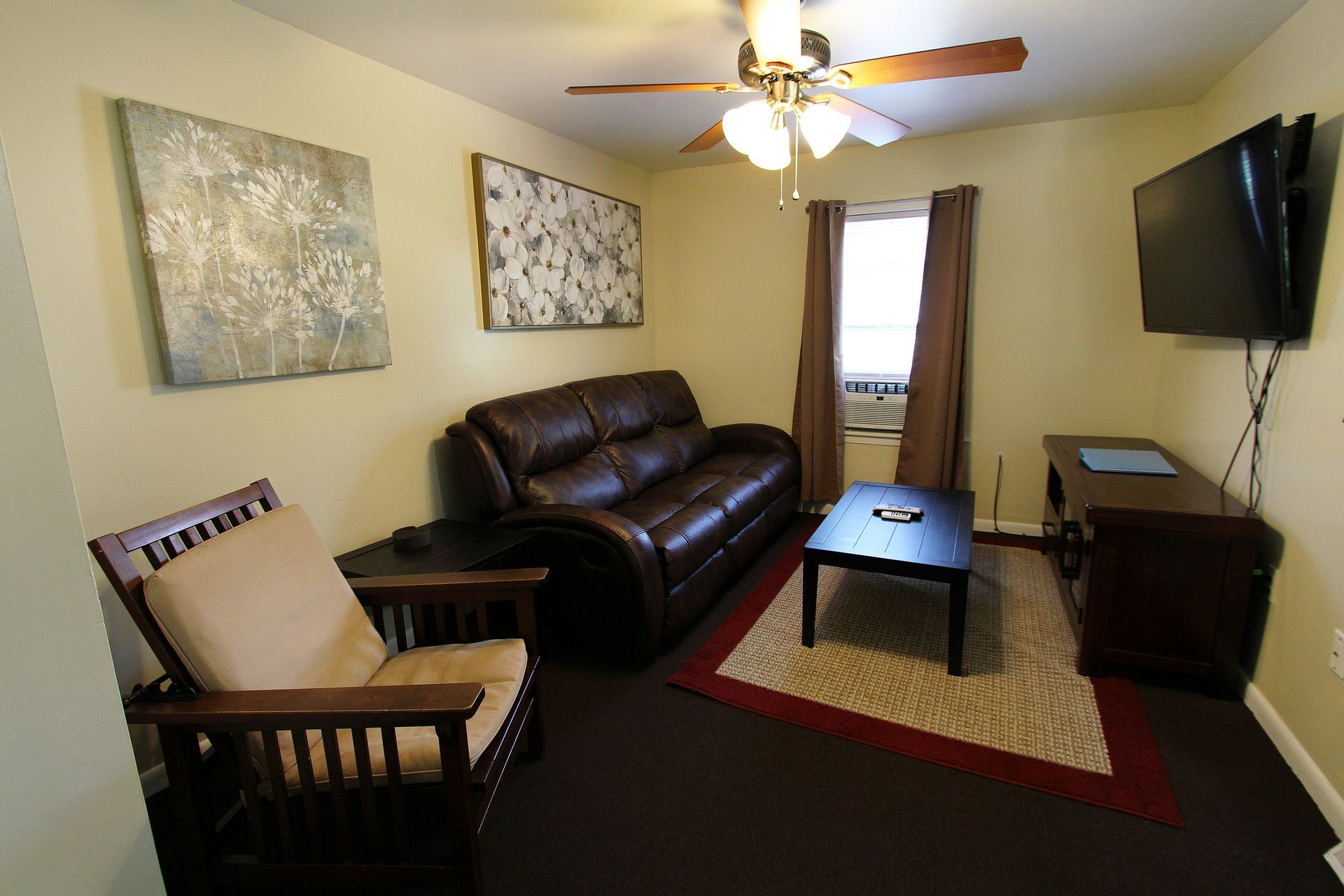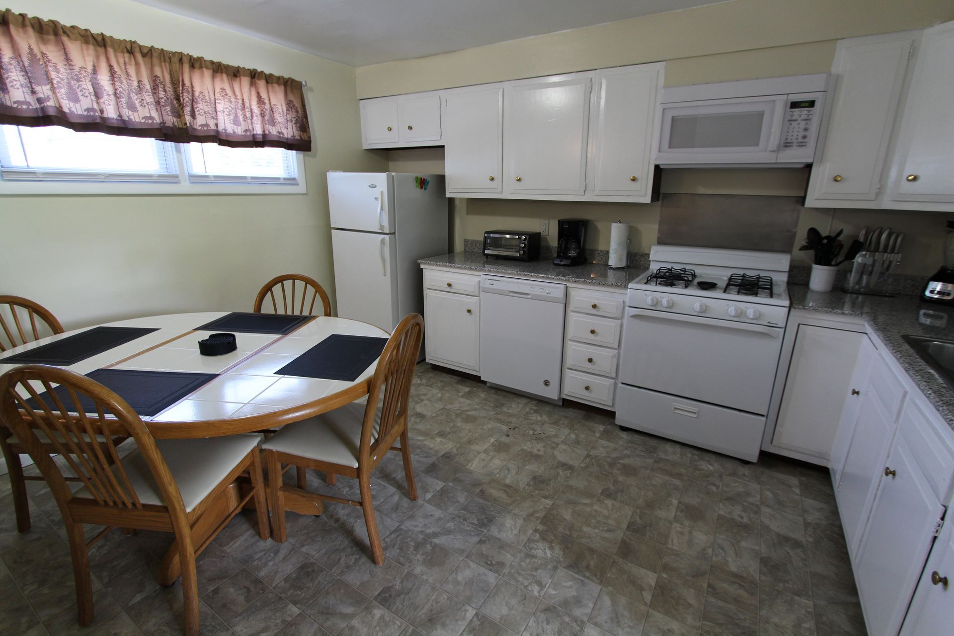 The second floor two bedroom fully carpeted apartment offers a second floor deck, an eat-in kitchen with an abundance of cabinets, granite countertops, dishwasher, microwave and a table with chairs. The living room has a couch and a chair, coffee and end table, entertainment stand and 40"-50" flat screen TV. There is a full bathroom with a combination tub and shower. The two nicely sized bedrooms have newer furniture including a 32"-50" TV, dresser, desk, office chair, nightstand, and a queen size bed (mattress/box spring/frame).