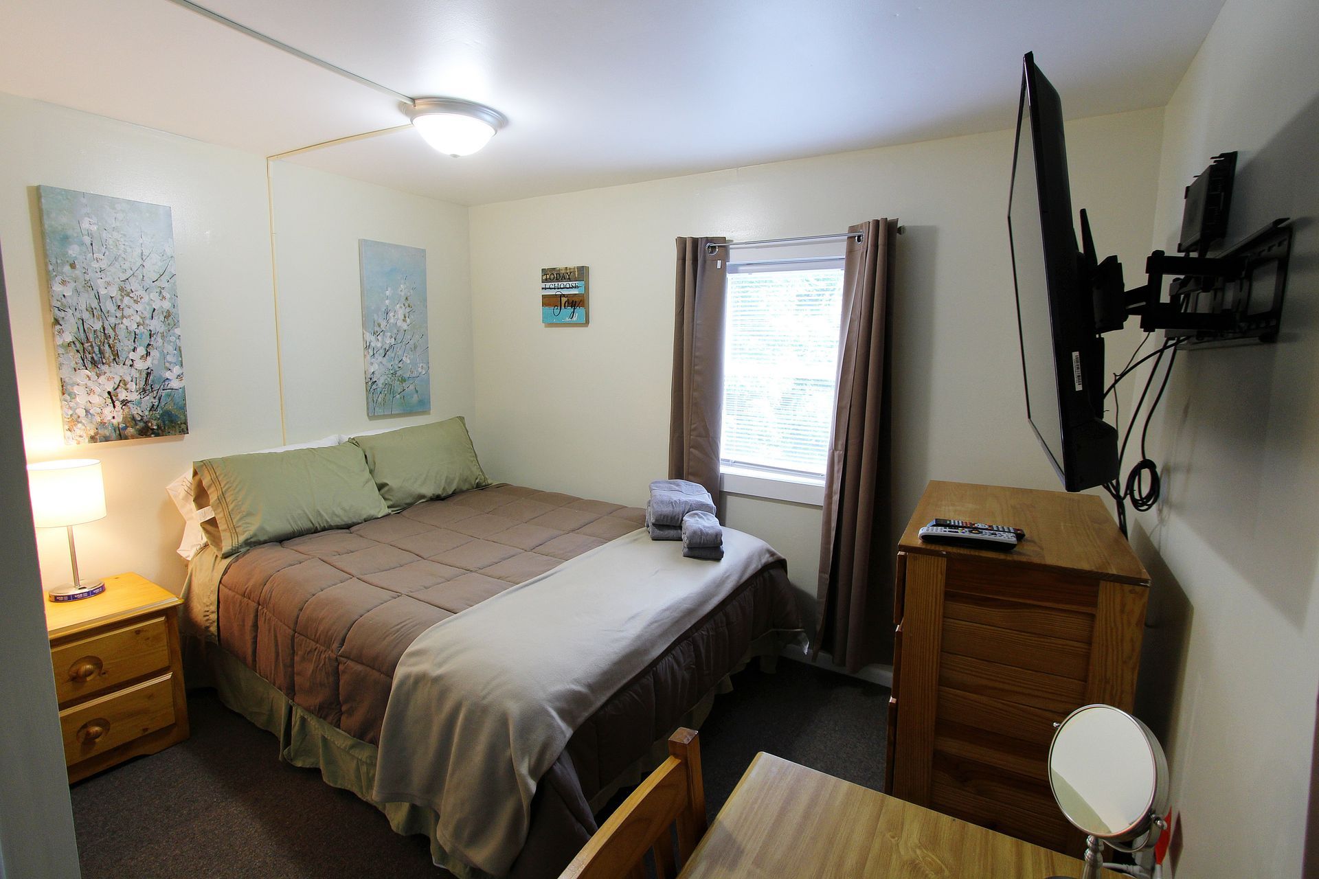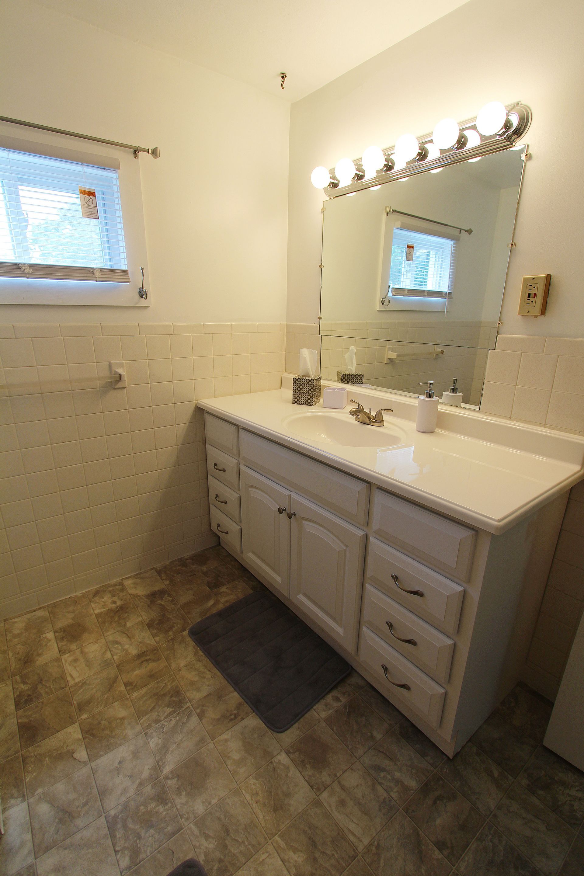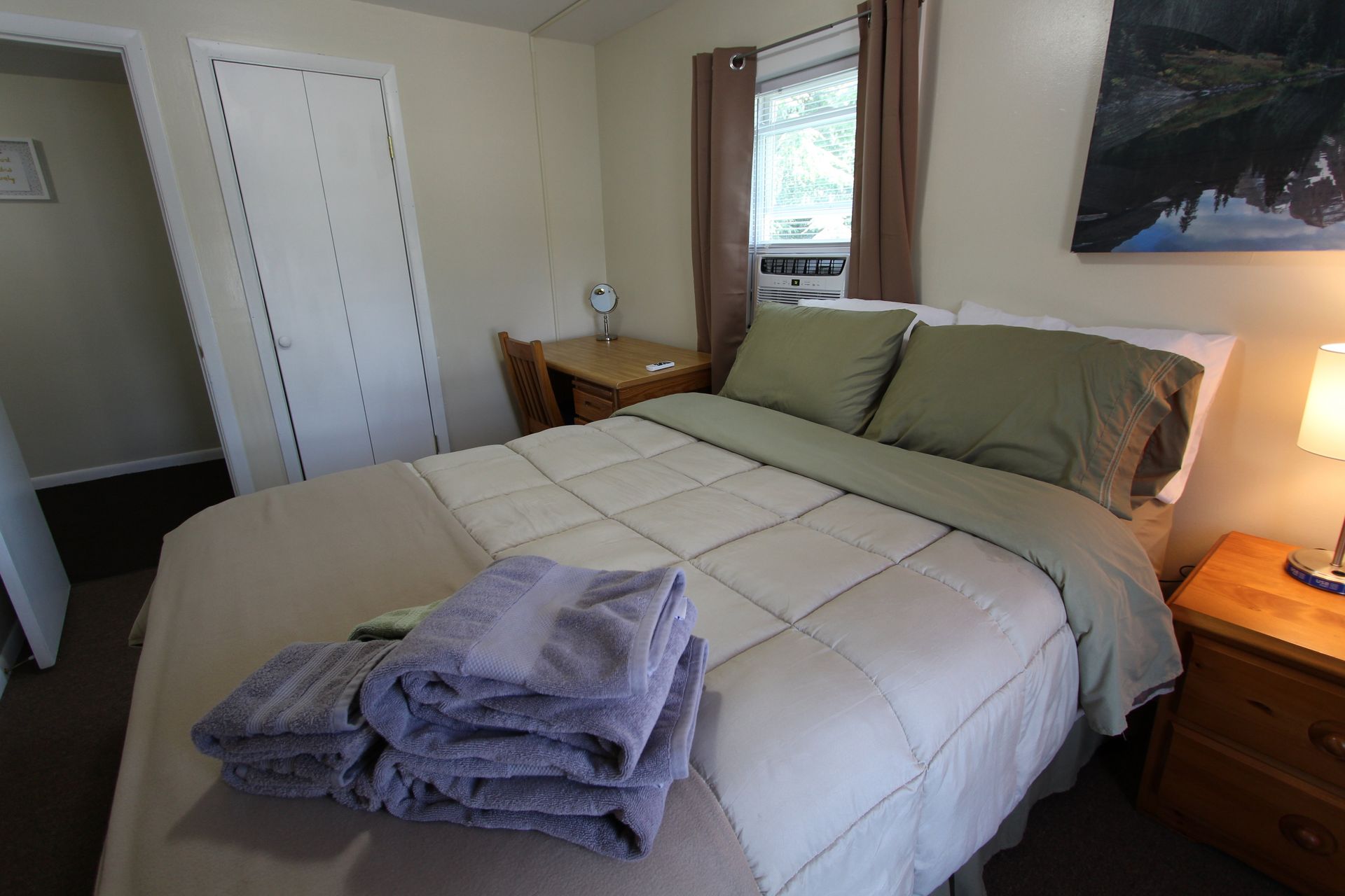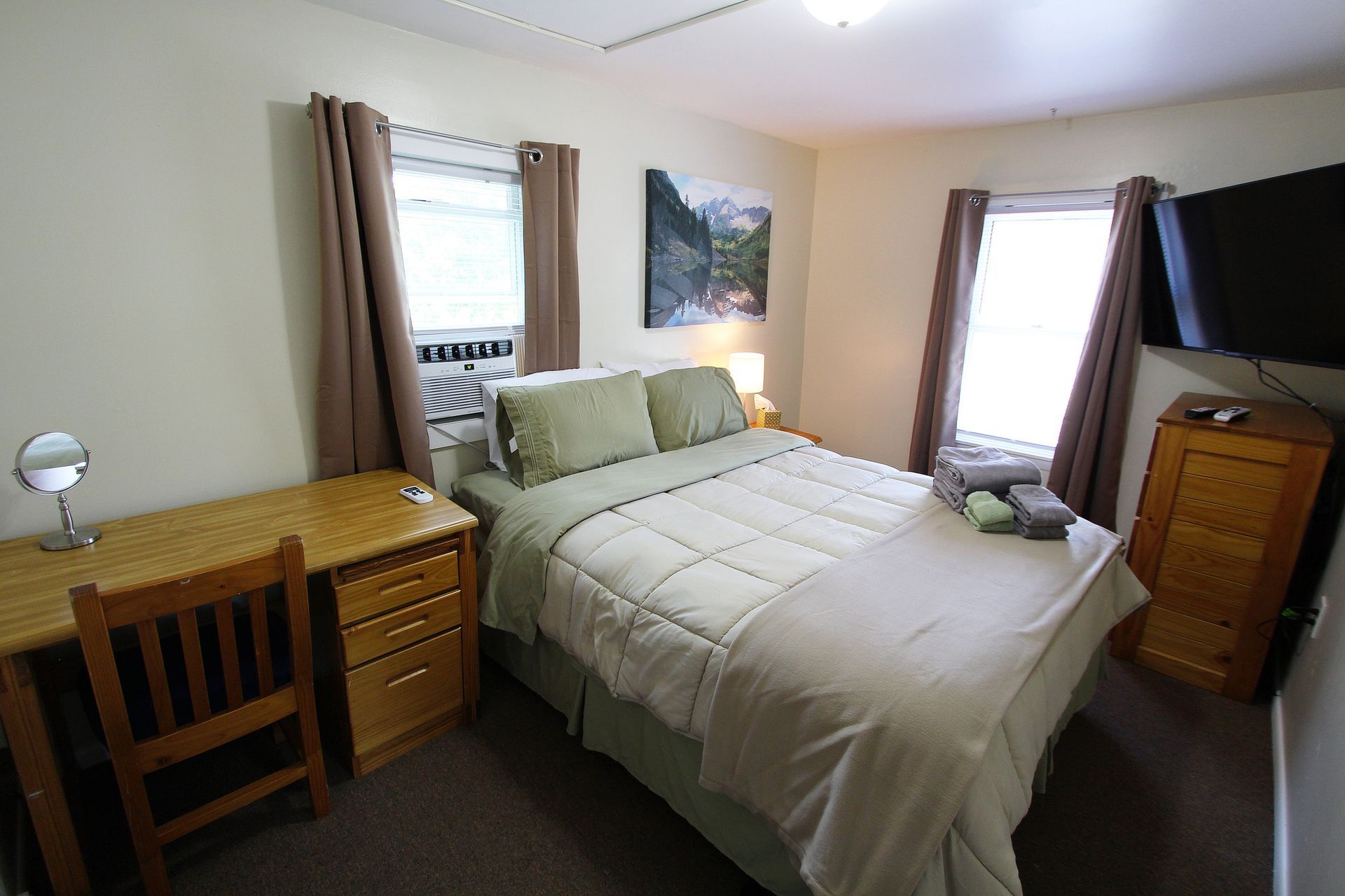 The second floor two bedroom fully carpeted apartment offers a second floor deck, an eat-in kitchen with an abundance of cabinets, granite countertops, dishwasher, microwave and a table with chairs. The living room has a couch and a chair, coffee and end table, entertainment stand and 40"-50" flat screen TV. There is a full bathroom with a combination tub and shower. The two nicely sized bedrooms have newer furniture including a 32"-50" TV, dresser, desk, office chair, nightstand, and a queen size bed (mattress/box spring/frame).