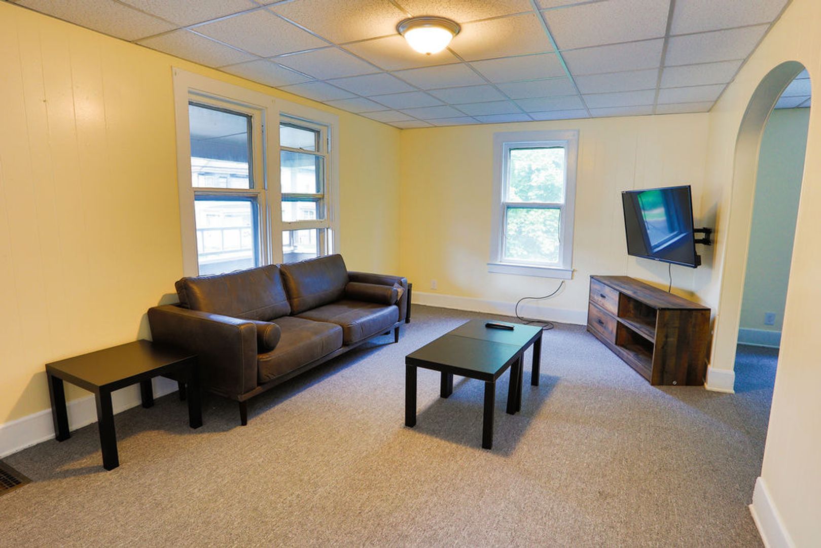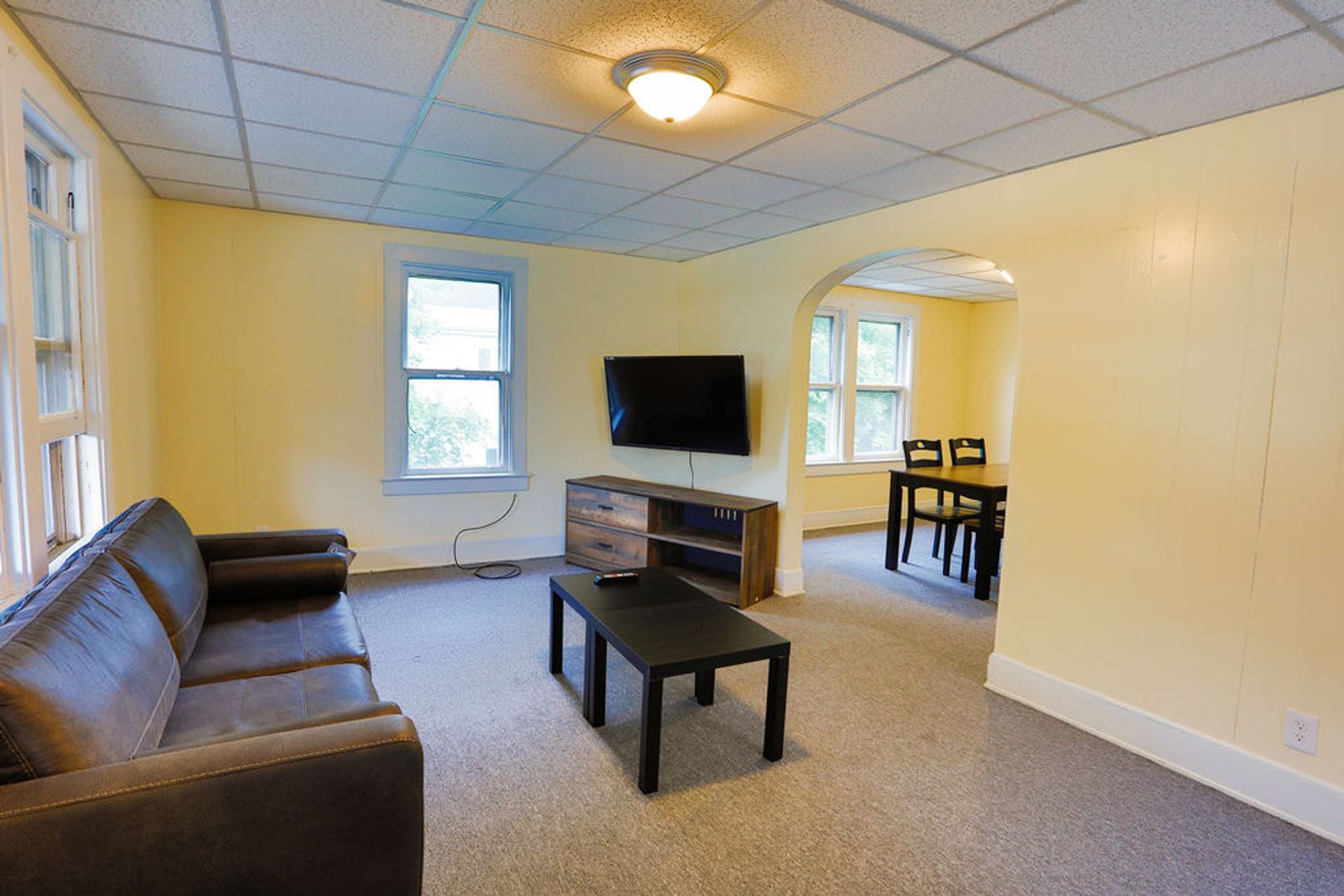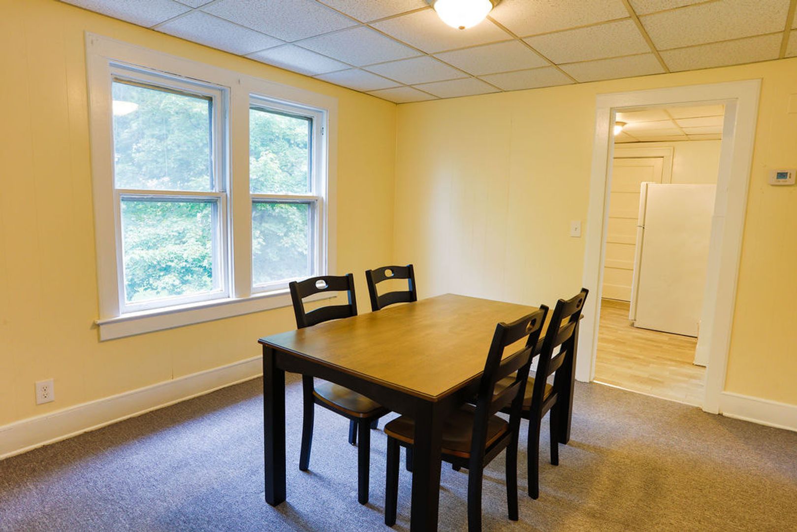 Welcome to this charming second-floor two-bedroom apartment, offering a comfortable and convenient living space in a prime location. The kitchen is equipped with a microwave and dishwasher for your culinary needs, while the separate dining room provides a cozy setting for meals with a table and chairs. In the spacious living room, you'll find two comfortable couches, a coffee and end table, an entertainment center, and a 50" flat-screen TV, creating the perfect space for relaxation and entertainment. The full bathroom includes a combination tub and shower for added convenience. Both bedrooms are furnished with newer pieces, including a TV, ensuring comfort and entertainment for all residents. Outside, you can enjoy the front porch, back porches, and a balcony, providing additional space for relaxation and enjoyment of the surroundings. Conveniently located on the corner of East and Center Street, the apartment is just a short walk to downtown Main Street, restaurants, and stores, with Center Street Deli just steps away. Close proximity to the college campus and bus routes adds to the convenience of this prime location, making it an ideal choice for comfortable and accessible living.