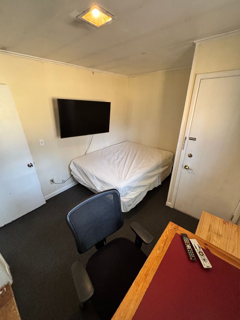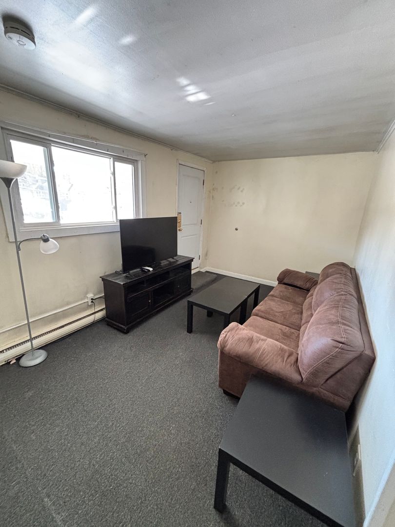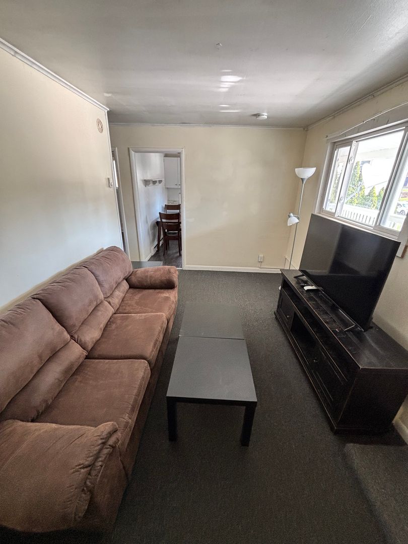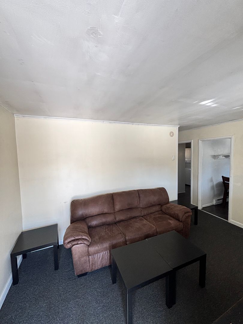 This fully carpeted one-bedroom apartment offers an eat-in kitchen equipped with a microwave and a table accompanied by chairs. In the living room, you'll find a comfortable couch, coffee and end tables, a desk with an office chair, an entertainment center, and a 40"-50" flat-screen TV. The full bathroom features a combination tub and shower, with the washer and dryer conveniently situated within. The nicely sized bedroom is furnished with modern amenities, including a 32"-50" TV, a dresser, a nightstand, and a full-size bed complete with mattress, box spring, and frame.