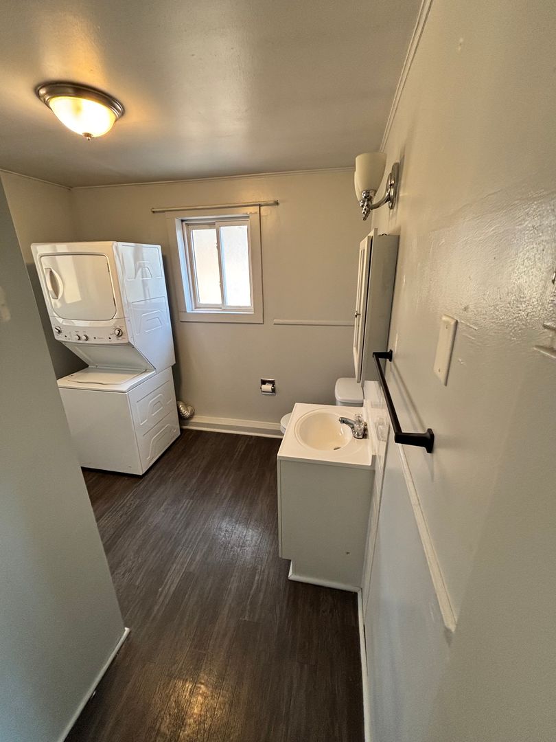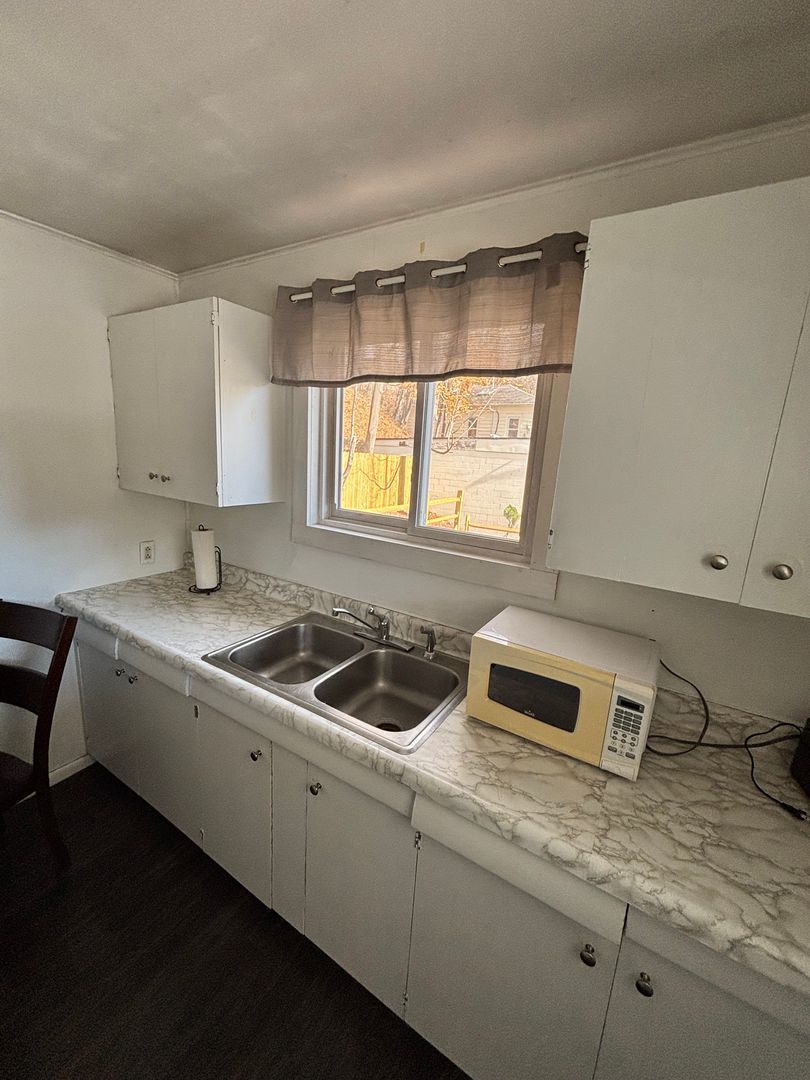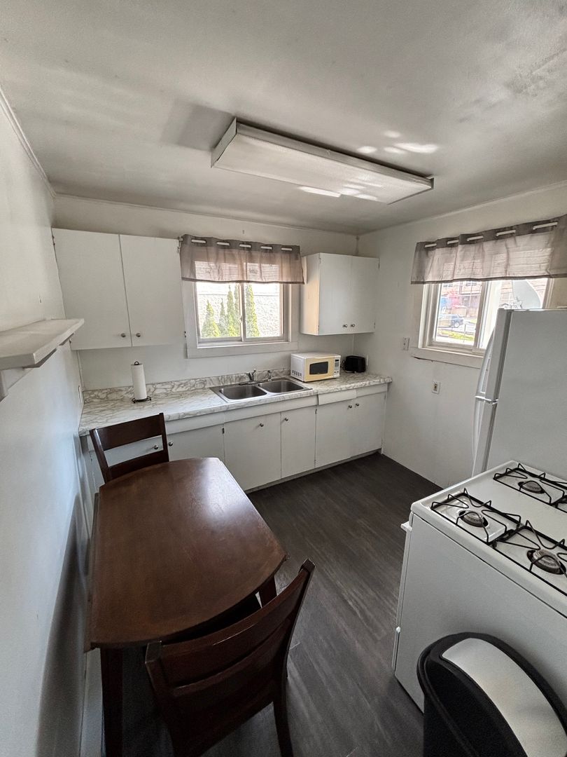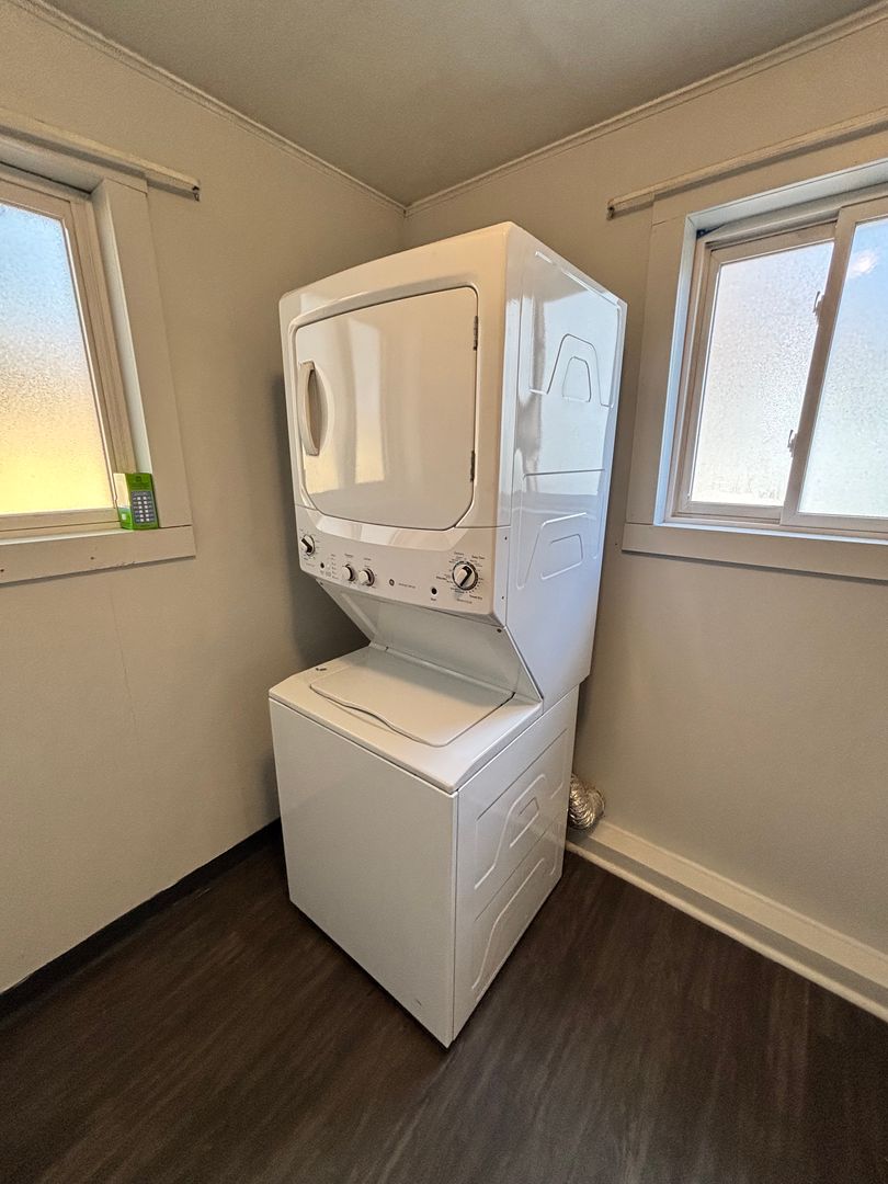 This fully carpeted one-bedroom apartment offers an eat-in kitchen equipped with a microwave and a table accompanied by chairs. In the living room, you'll find a comfortable couch, coffee and end tables, a desk with an office chair, an entertainment center, and a 40"-50" flat-screen TV. The full bathroom features a combination tub and shower, with the washer and dryer conveniently situated within. The nicely sized bedroom is furnished with modern amenities, including a 32"-50" TV, a dresser, a nightstand, and a full-size bed complete with mattress, box spring, and frame.