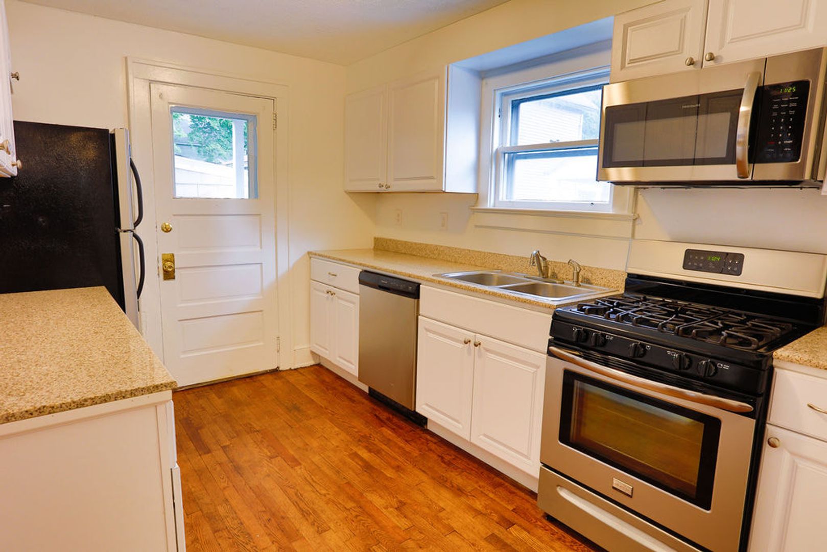 This ground-floor two-bedroom apartment offers a kitchen equipped with a microwave and dishwasher. Adjacent to the kitchen is a separate dining room furnished with a table and chairs. The living room provides ample seating with two couches, a coffee and end table, an entertainment center, and a 50" flat-screen TV. A full bathroom with a combination tub and shower serves the apartment. Both bedrooms are furnished with modern amenities, including a 50" TV, a dresser, a desk with an office chair, a nightstand, and a full-size bed complete with mattress, box spring, and frame.