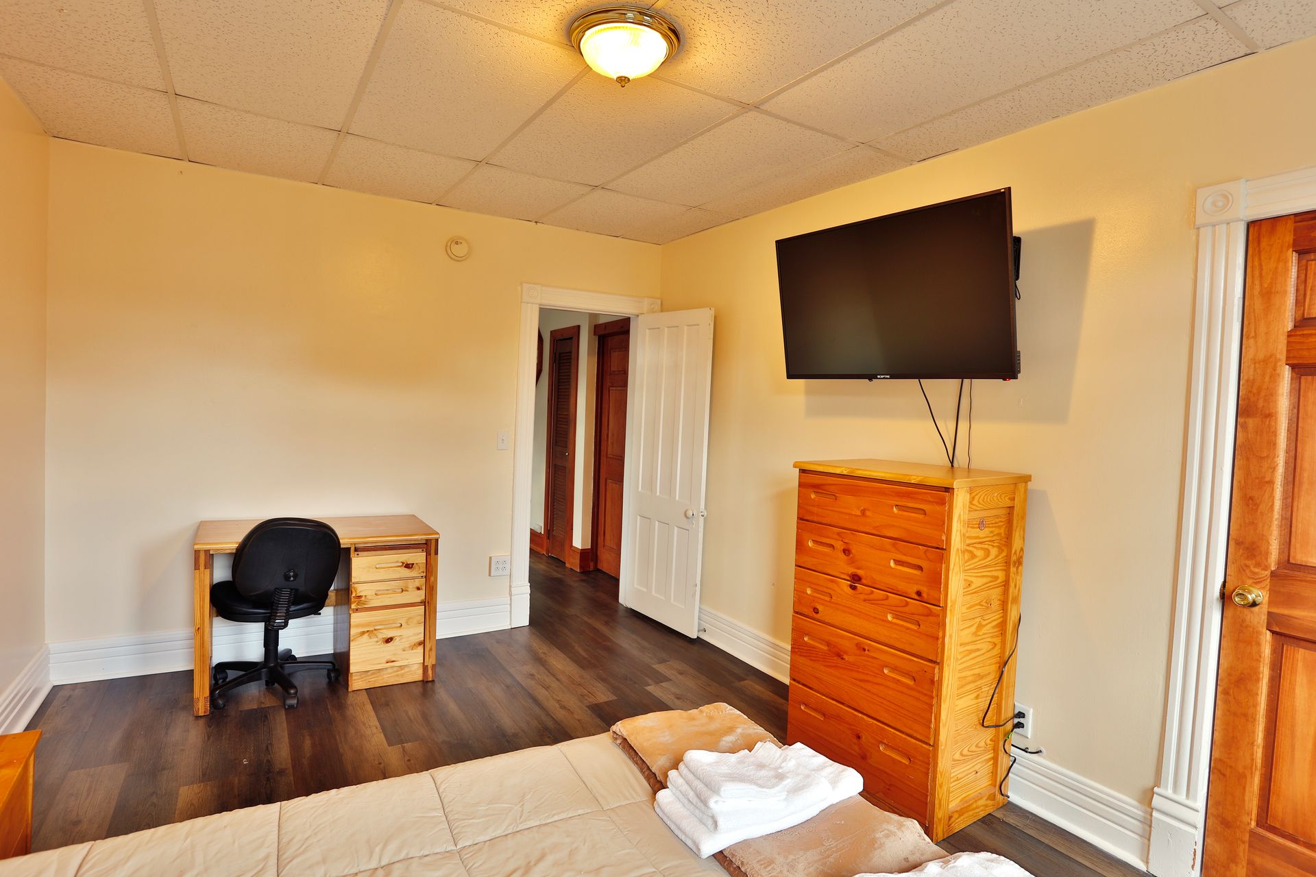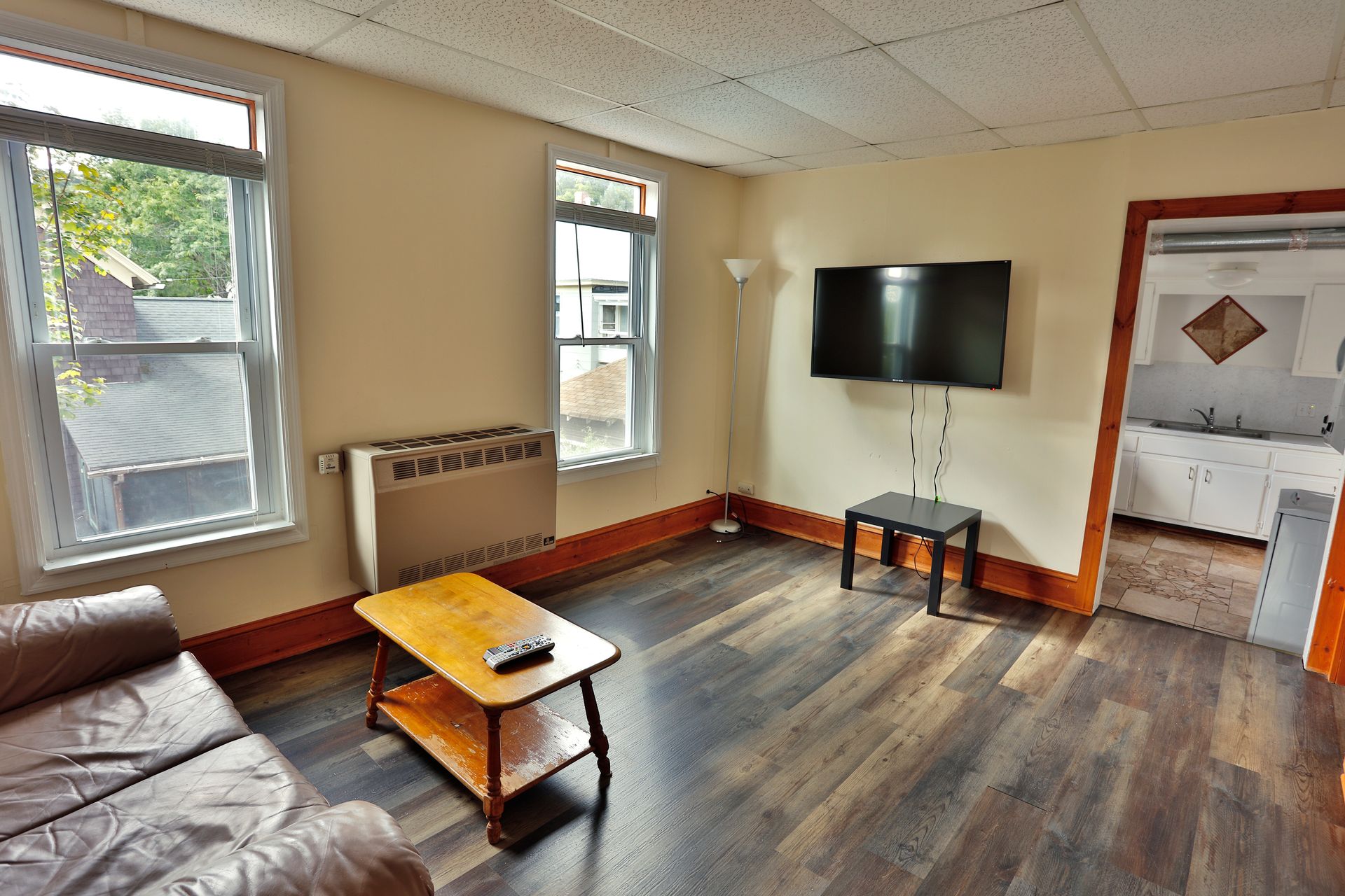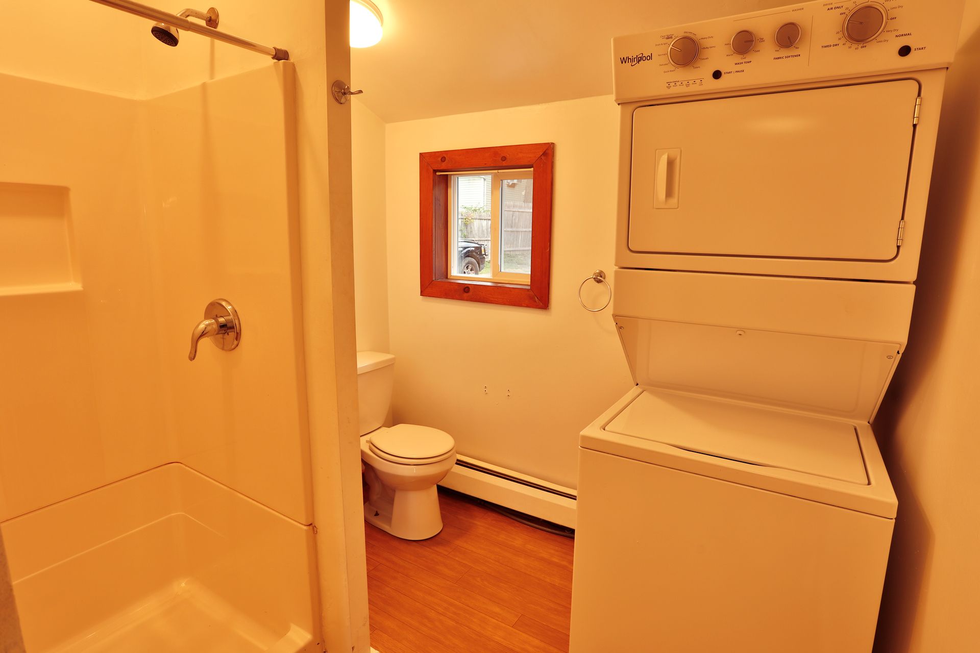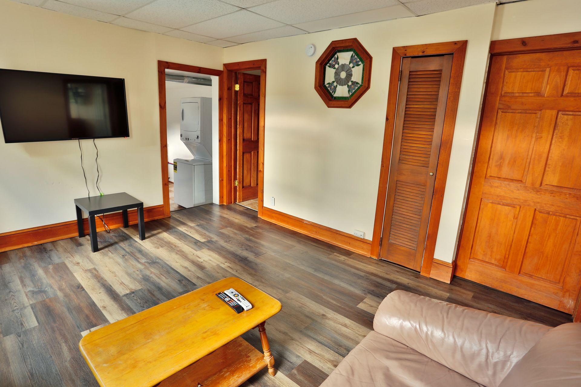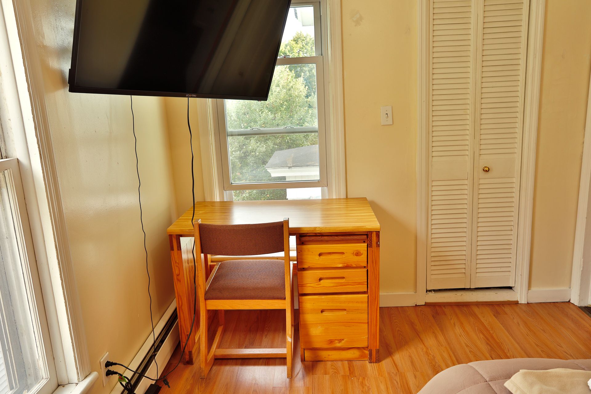 This first floor one bedroom apartment features a kitchen with a microwave. The dining area has a table with chairs. The spacious living room has a couch, coffee and end tables, entertainment center, and a 50" flat screen TV! The washer and dryer is in the living room closet. There is a full bathroom with a combination tub and shower. The nicely sized bedroom has newer furniture including a 32"-50" TV, dresser, desk, office chair, nightstand, and queen size bed (mattress/box spring/frame).