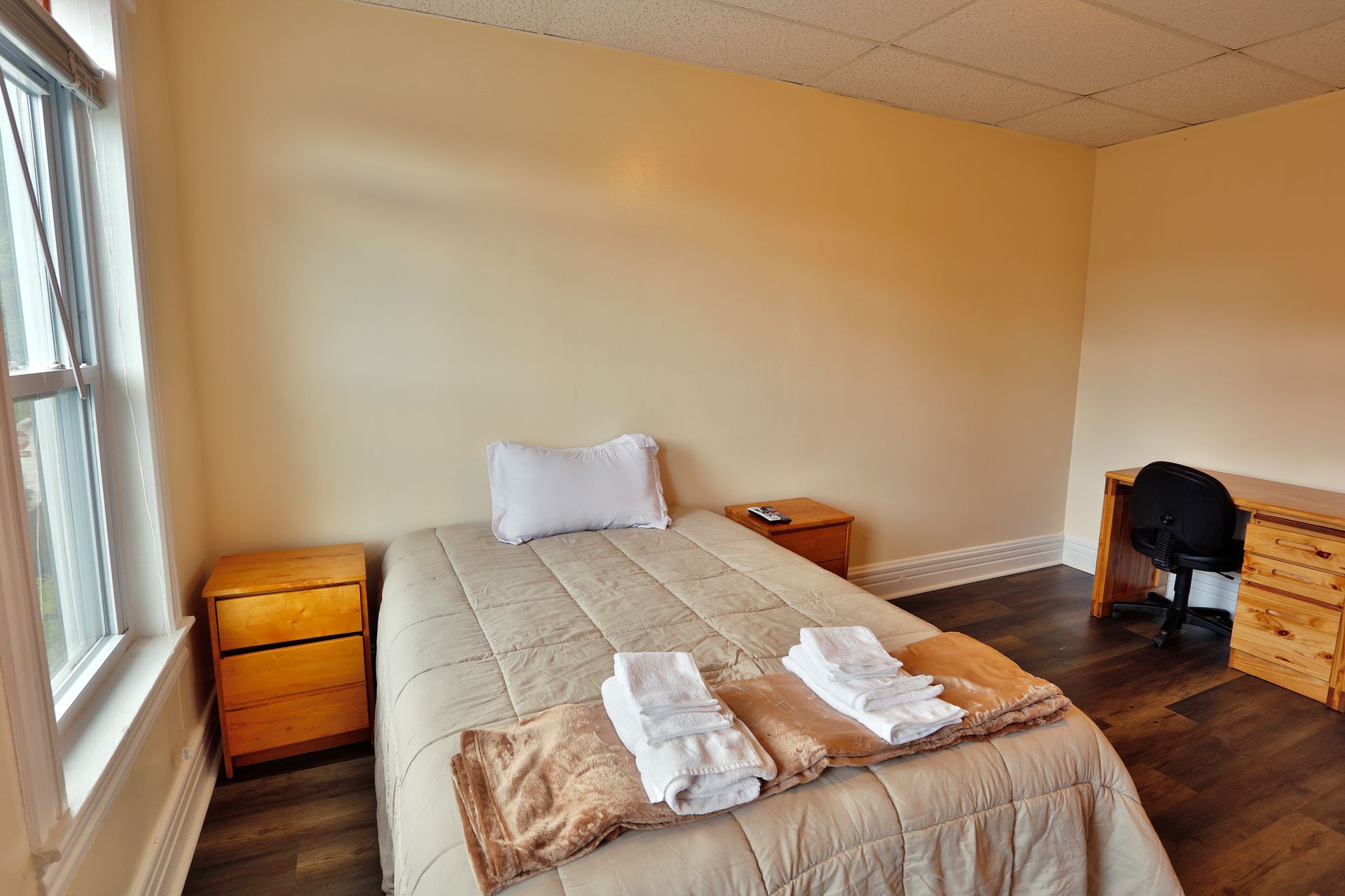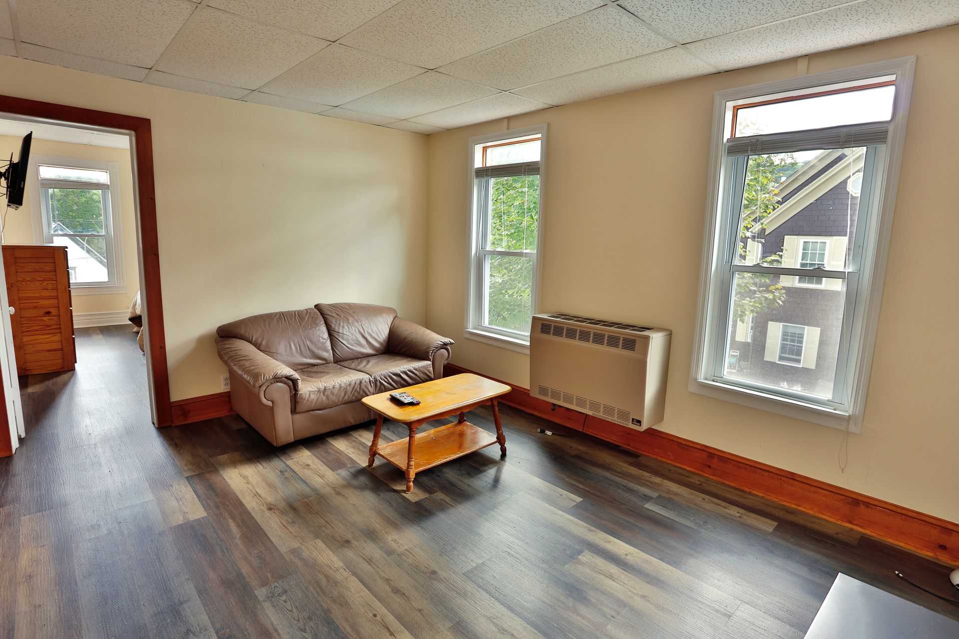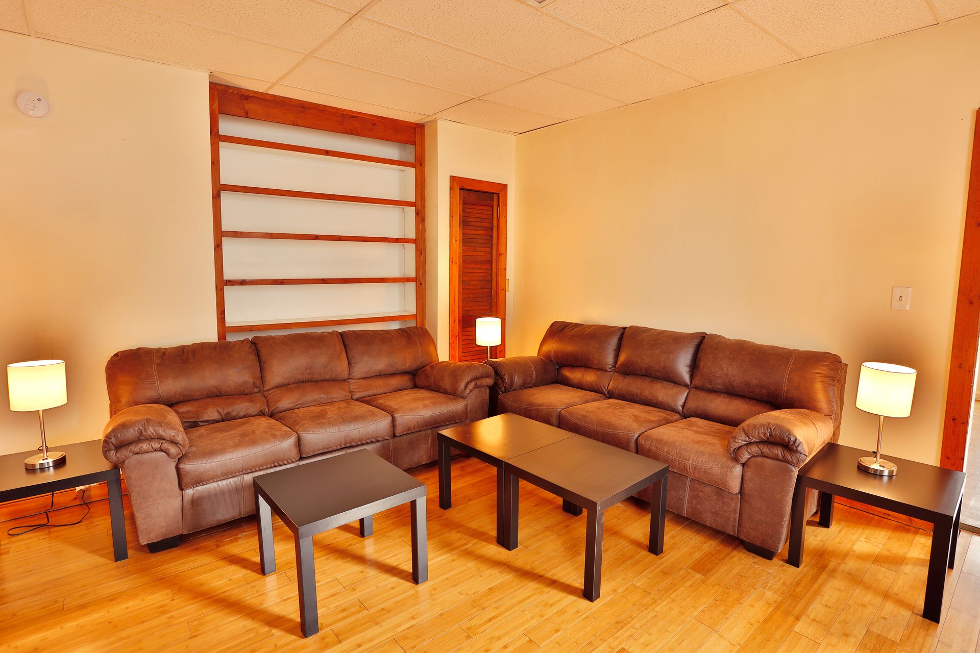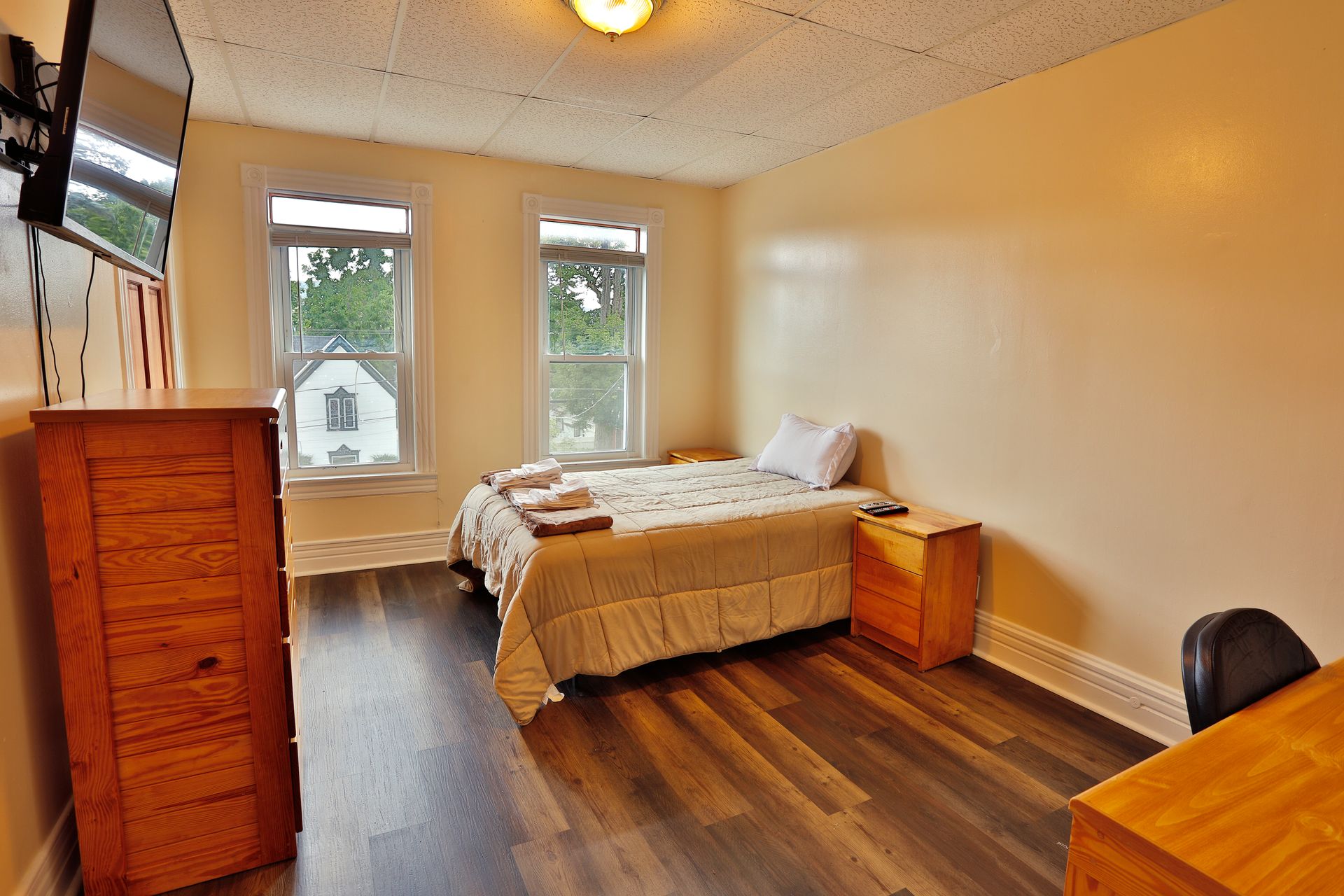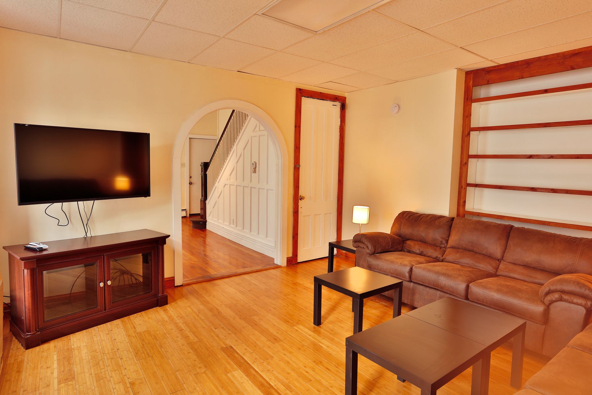 This first floor one bedroom apartment features a kitchen with a microwave. The dining area has a table with chairs. The spacious living room has a couch, coffee and end tables, entertainment center, and a 50" flat screen TV! The washer and dryer is in the living room closet. There is a full bathroom with a combination tub and shower. The nicely sized bedroom has newer furniture including a 32"-50" TV, dresser, desk, office chair, nightstand, and queen size bed (mattress/box spring/frame).