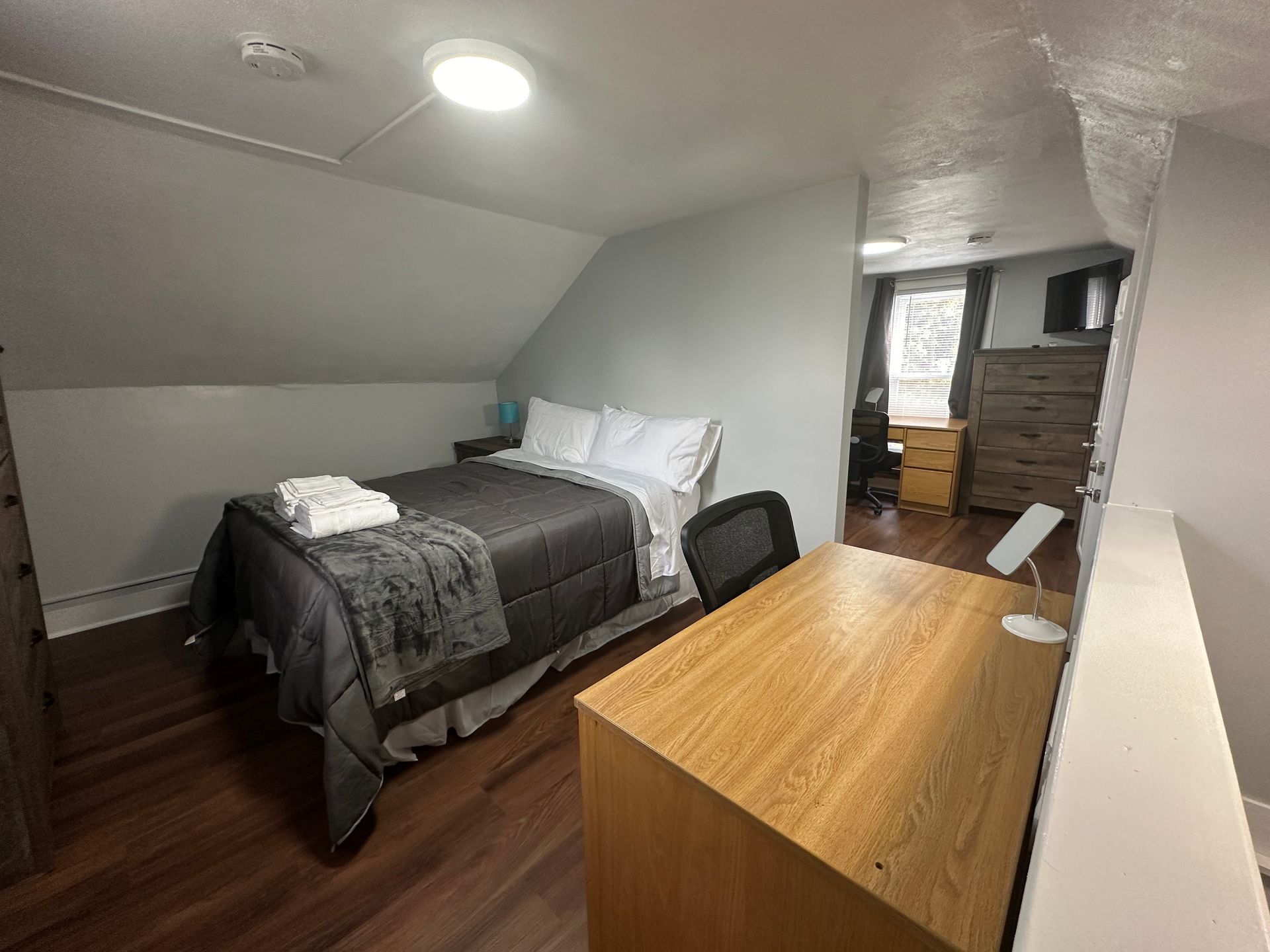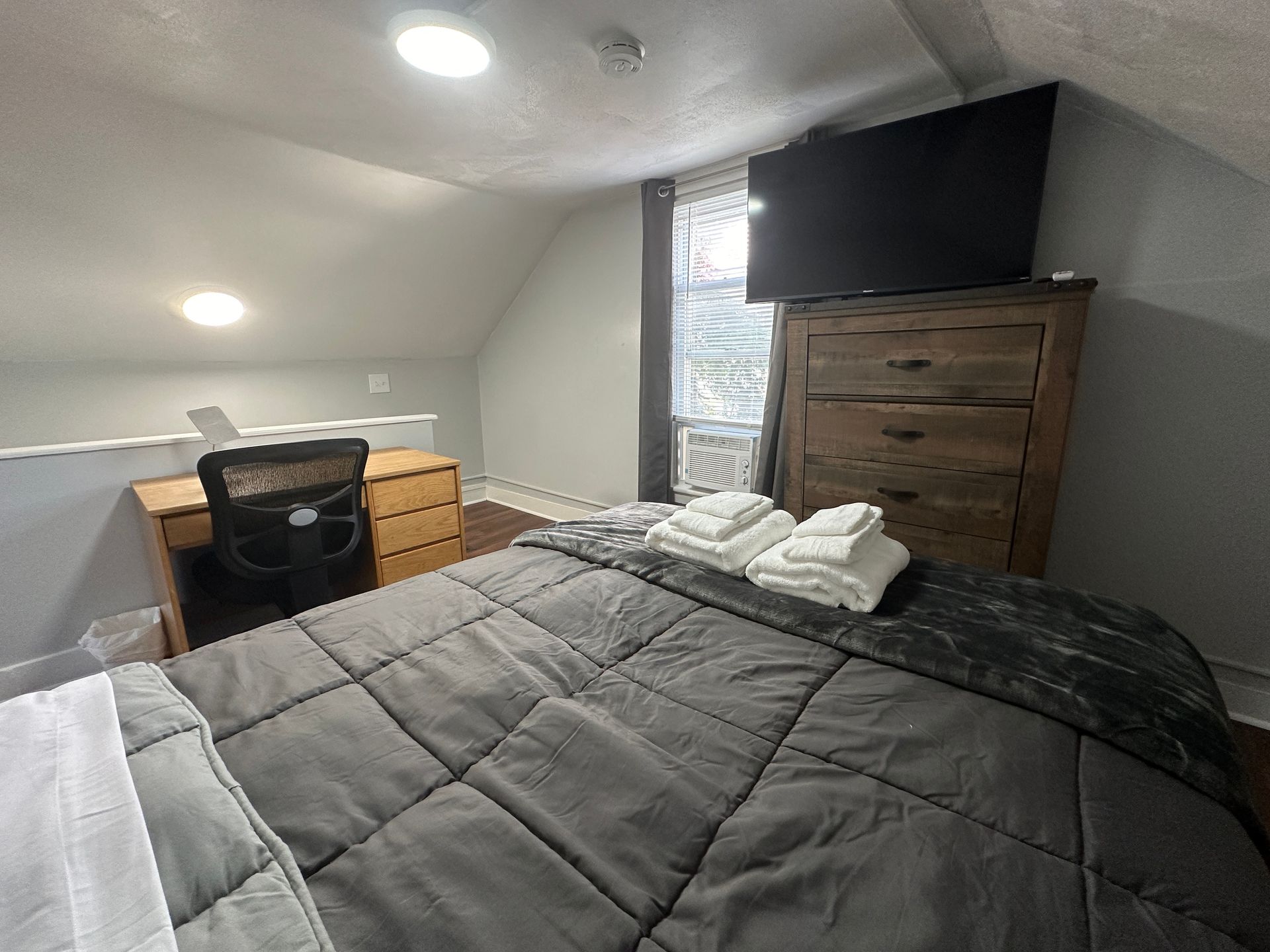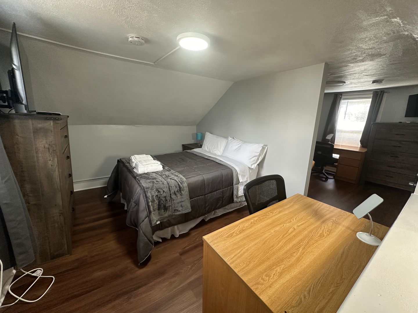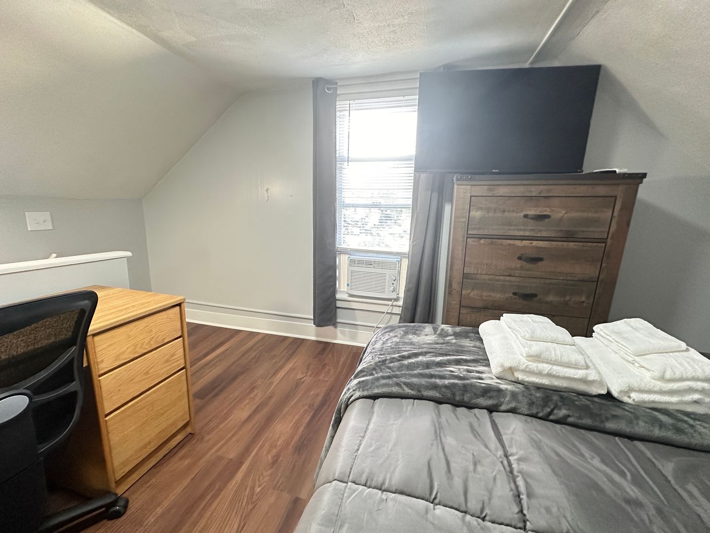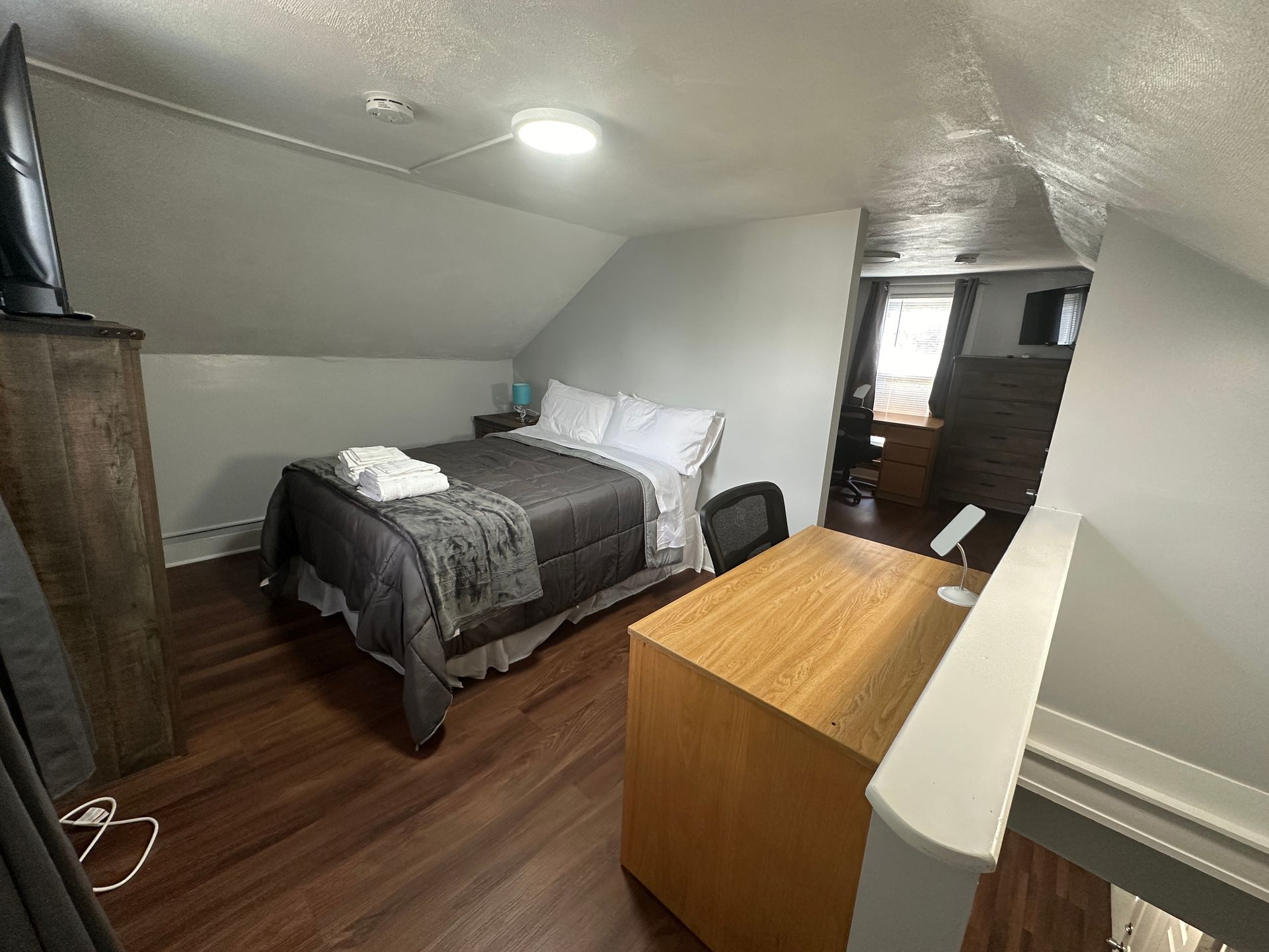 Welcome to this meticulously maintained, fully furnished single-family home, ideal for student living. Boasting two bedrooms with a total of three beds, including a smaller ground floor bedroom and a spacious loft featuring two sets of bedroom furniture. Amenities such as on-site laundry ensure convenience, while the front porch and yard provide ample space for outdoor activities. With plenty of off-street parking available, this residence is strategically situated close to campus and bus routes, offering easy access to downtown Main Street's vibrant array of restaurants and stores. The first floor comprises a well-equipped kitchen with abundant cabinets and a microwave, complemented by a living room featuring a couch, coffee and end tables, an entertainment center, and a 50" flat-screen TV. Additionally, a nicely sized full bathroom with a stand-up shower is conveniently located on the first floor, alongside one of the bedrooms. Upstairs, the loft houses two beds, both of which are nicely sized and furnished with newer furniture, including a 32"-50" TV, ensuring a comfortable and enjoyable living experience for students.