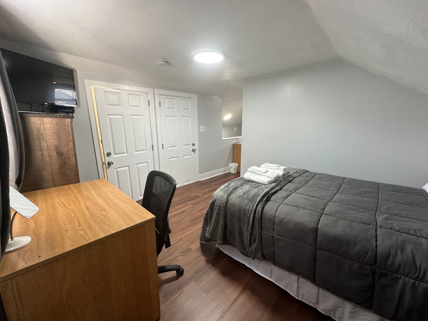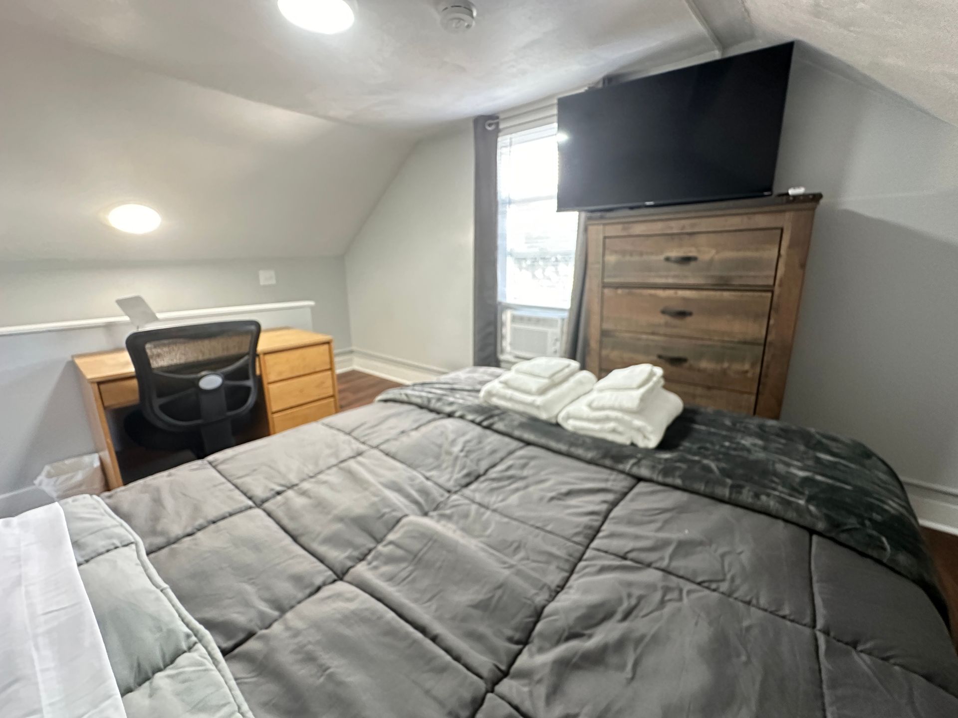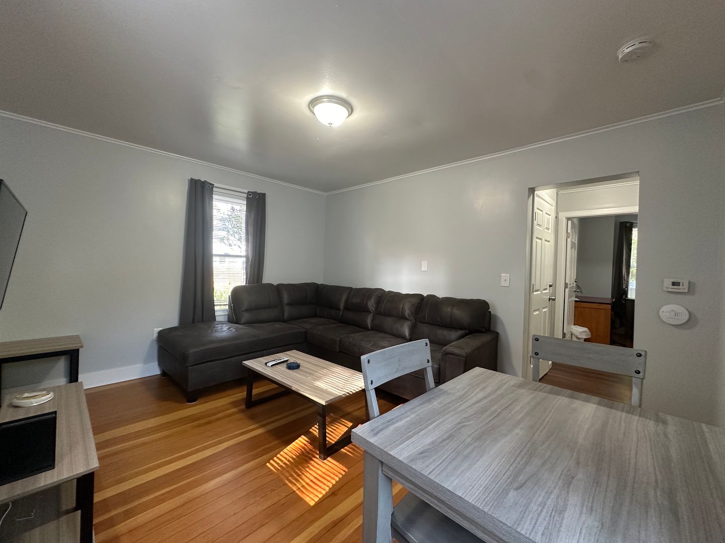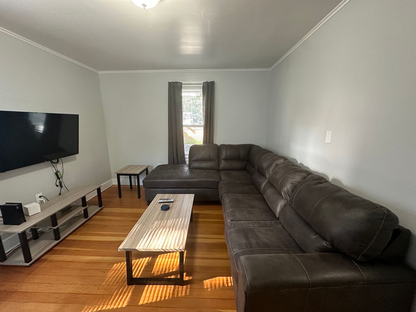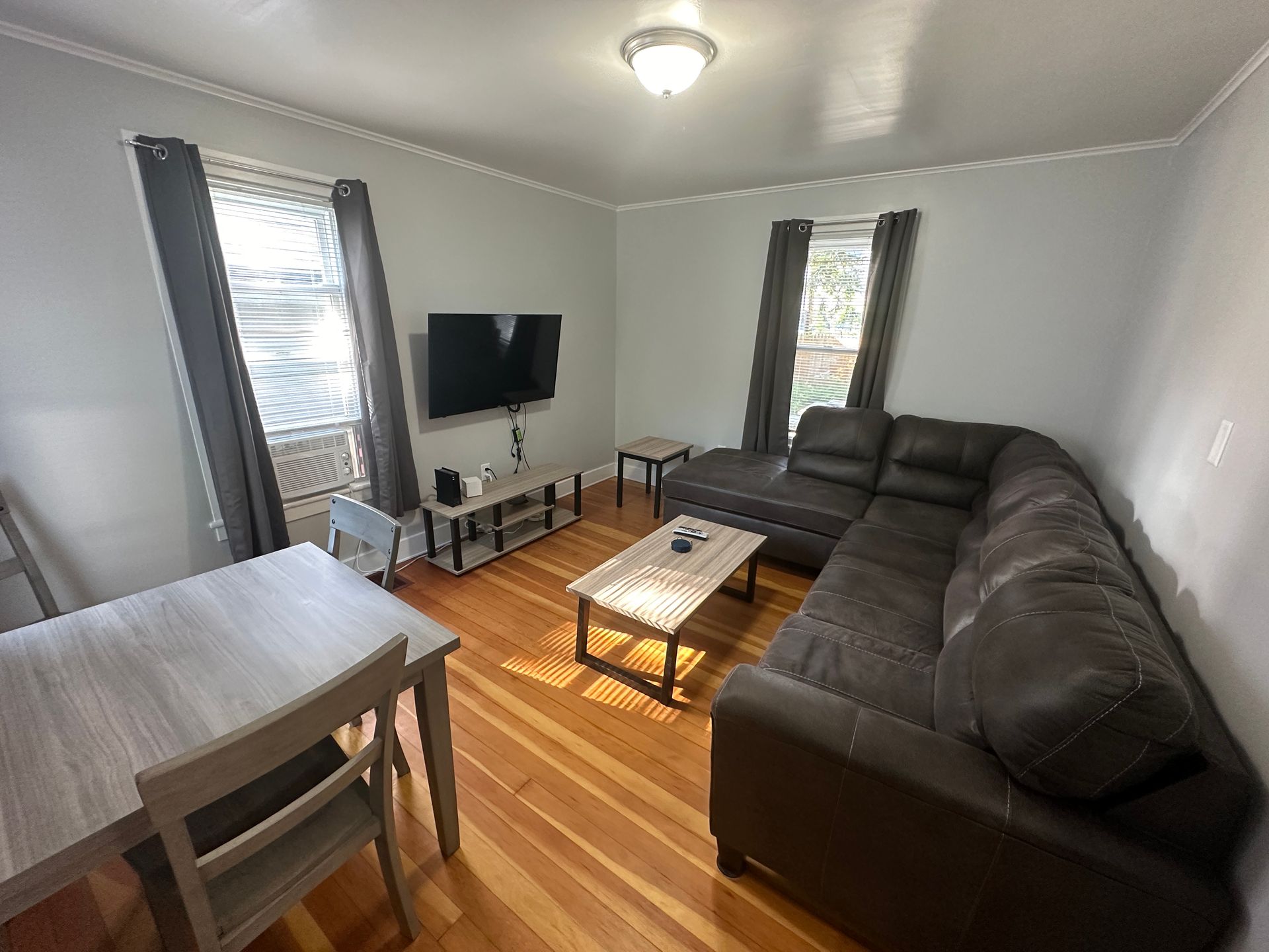 Welcome to this meticulously maintained, fully furnished single-family home, ideal for student living. Boasting two bedrooms with a total of three beds, including a smaller ground floor bedroom and a spacious loft featuring two sets of bedroom furniture. Amenities such as on-site laundry ensure convenience, while the front porch and yard provide ample space for outdoor activities. With plenty of off-street parking available, this residence is strategically situated close to campus and bus routes, offering easy access to downtown Main Street's vibrant array of restaurants and stores. The first floor comprises a well-equipped kitchen with abundant cabinets and a microwave, complemented by a living room featuring a couch, coffee and end tables, an entertainment center, and a 50" flat-screen TV. Additionally, a nicely sized full bathroom with a stand-up shower is conveniently located on the first floor, alongside one of the bedrooms. Upstairs, the loft houses two beds, both of which are nicely sized and furnished with newer furniture, including a 32"-50" TV, ensuring a comfortable and enjoyable living experience for students.