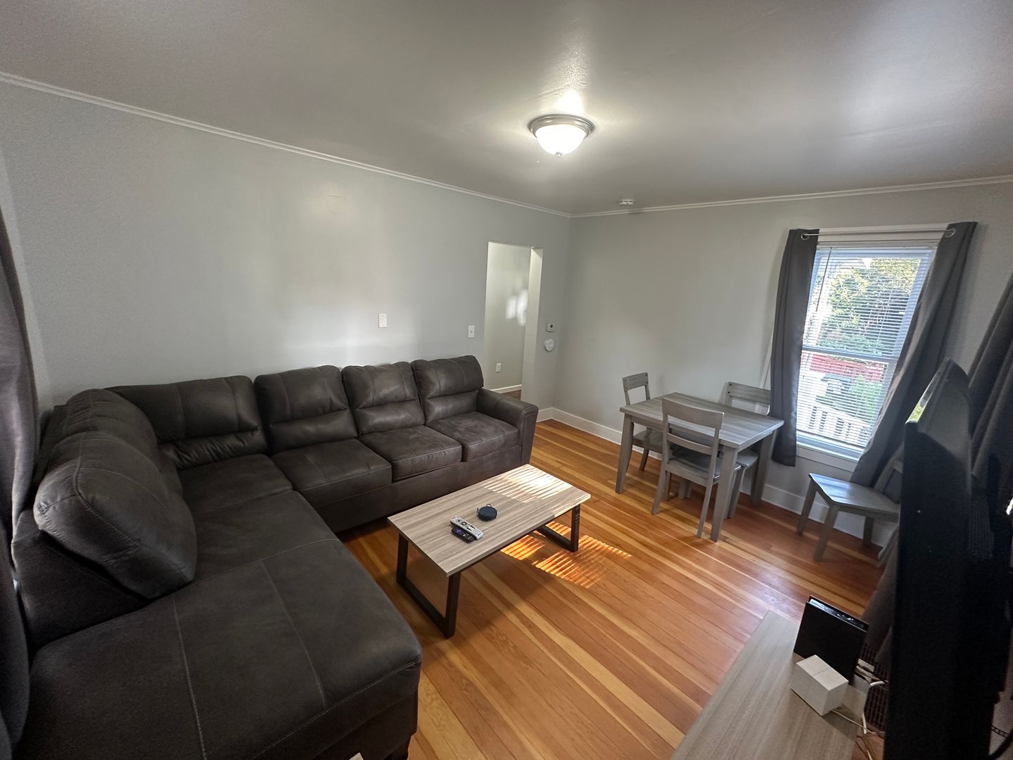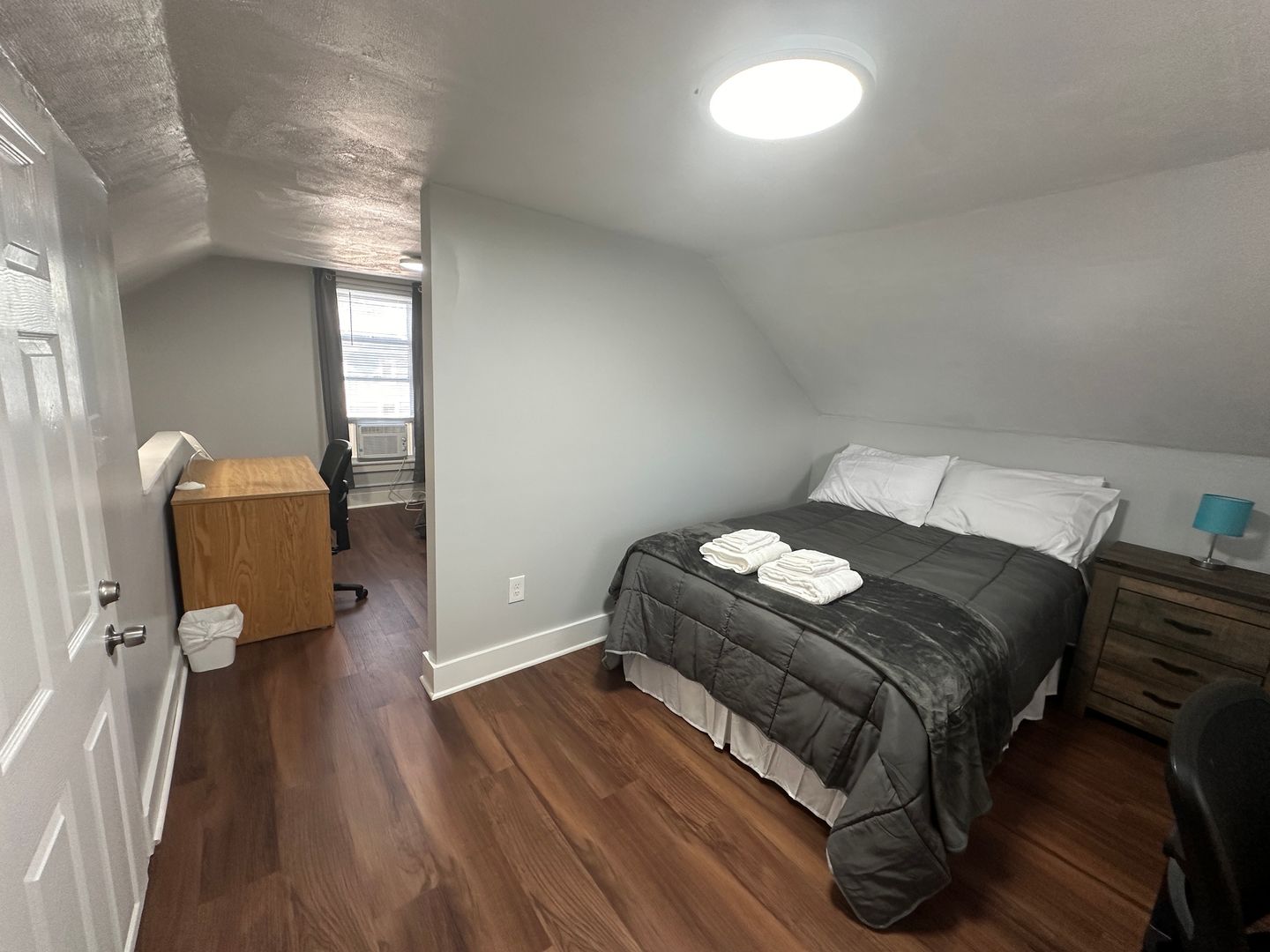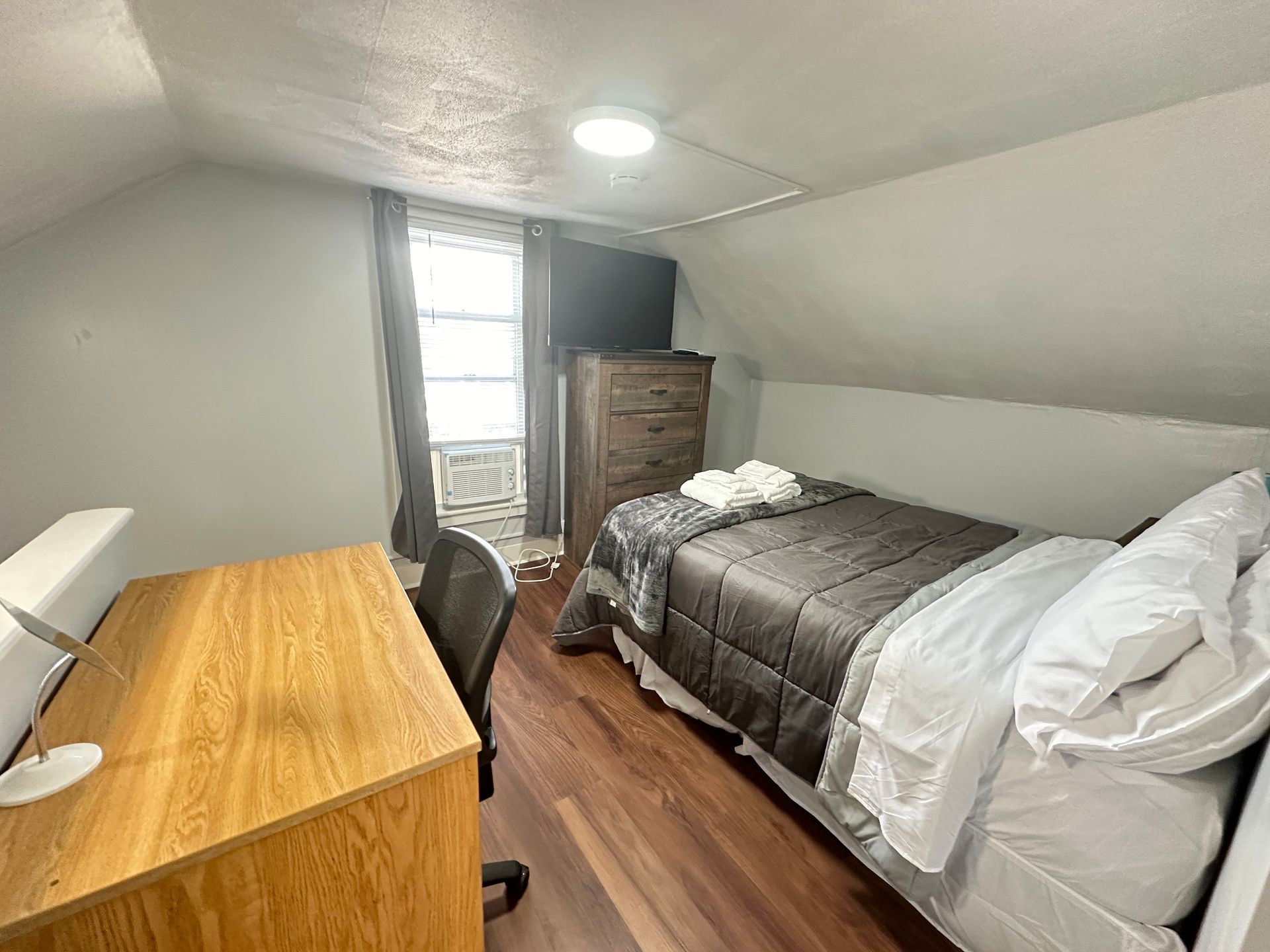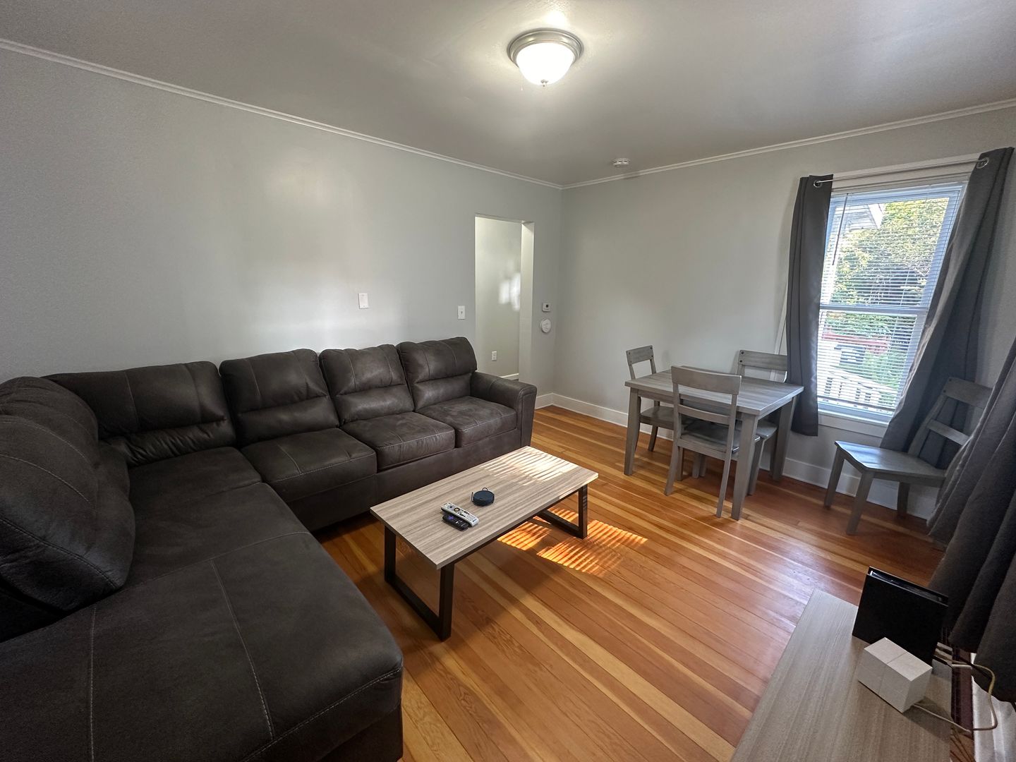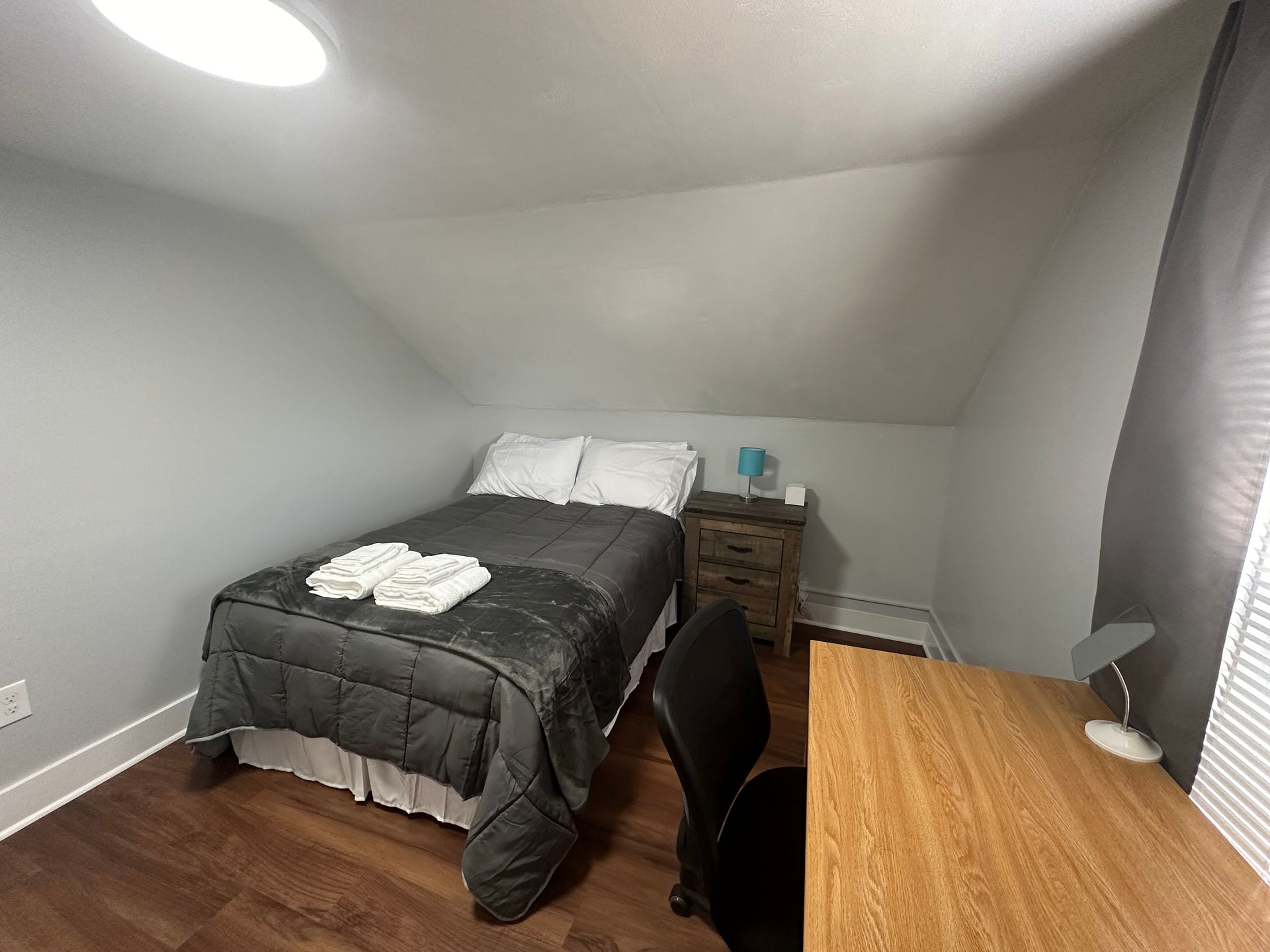 Welcome to this meticulously maintained, fully furnished single-family home, ideal for student living. Boasting two bedrooms with a total of three beds, including a smaller ground floor bedroom and a spacious loft featuring two sets of bedroom furniture. Amenities such as on-site laundry ensure convenience, while the front porch and yard provide ample space for outdoor activities. With plenty of off-street parking available, this residence is strategically situated close to campus and bus routes, offering easy access to downtown Main Street's vibrant array of restaurants and stores. The first floor comprises a well-equipped kitchen with abundant cabinets and a microwave, complemented by a living room featuring a couch, coffee and end tables, an entertainment center, and a 50" flat-screen TV. Additionally, a nicely sized full bathroom with a stand-up shower is conveniently located on the first floor, alongside one of the bedrooms. Upstairs, the loft houses two beds, both of which are nicely sized and furnished with newer furniture, including a 32"-50" TV, ensuring a comfortable and enjoyable living experience for students.
