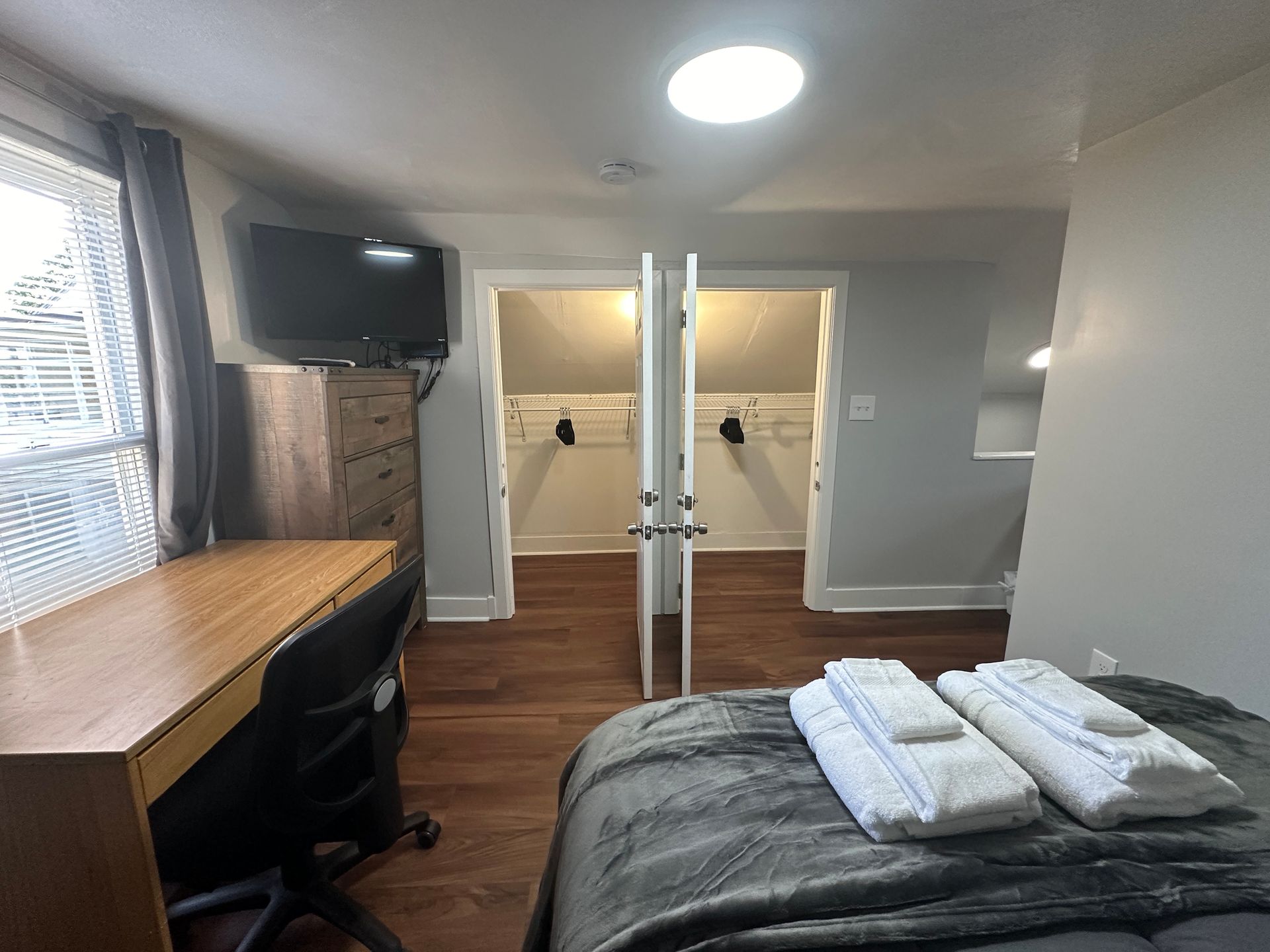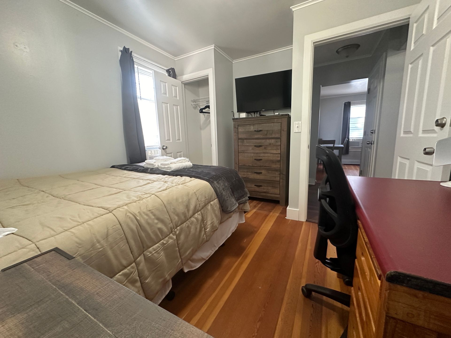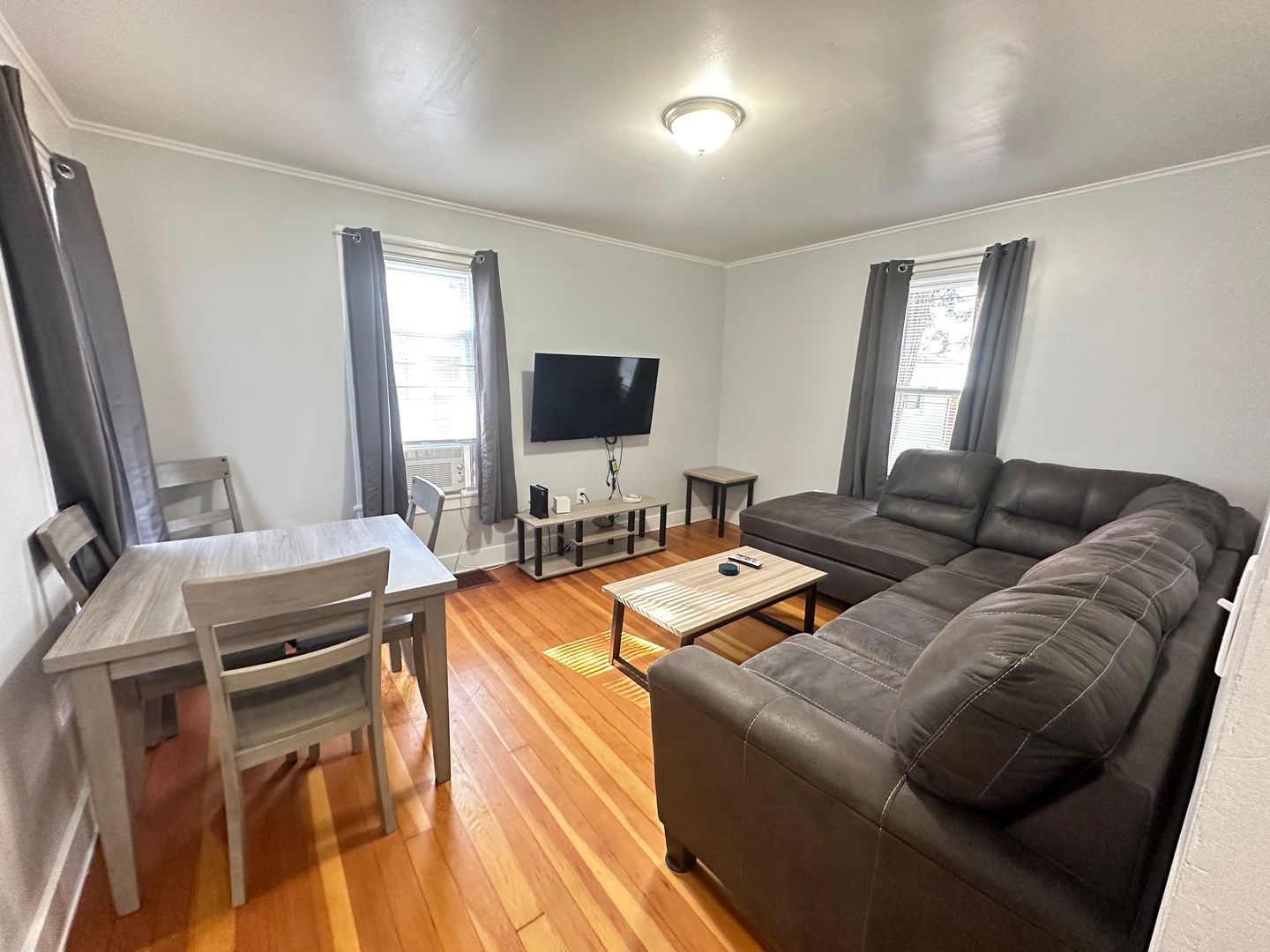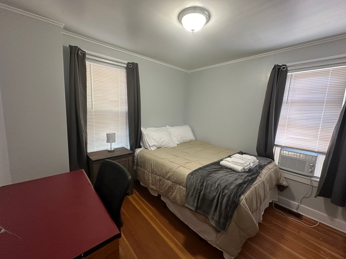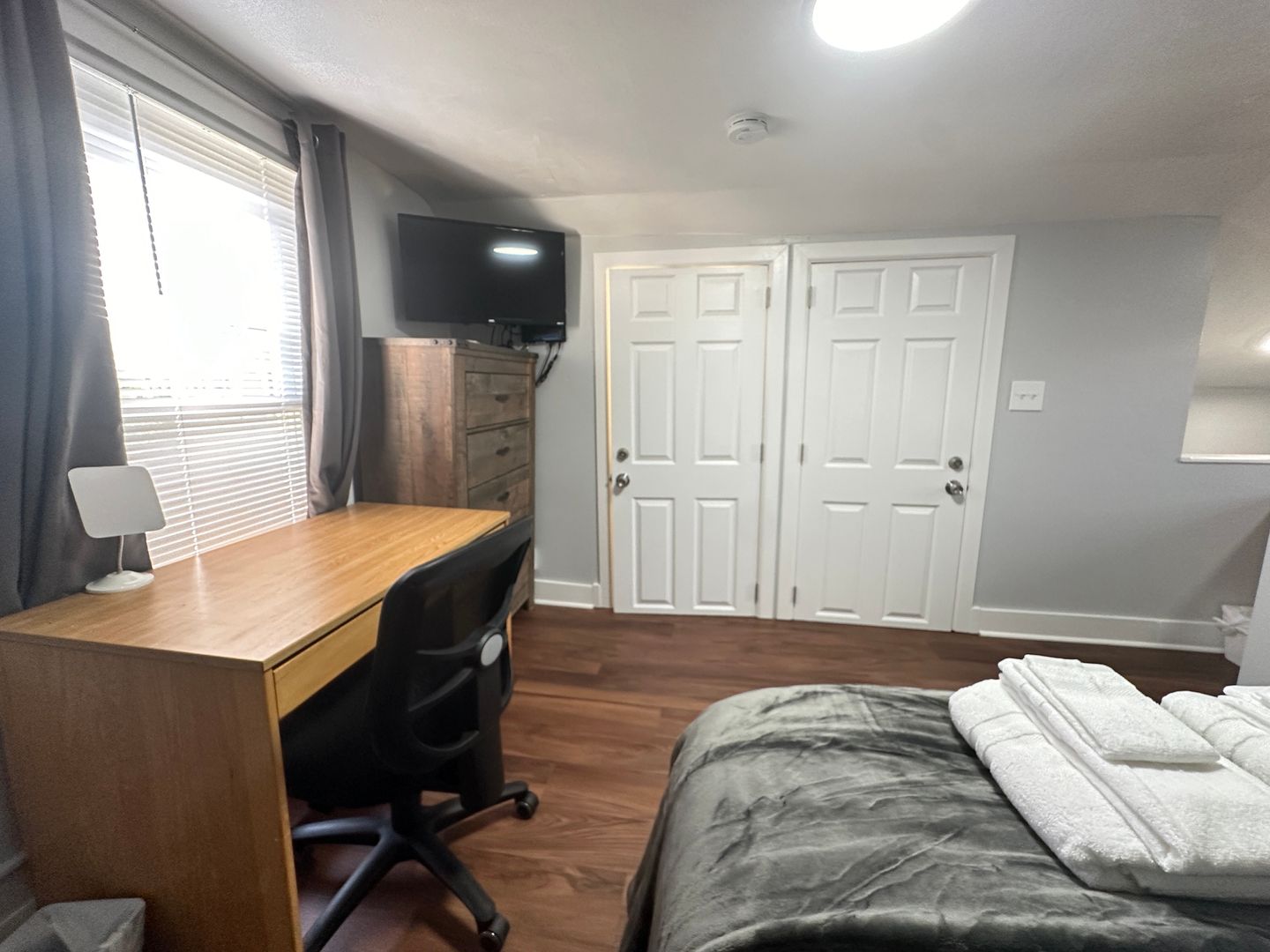 Welcome to this meticulously maintained, fully furnished single-family home, ideal for student living. Boasting two bedrooms with a total of three beds, including a smaller ground floor bedroom and a spacious loft featuring two sets of bedroom furniture. Amenities such as on-site laundry ensure convenience, while the front porch and yard provide ample space for outdoor activities. With plenty of off-street parking available, this residence is strategically situated close to campus and bus routes, offering easy access to downtown Main Street's vibrant array of restaurants and stores. The first floor comprises a well-equipped kitchen with abundant cabinets and a microwave, complemented by a living room featuring a couch, coffee and end tables, an entertainment center, and a 50" flat-screen TV. Additionally, a nicely sized full bathroom with a stand-up shower is conveniently located on the first floor, alongside one of the bedrooms. Upstairs, the loft houses two beds, both of which are nicely sized and furnished with newer furniture, including a 32"-50" TV, ensuring a comfortable and enjoyable living experience for students.