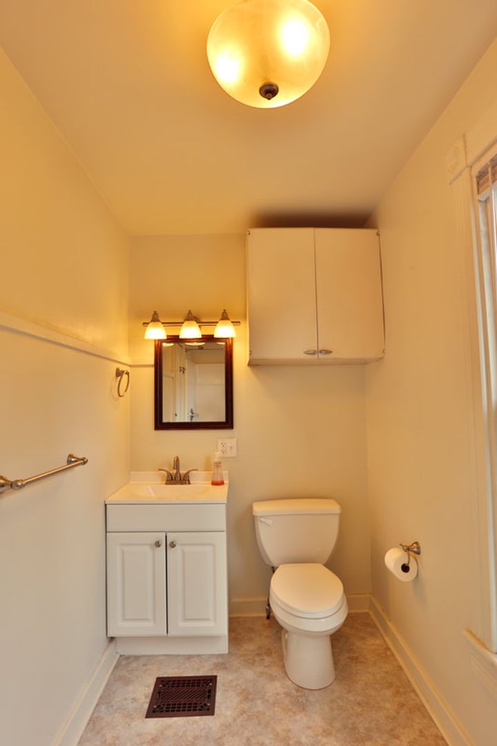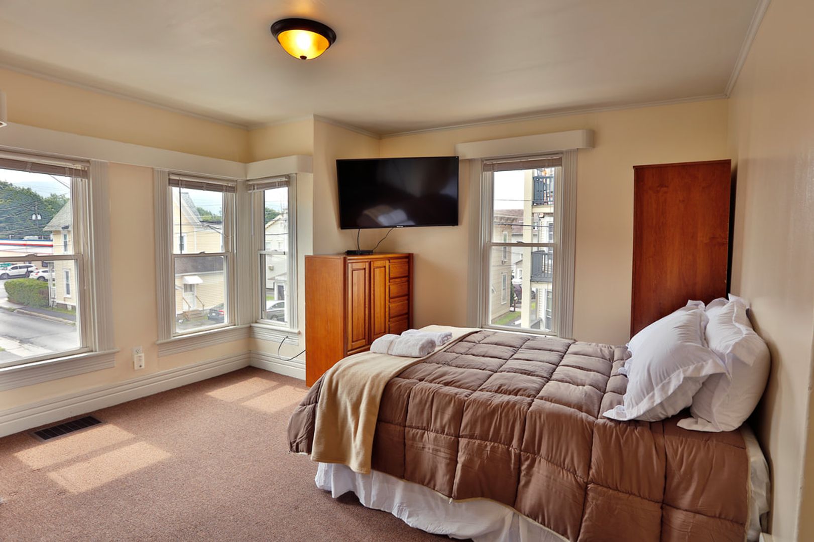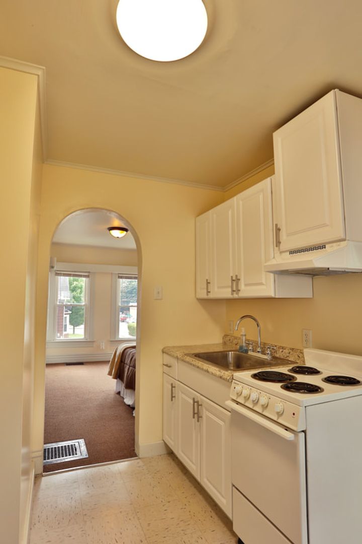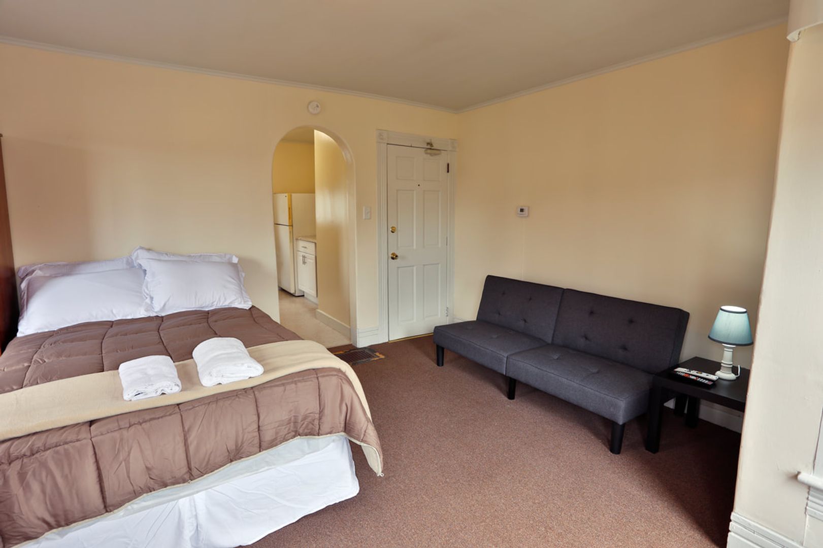 Welcome to the fully carpeted studio apartment located on the second floor. This cozy space features an eat-in kitchen equipped with a microwave and a table with chairs, providing a comfortable dining area. The full bathroom includes a convenient walk-in shower for added comfort. In the living room/bedroom area, you'll find a versatile futon, a coffee and end table, a closet armoire, and a 32"-50" TV for entertainment needs. Enjoy the convenience of off-street parking and a short walk to downtown Main Street, restaurants, and stores. Nearby amenities include Dunkin Donuts just across the street, making dining options easily accessible. Close proximity to bus routes and colleges adds to the convenience of this prime location, offering a comfortable and convenient living experience.