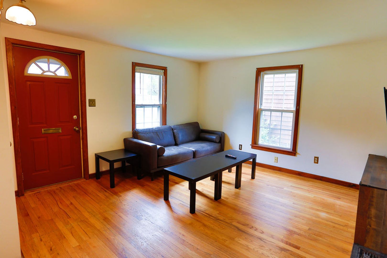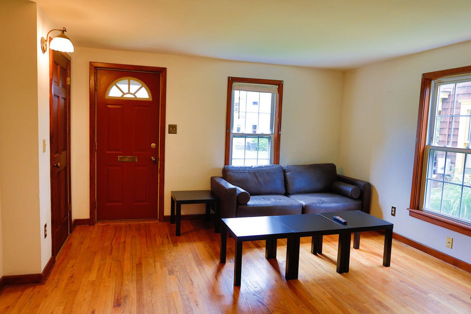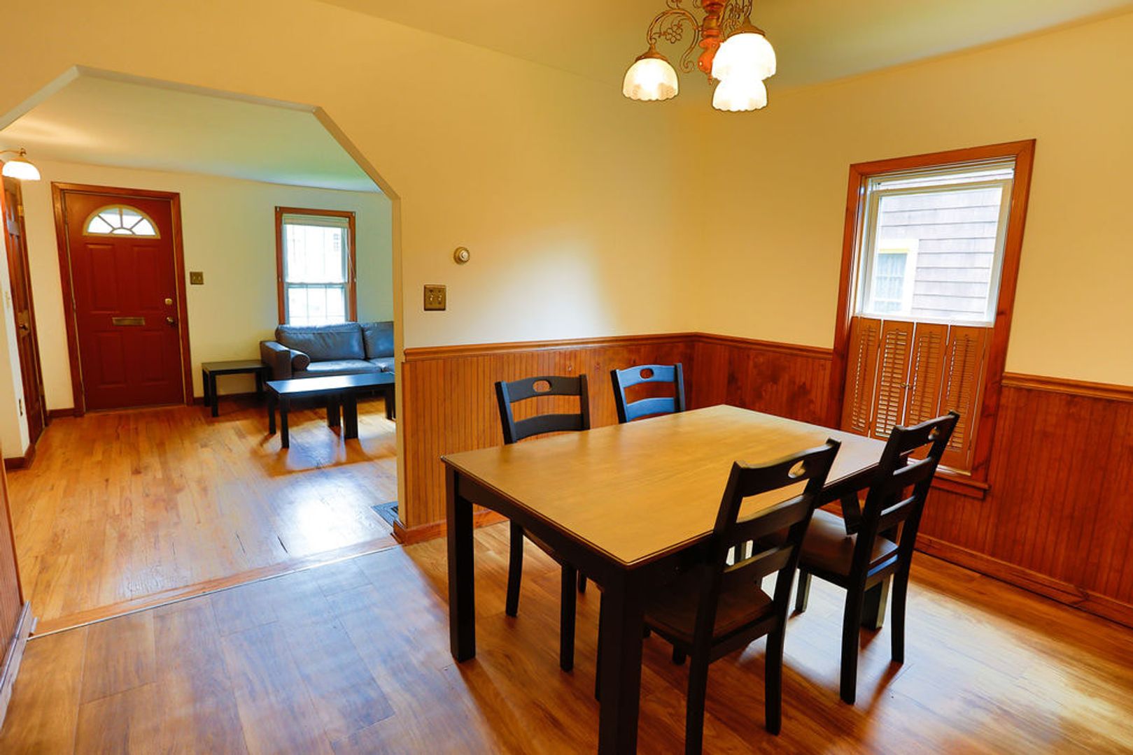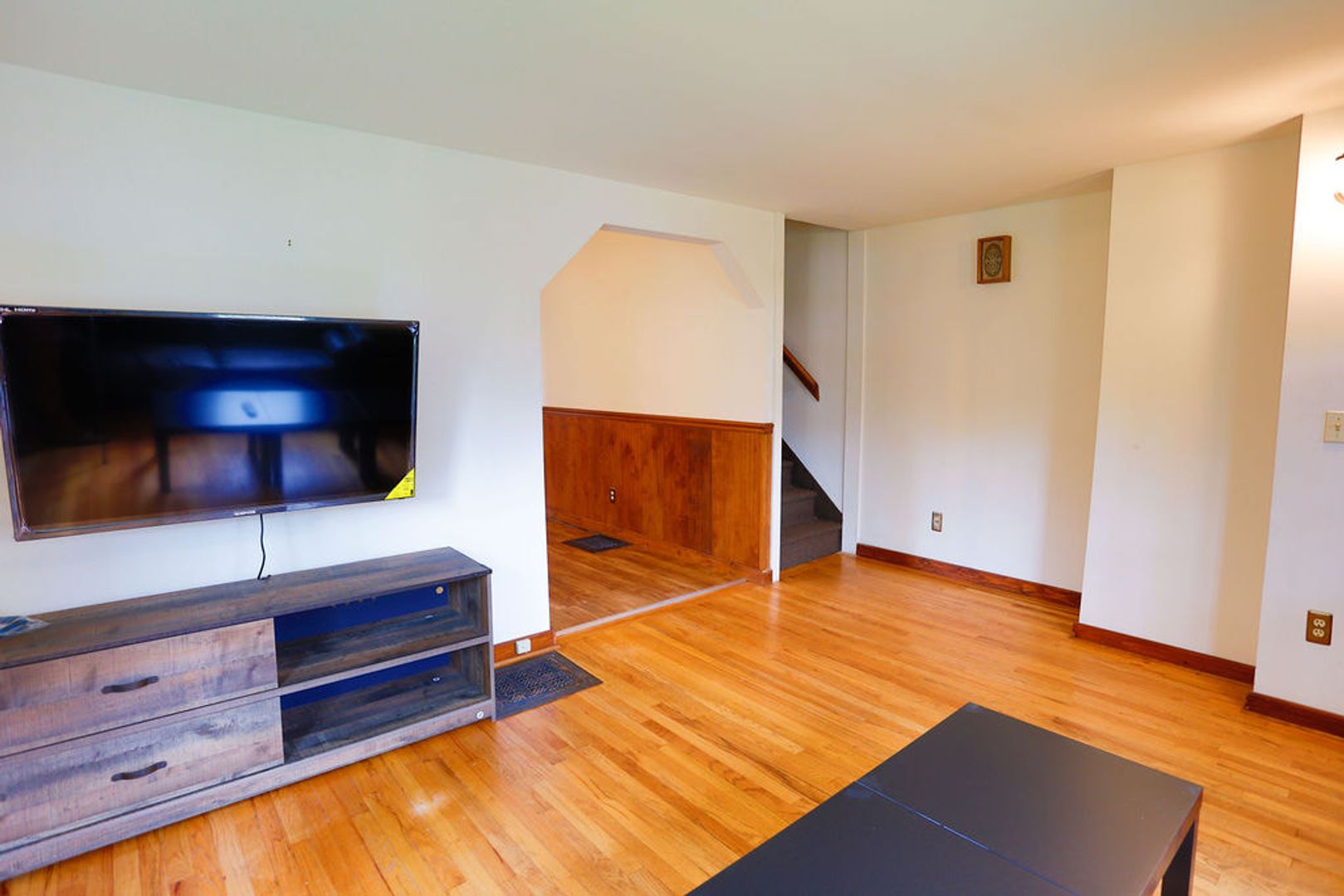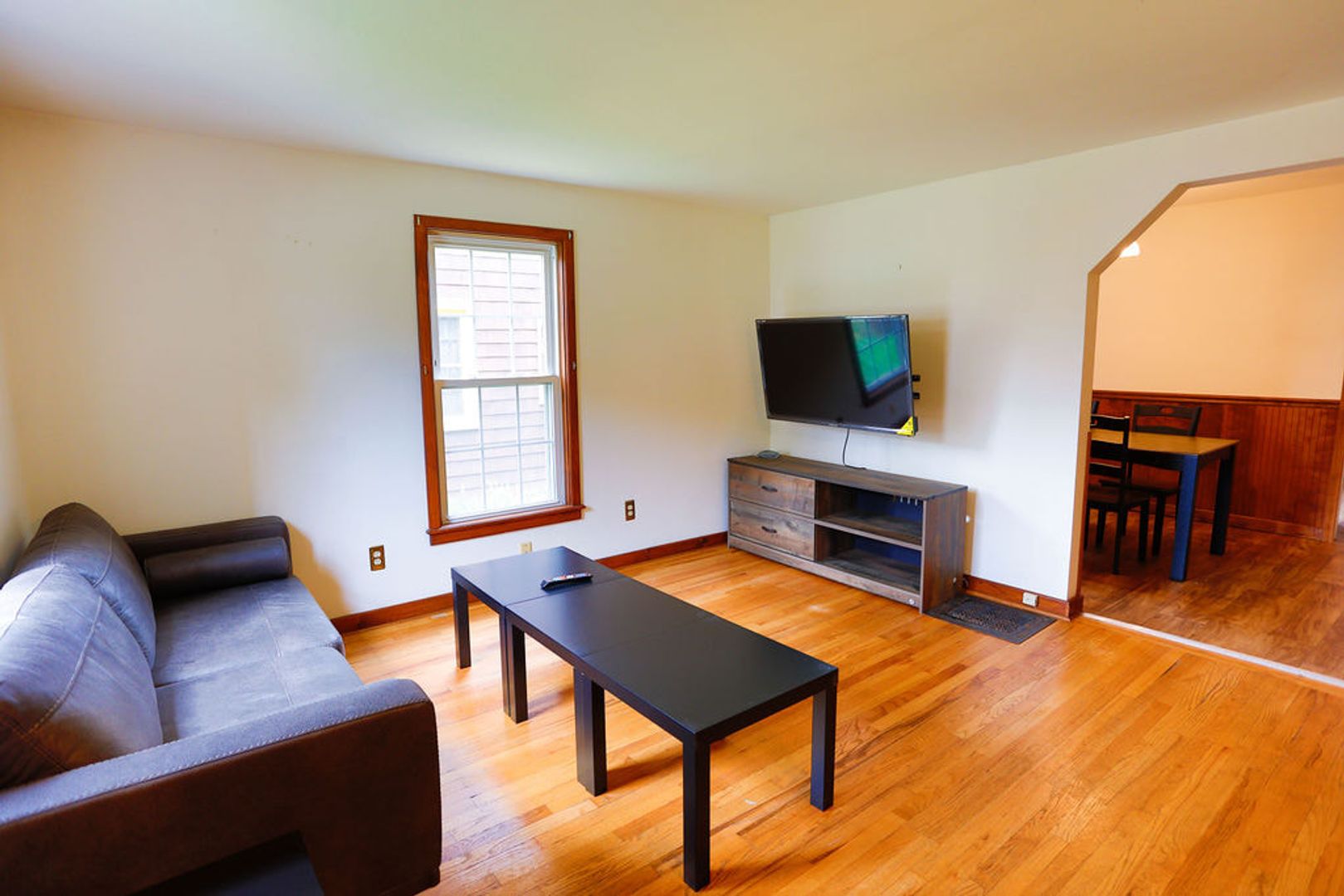 Centrally situated, this two-bedroom apartment offers comfort and convenience for residents. The first floor boasts inviting wood floors and an eat-in kitchen equipped with ample cabinets, a dishwasher, microwave, and a dining table set. A half bathroom, inclusive of a washer and dryer, enhances practicality. The spacious living room features two cozy couches, coffee and end tables, an entertainment center, and a 50" flat screen TV for relaxation and entertainment. Upstairs, a full bathroom with a combination tub and shower caters to residents' needs. The carpeted bedrooms, adorned with newer furniture and each fitted with a 32"-50" TV, offer a cozy retreat. Positioned just a short stroll from downtown Main Street, restaurants, stores, and bus routes, this apartment presents an ideal blend of convenience and comfort. Whether opting to rent individually or securing the entire house with friends, this property offers versatile living options.