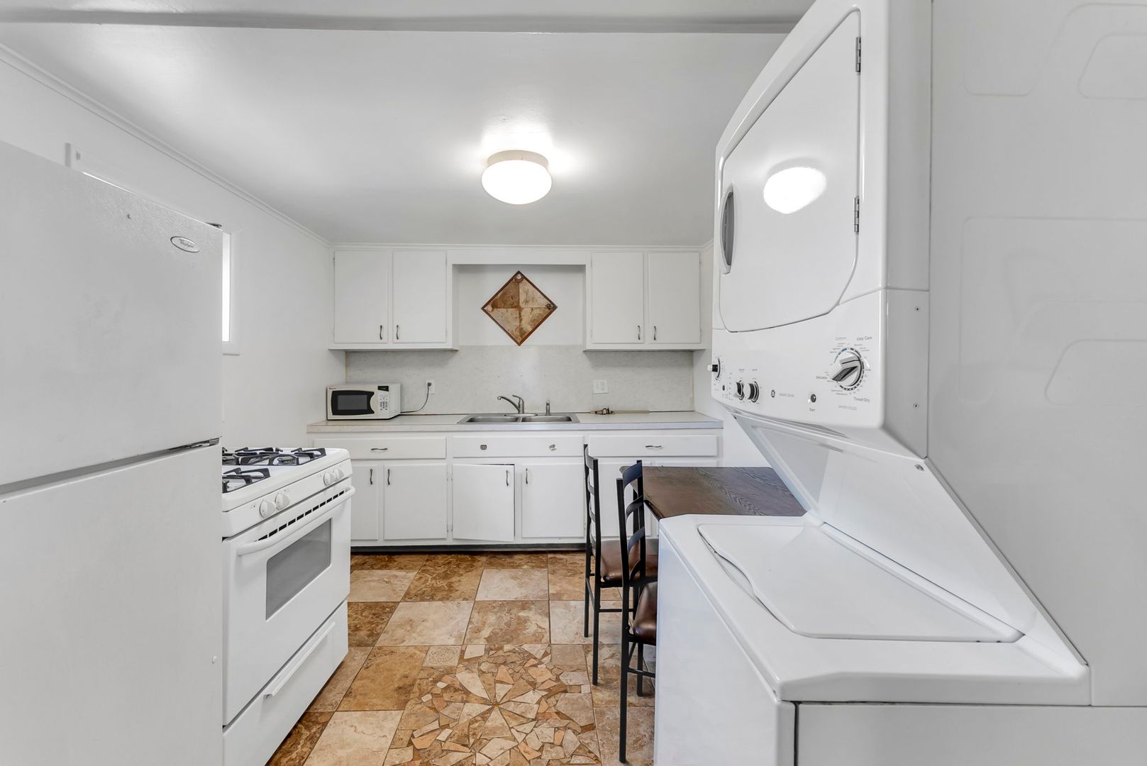 This second-floor one-bedroom apartment offers a comfortable and well-equipped living space. The kitchen is furnished with a microwave, washer, and dryer, providing convenience for residents. In the dining area, there's a table with chairs for enjoying meals or working from home.