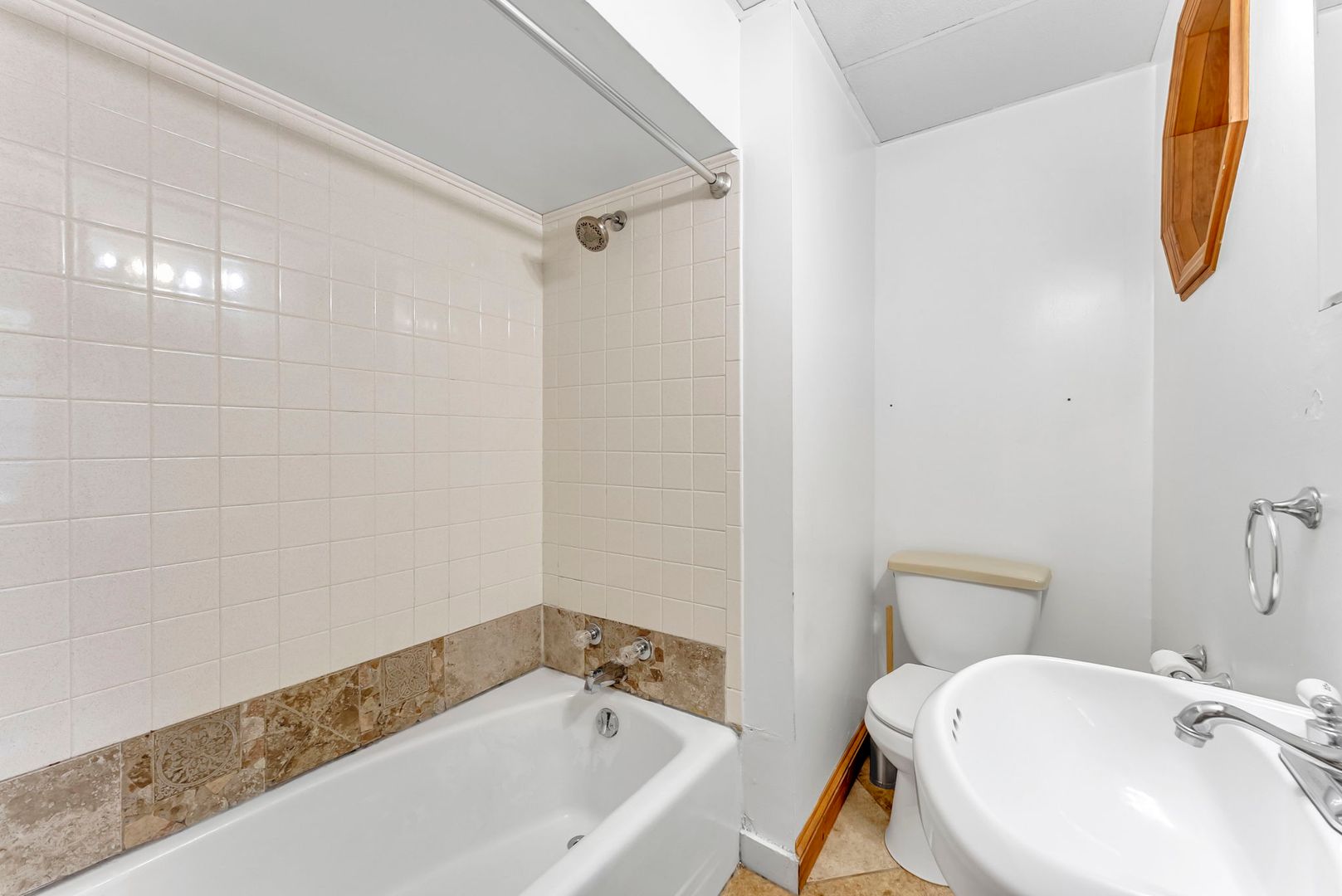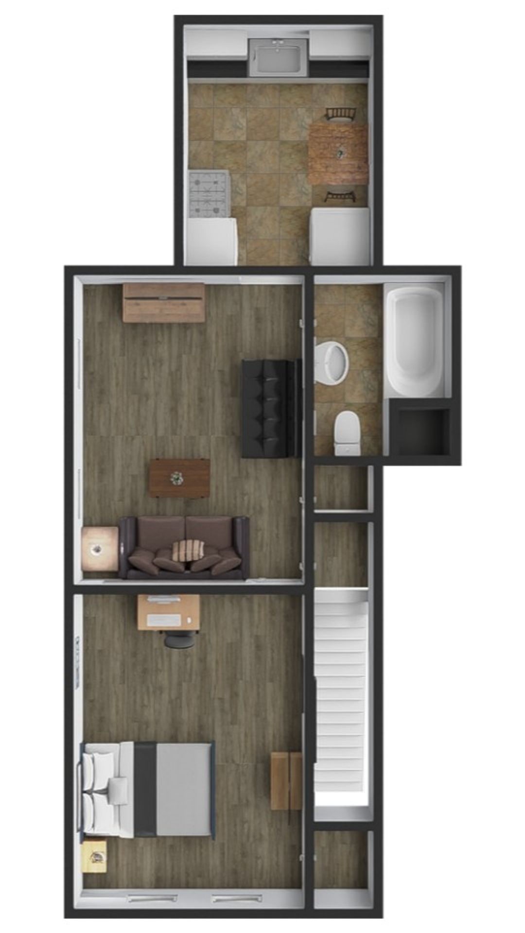 The spacious living room is tastefully furnished with a couch, coffee and end tables, an entertainment center, and a large 50" flat-screen TV, creating an inviting space for relaxation and entertainment. A full bathroom with a combination tub and shower serves the apartment, meeting residents' bathing needs. The nicely sized bedroom features newer furniture, including a 32"-50" TV, offering a comfortable and private retreat.