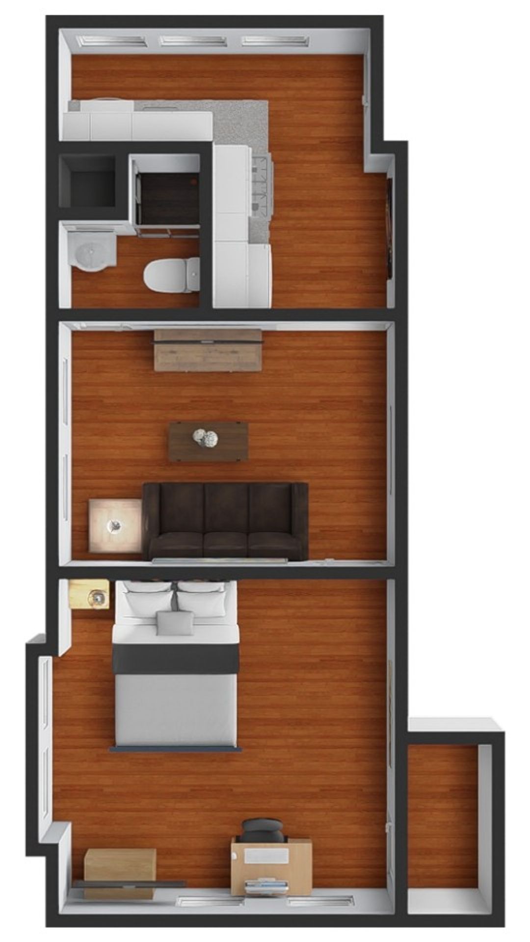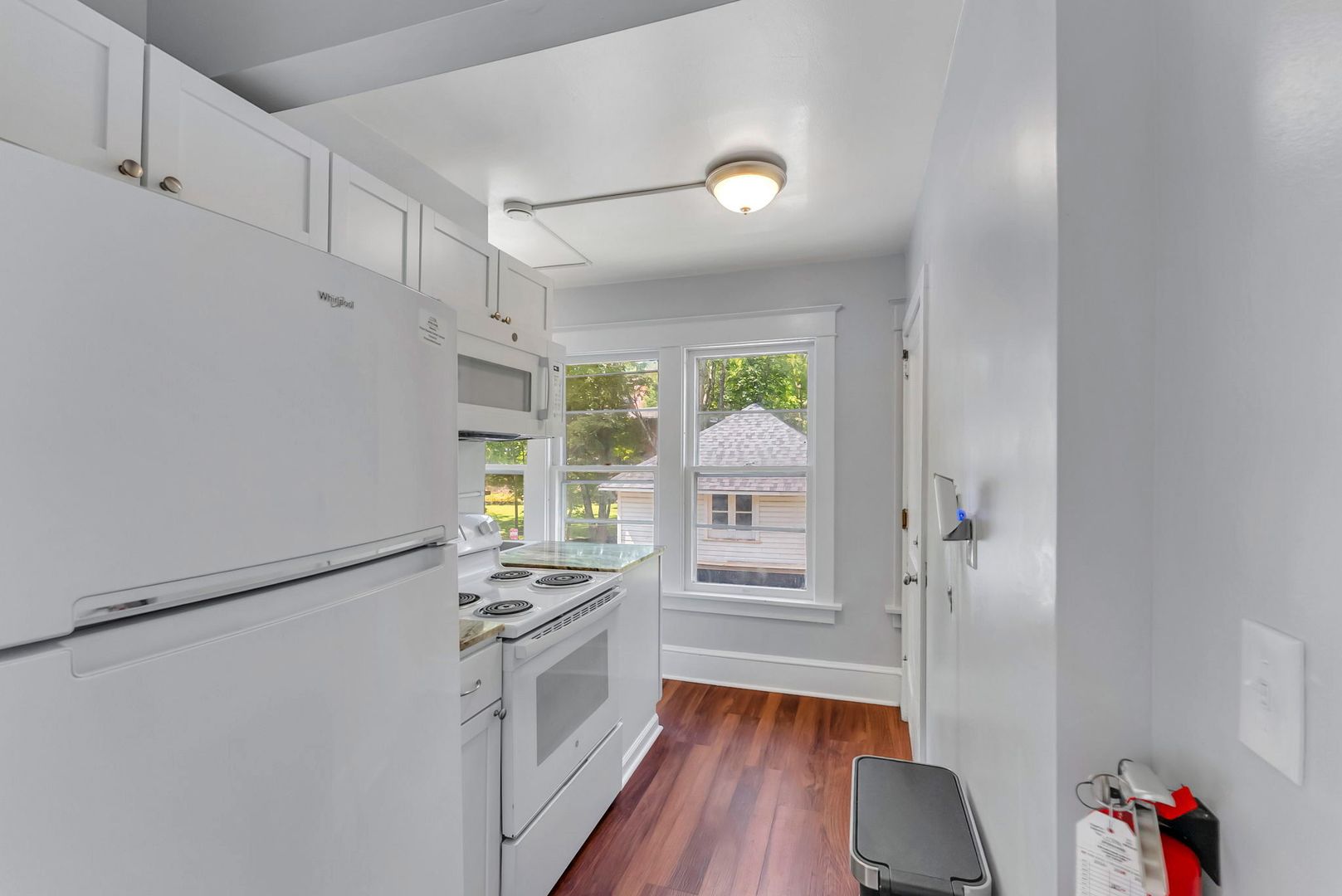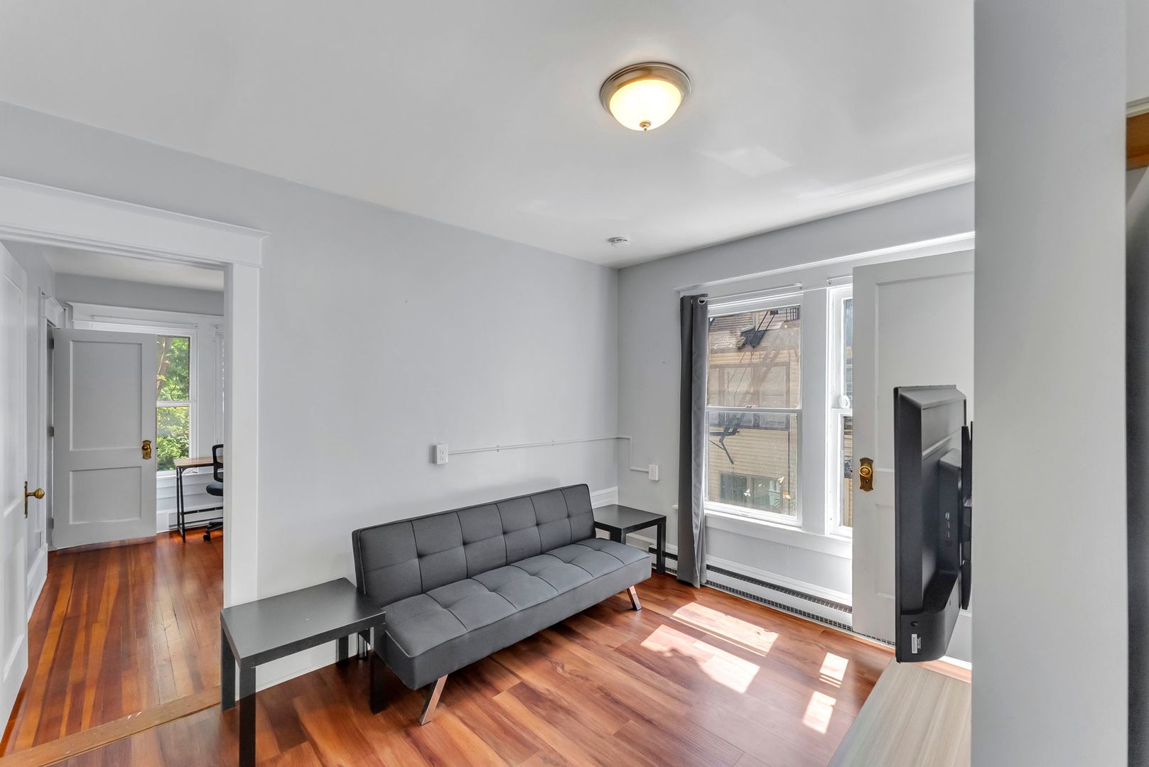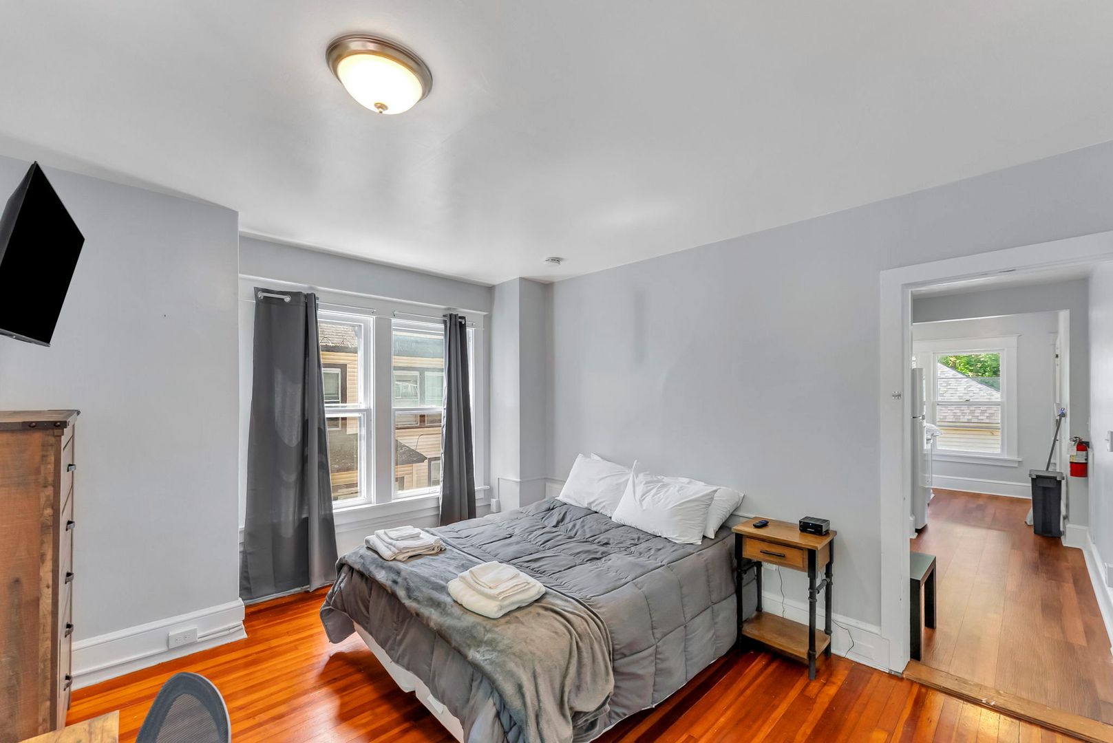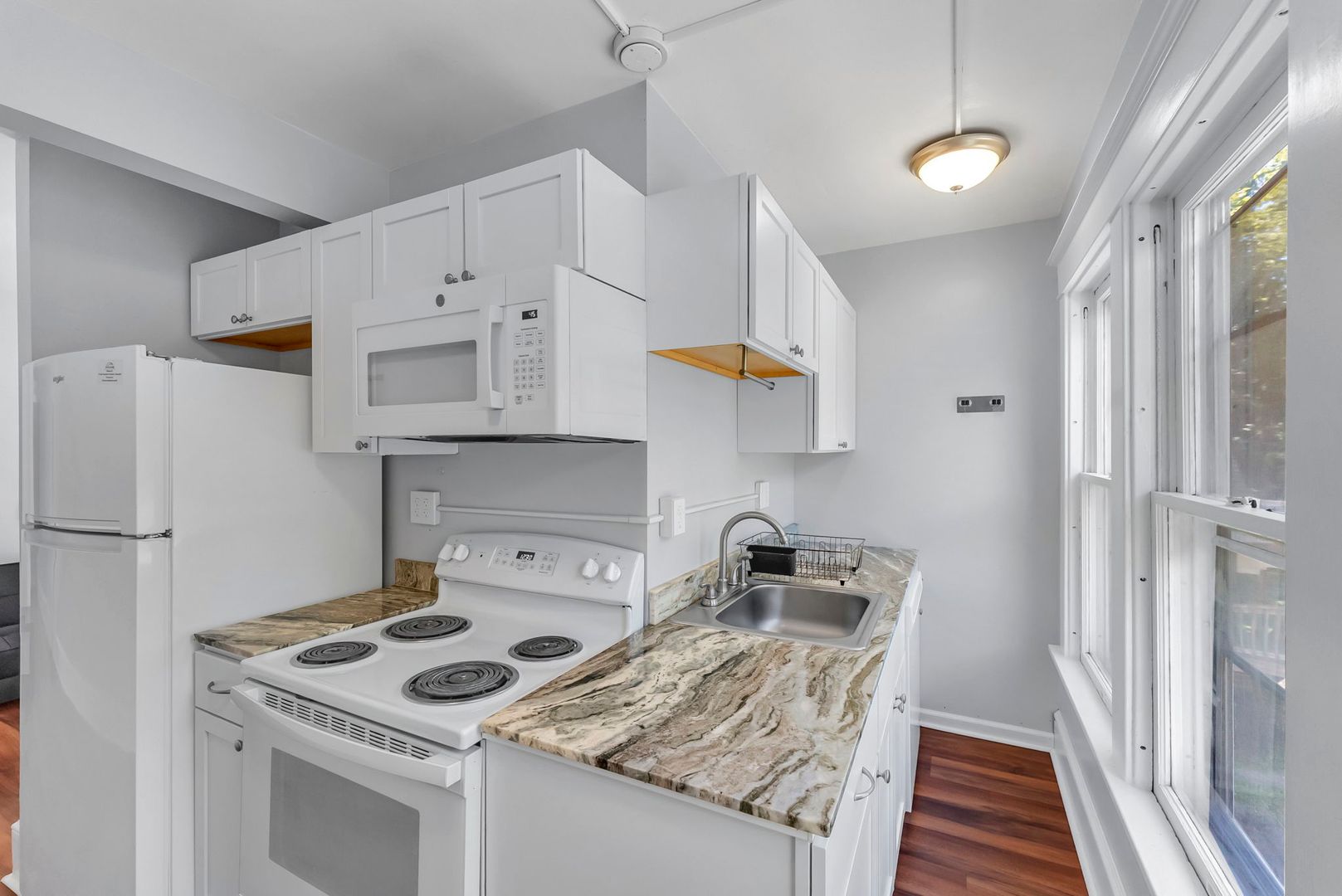 This one bedroom apartment features vinyl plank floors throughout, newly renovated kitchen with a dishwasher and microwave. The living room has a couch, coffee and end tables, entertainment center, and a 40" flat screen TV! There is a full bathroom with a walk in shower. The nicely sized bedroom has newer furniture including a 40" TV, dresser, desk, office chair, nightstand, and full size bed (mattress/box spring/frame).